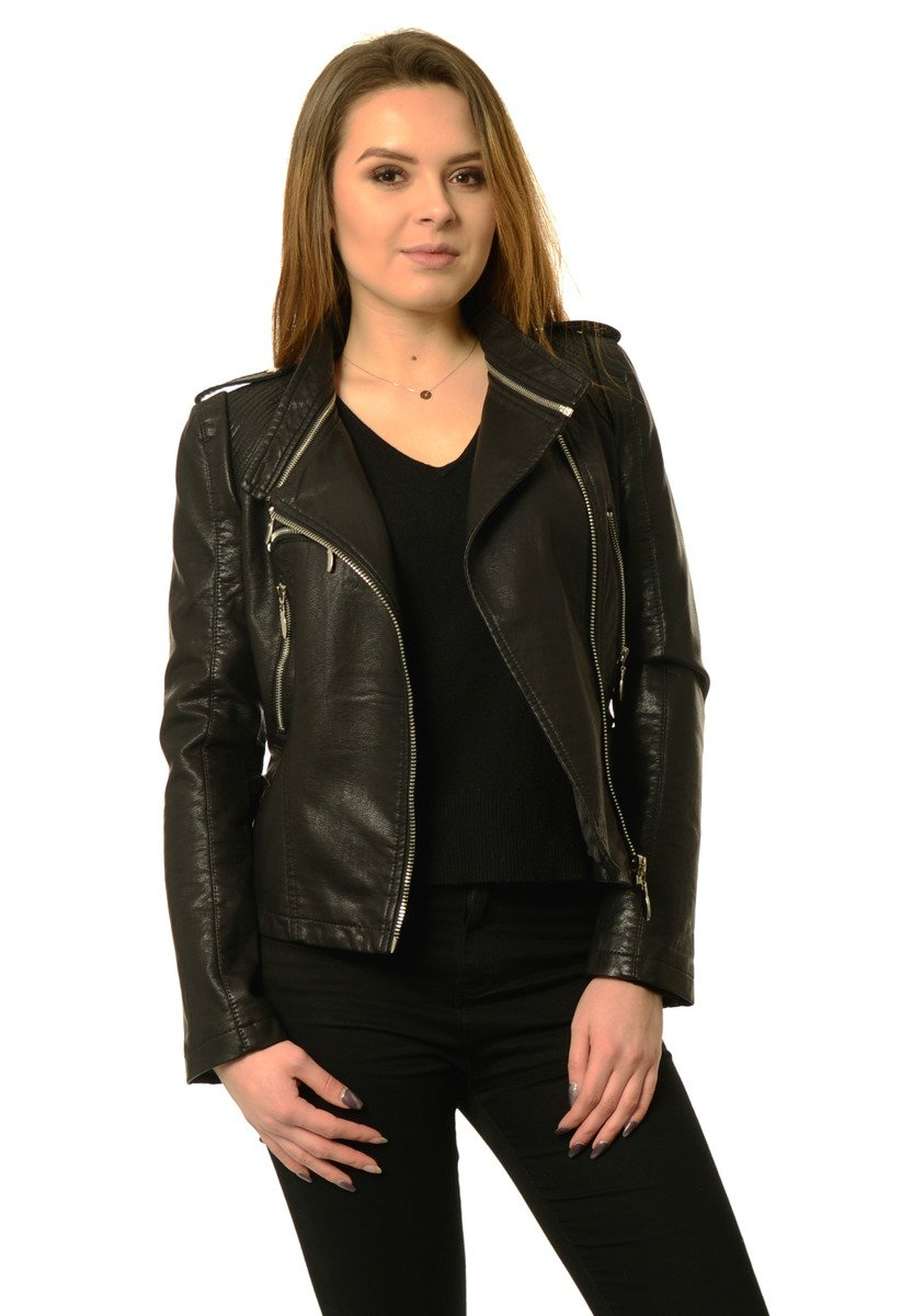 Najmodniejsza w tym sezonie damska kurtka ramoneska w kolorze czarnym. Ramoneska zapinana na ukośny suwak w kolorze srebrnym. Kurtka jest wykonana z wysokogatunkowej eko skóry. Ramoneska posiada atrapy kieszeni na dole oraz na piersiach. W mankietach kurtki znajdują się zaszewki zapinane na suwak. Suwaki i napy ramoneski w kolorze srebrnym. Stójka kurtki ozdobiona jest suwakiem, dzięki czemu można opiąć ją całkowicie. Pagony na ramionach. Ramoneska idealnie sprawdzi się jako kurtka na chłodniejsze wiosenne dni.
