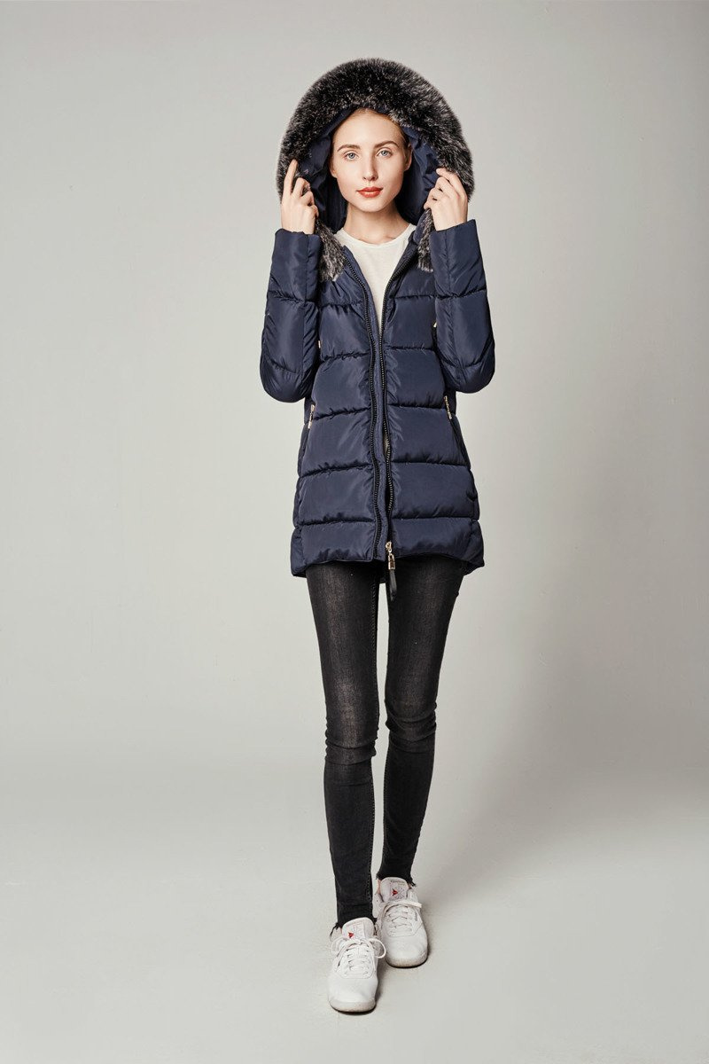 Rewelacyjna kurtka damska w kolorze granatowym. Ciepłe wypełnienie kurtki zapewnia ciepło w mroźne dni. Kurtka w środku wykończona jest podszewką. Kurtka zapinana jest na suwak w kolorze czarnym. Delikatnie rozszerzany fason kurtki idealnie dopasowuję się do każdej kobiecej sylwetki. Kurtka posiada z przodu dwie kieszenie. Nieodpinany kaptur ze ściągaczem zapewnia ciepło w wietrzne zimowe dni. Futerko przy kapturze jest odpinane. Kurtka posiada ozdobne elementy w kolorze złotym. Tył kurtki jest dłuży o ok. 6cm. Kurtka wykonana jest z materiałów najwyższej jakości. Kurtka ocieplona jest bardzo wysokiej jakości wypełnieniem syntetycznym, które zapewnia doskonałą termoizolację oraz wysoki komfort użytkowania.