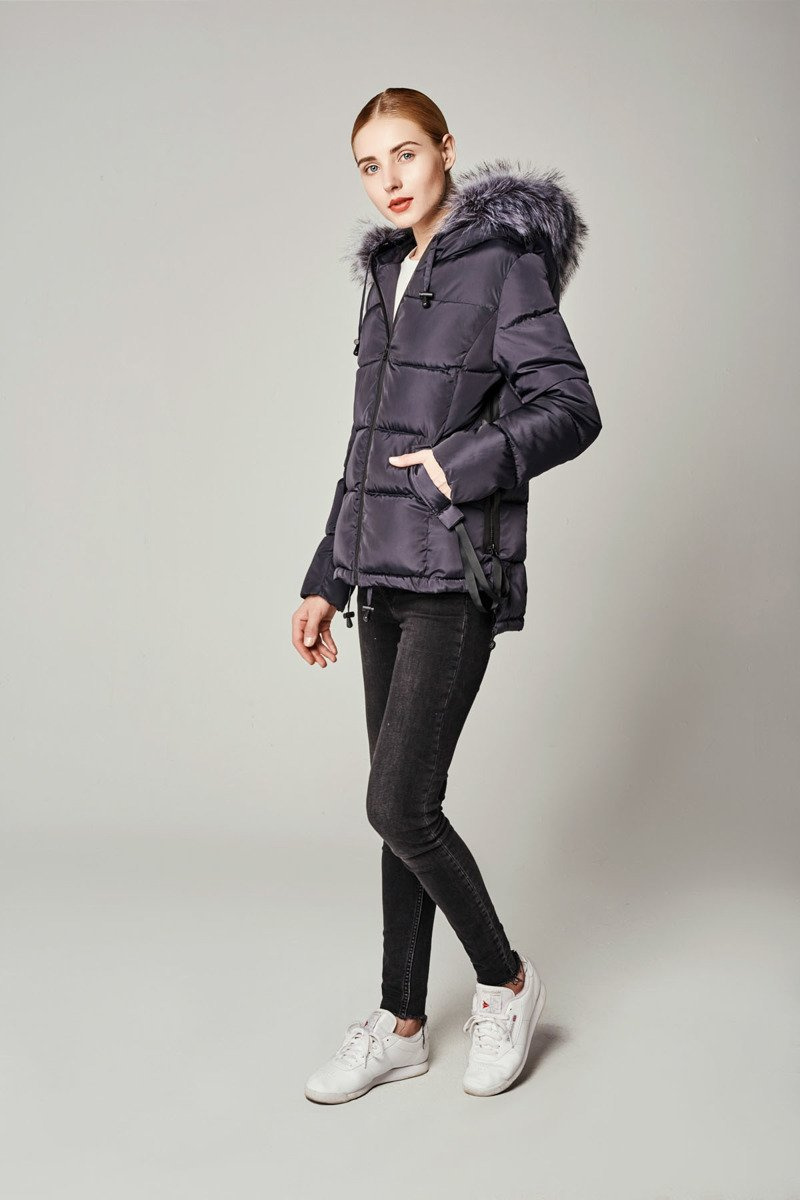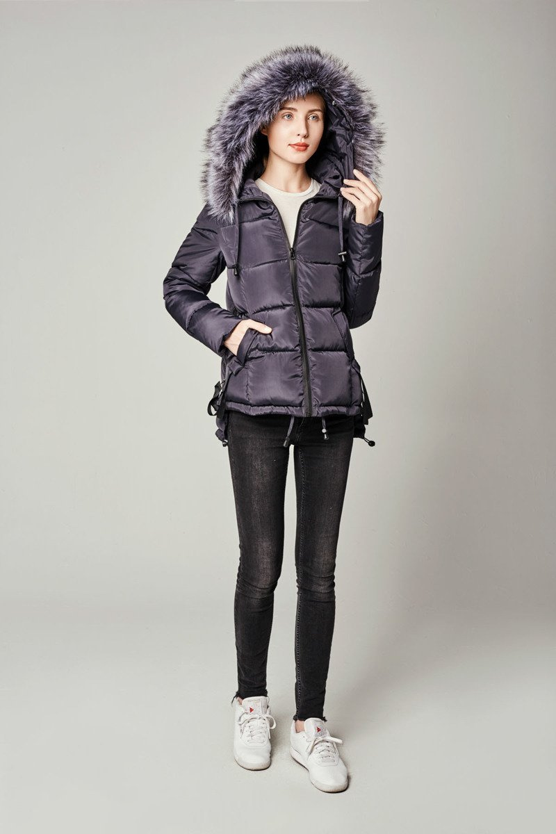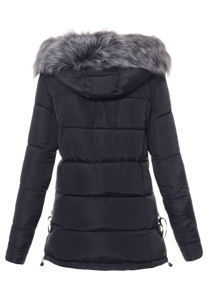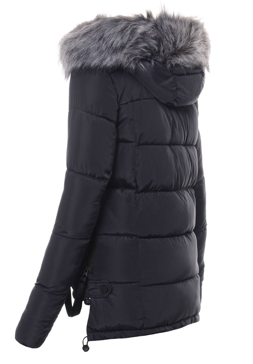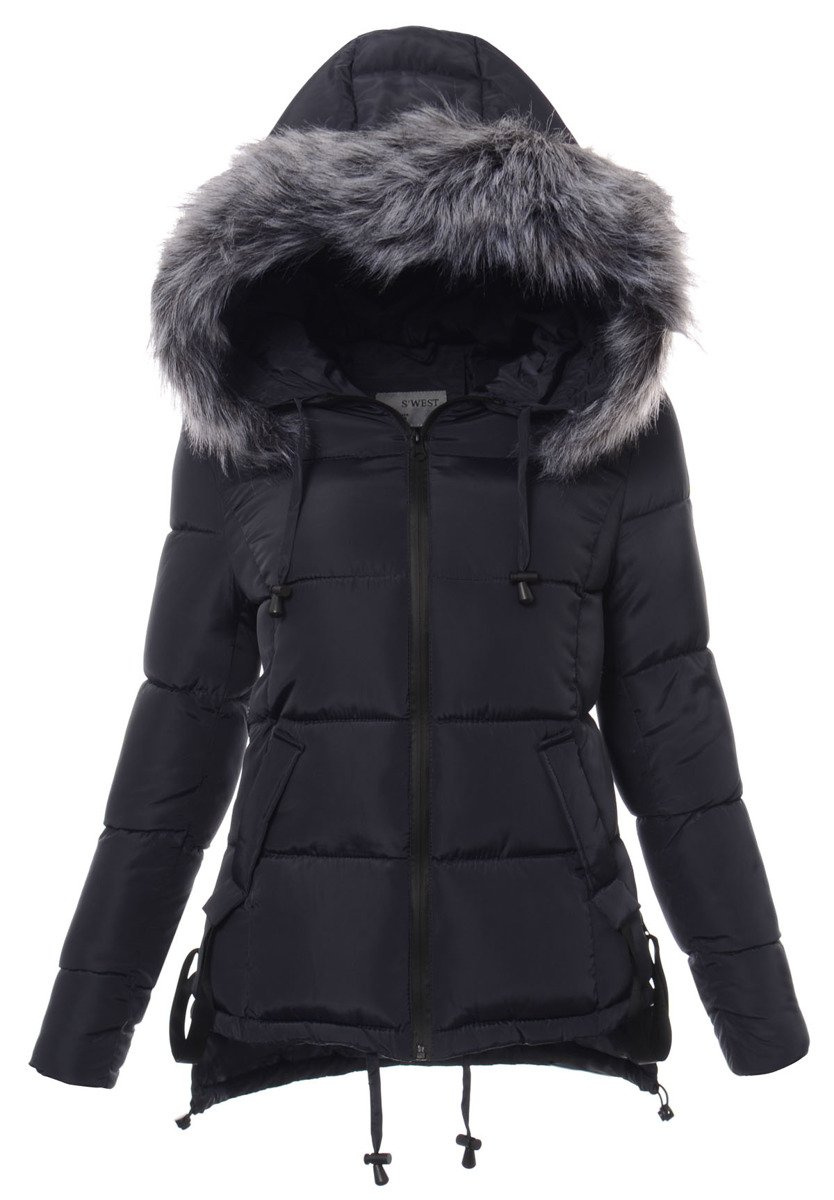 Rewelacyjna kurtka damska w kolorze granatowym. Ciepłe wypełnienie kurtki zapewnia ciepło w mroźne dni. Kurtka w środku wykończona jest podszewką. Kurtka zapinana jest na kryty suwak. Kurtka posiada z przodu dwie kieszenie zapinane na napy. Nieodpinany kaptur ze ściągaczem zapewnia ciepło w wietrzne zimowe dni. Futerko przy kapturze jest odpinane. Kurtka posiada ozdobne suwaki po boku kurtki oraz ozdobne troczki pod kieszeniami. Kurtka posiada ściągacze na dole od środka kurtki. Tył kurtki jest dłuży od tyłu o ok. 6 cm. Kurtka posiada wysoką stójkę. Kurtka wykonana jest z materiałów najwyższej jakości. Kurtka ocieplona jest bardzo wysokiej jakości wypełnieniem syntetycznym, które zapewnia doskonałą termoizolację oraz wysoki komfort użytkowania.