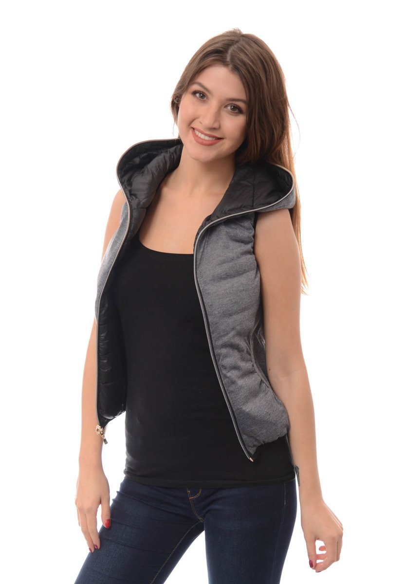 Damski dwustronny bezrękawnik w kolorze czarnym. Wykonany jest z materiałów najwyższej jakości. Bezrękawnik zasuwany jest na suwak. Na dole bezrękawnik ma dwie kieszenie zapinane na suwaki. Bezrękawnik jest delikatnie taliowany dzięki czemu idealnie dopasowuję się do sylwetki. Idealnie sprawdzi się w wielu wiosennych stylizacjach. Nieodpinany kaptur zapewnia ochronę w wietrzne i deszczowe dni. Suwaki w bezrękawniku są w kolorze złotym. Bezrękawnik ocieplony jest bardzo wysokiej jakości wypełnieniem syntetycznym, które zapewnia doskonałą termoizolację oraz wysoki komfort użytkowania.