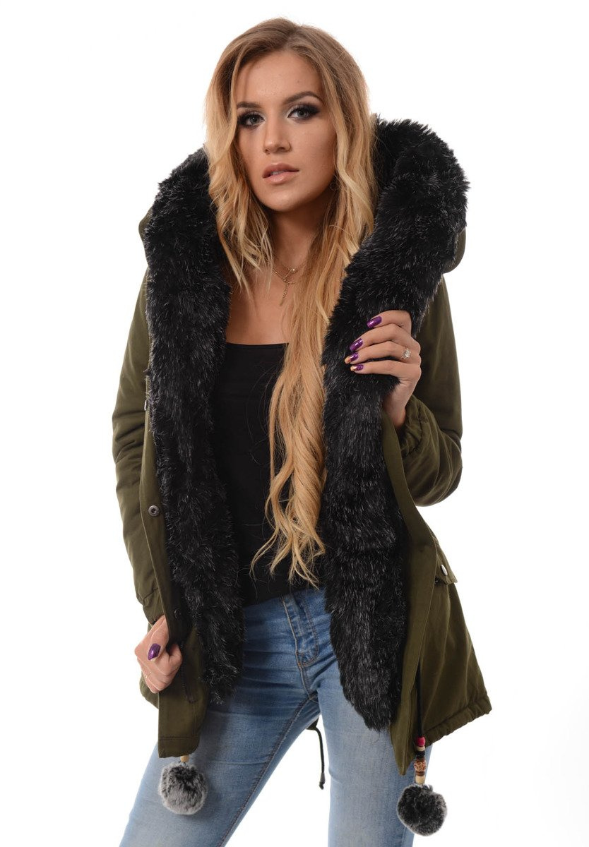 Piękna Damska Kurtka Parka Zielona z Czarnym Futerkiem