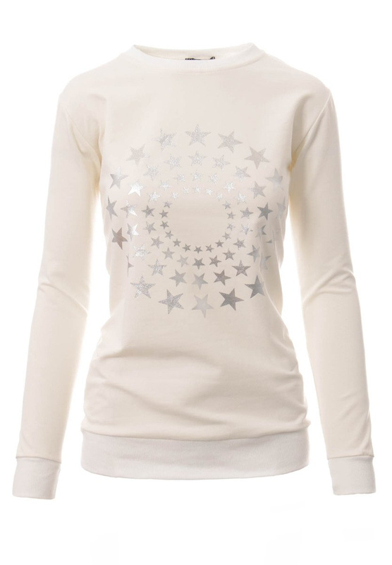 Piękna damska bluza w kolorze ecru z nadrukiem gwiazdek. Bluza posiada długie rękawy zakończone ściągaczem. Dół bluzy wykończony ściągaczem. Fason bluzy idealnie podkreśli kobiecą sylwetkę. Bluza wykonana jest z materiałów najwyższej jakości. Materiał: 73% Bawełna, 23% Poliester, 4% Elastan.