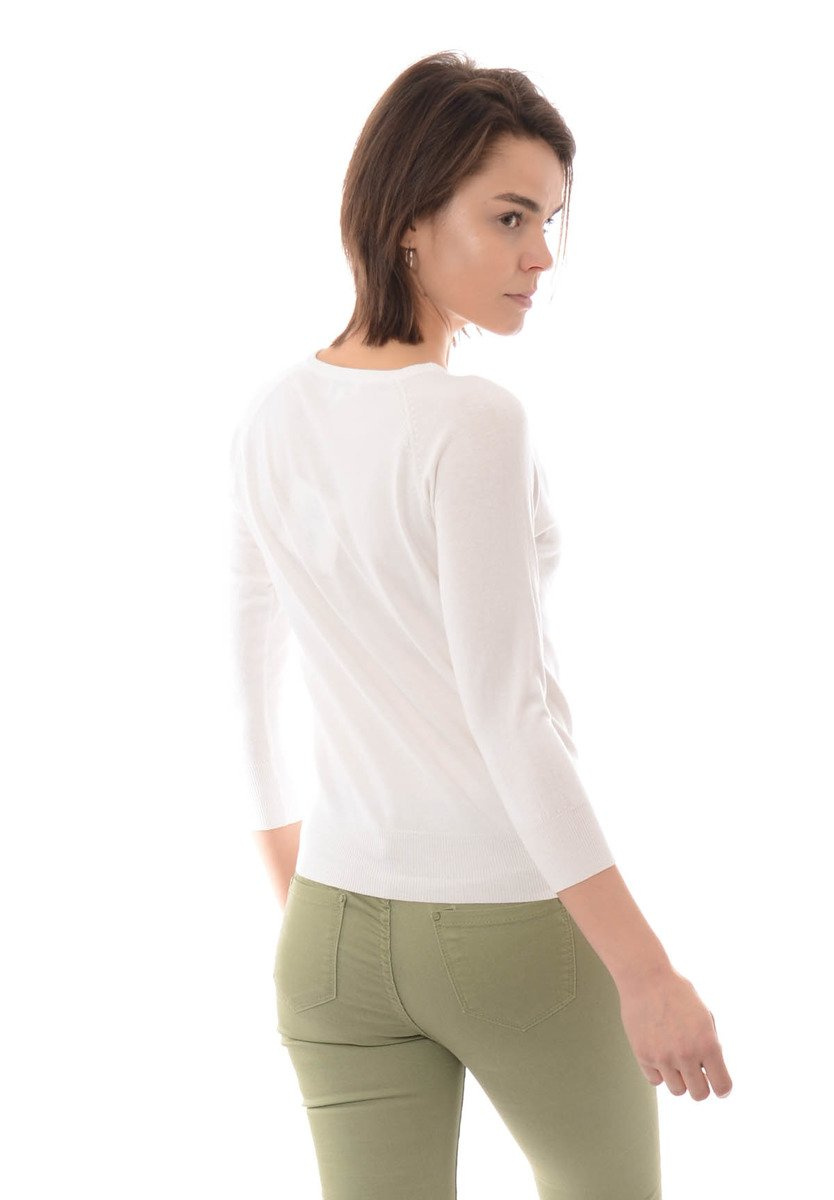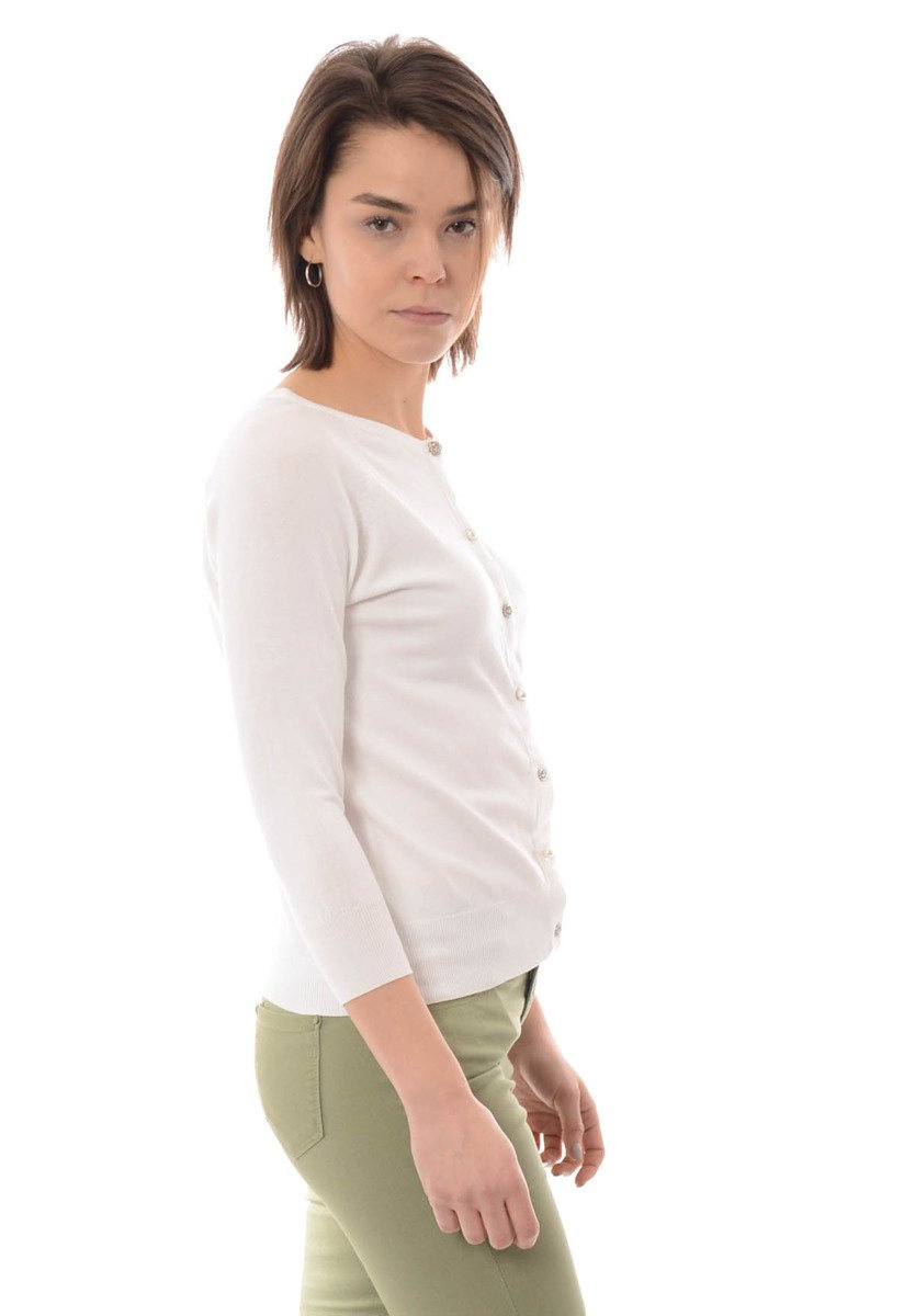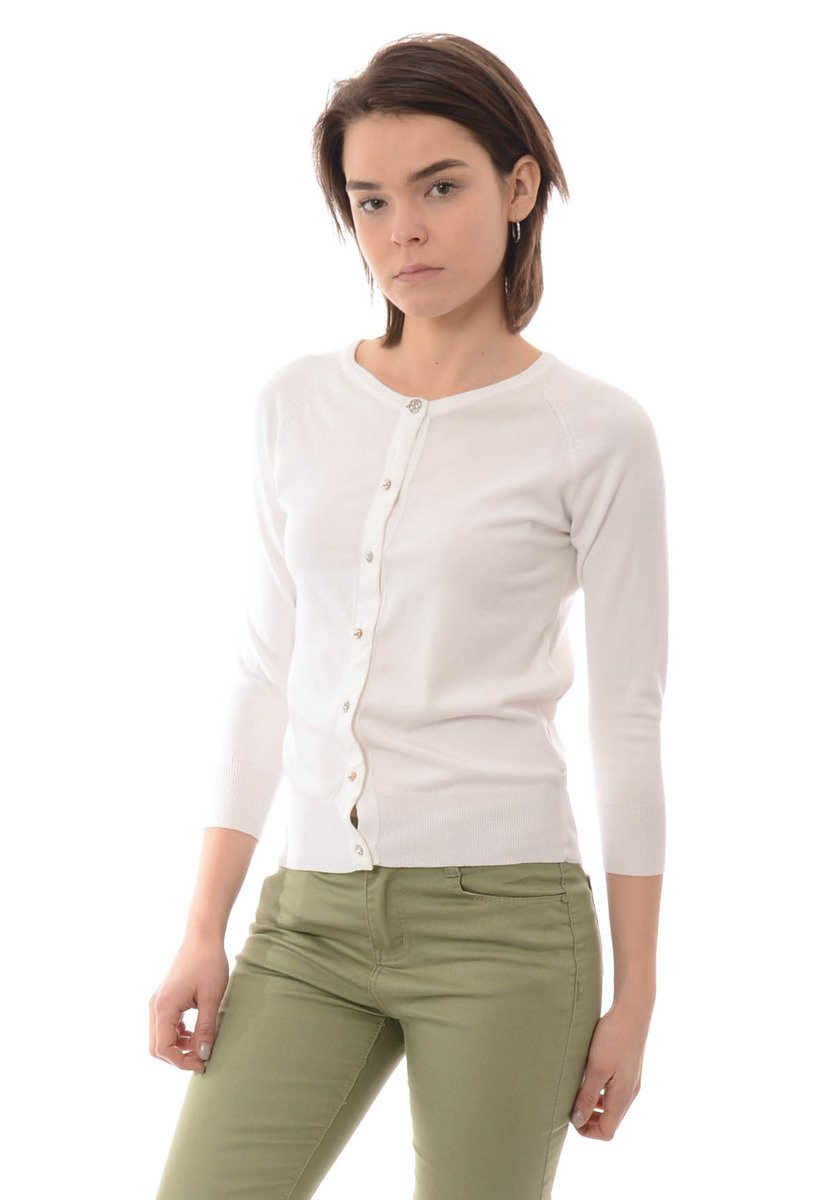Piękny damski sweterek w kolorze białym. Sweterek zapinany jest na ozdobne guziki. Sweterek posiada rękaw 3/4. Bluzka wykonana jest z materiałów najwyższej jakości. Materiał: 80% Viscose, 20% Poliester.