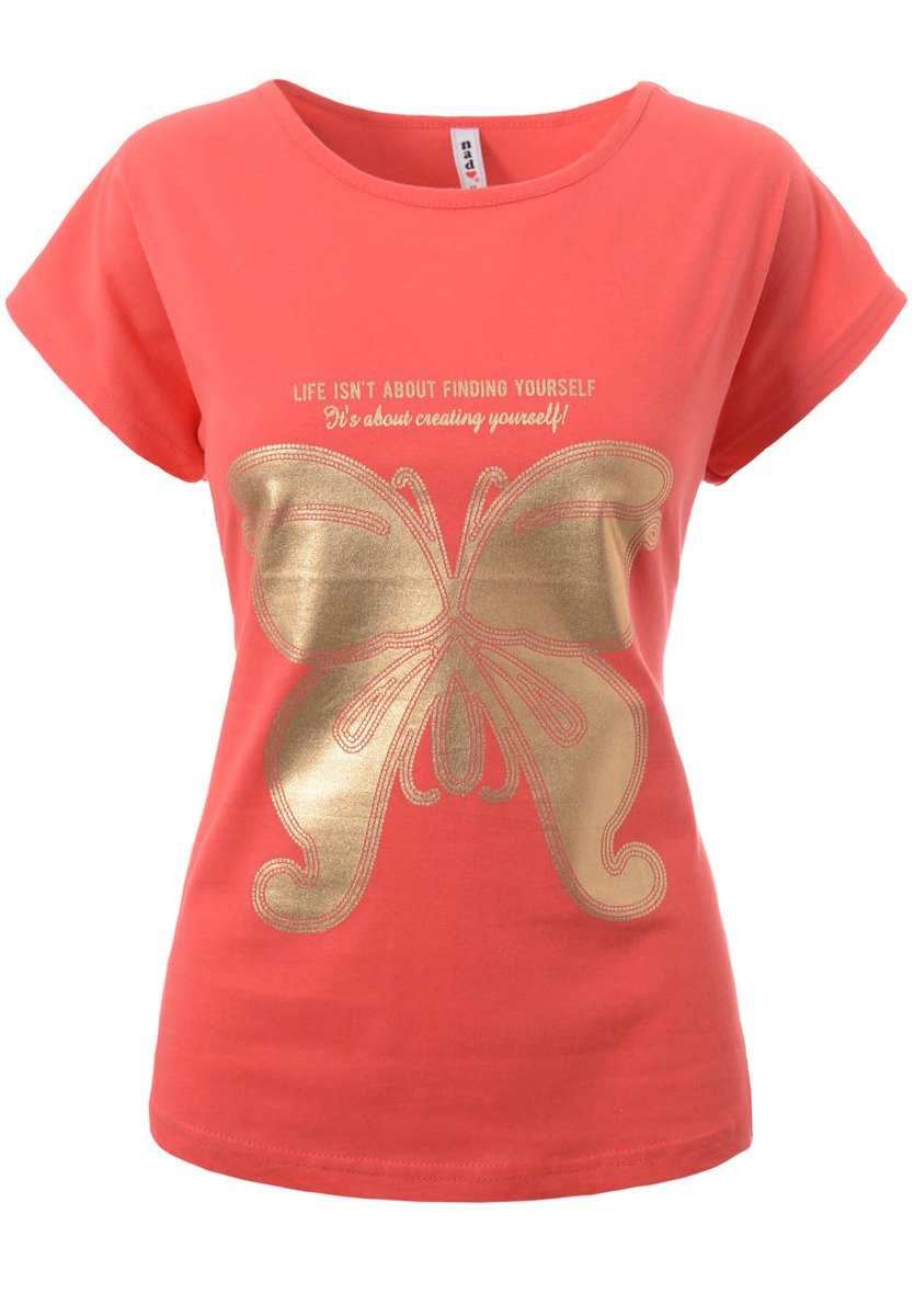 Damska Koszulka Krótki Rękaw Nadruk Motyl Czerwona