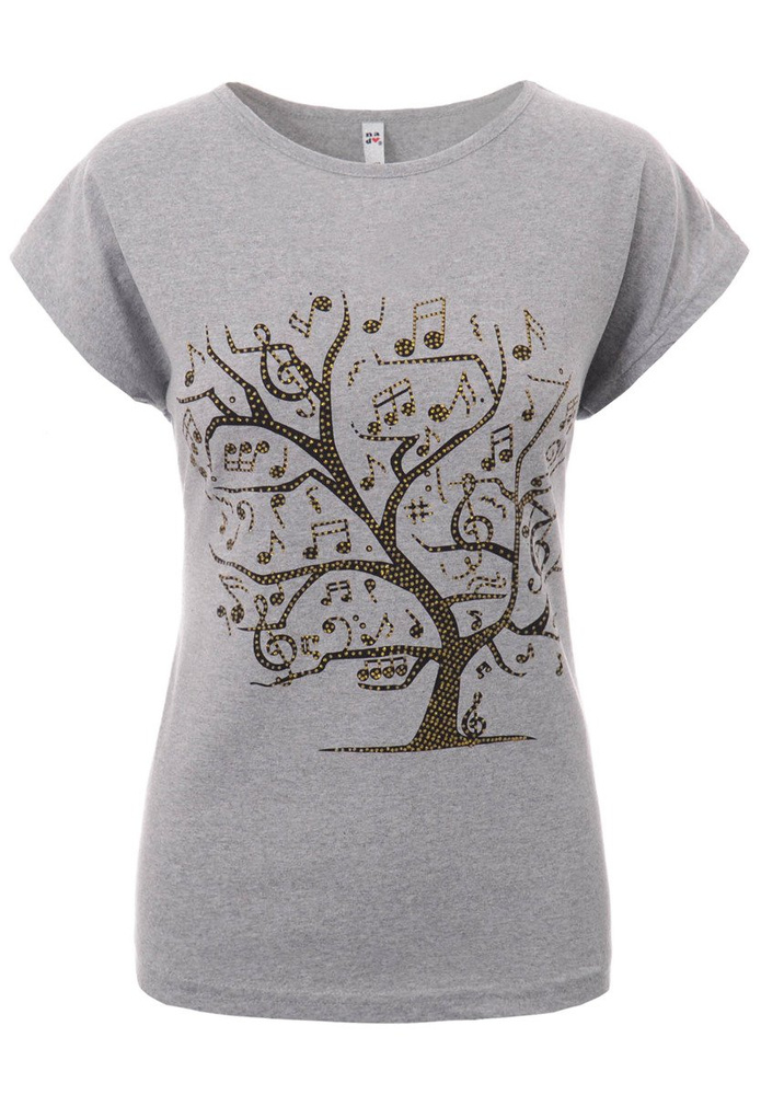 Damska Koszulka Krótki Rękaw T-Shirt Nadruk Nuty Szara