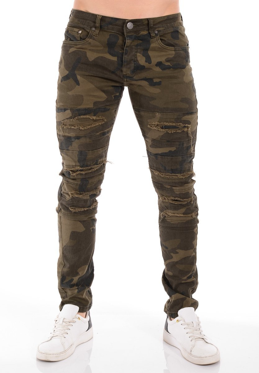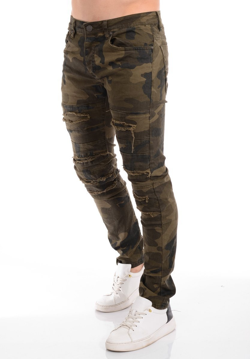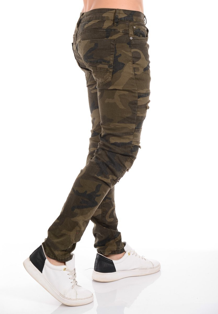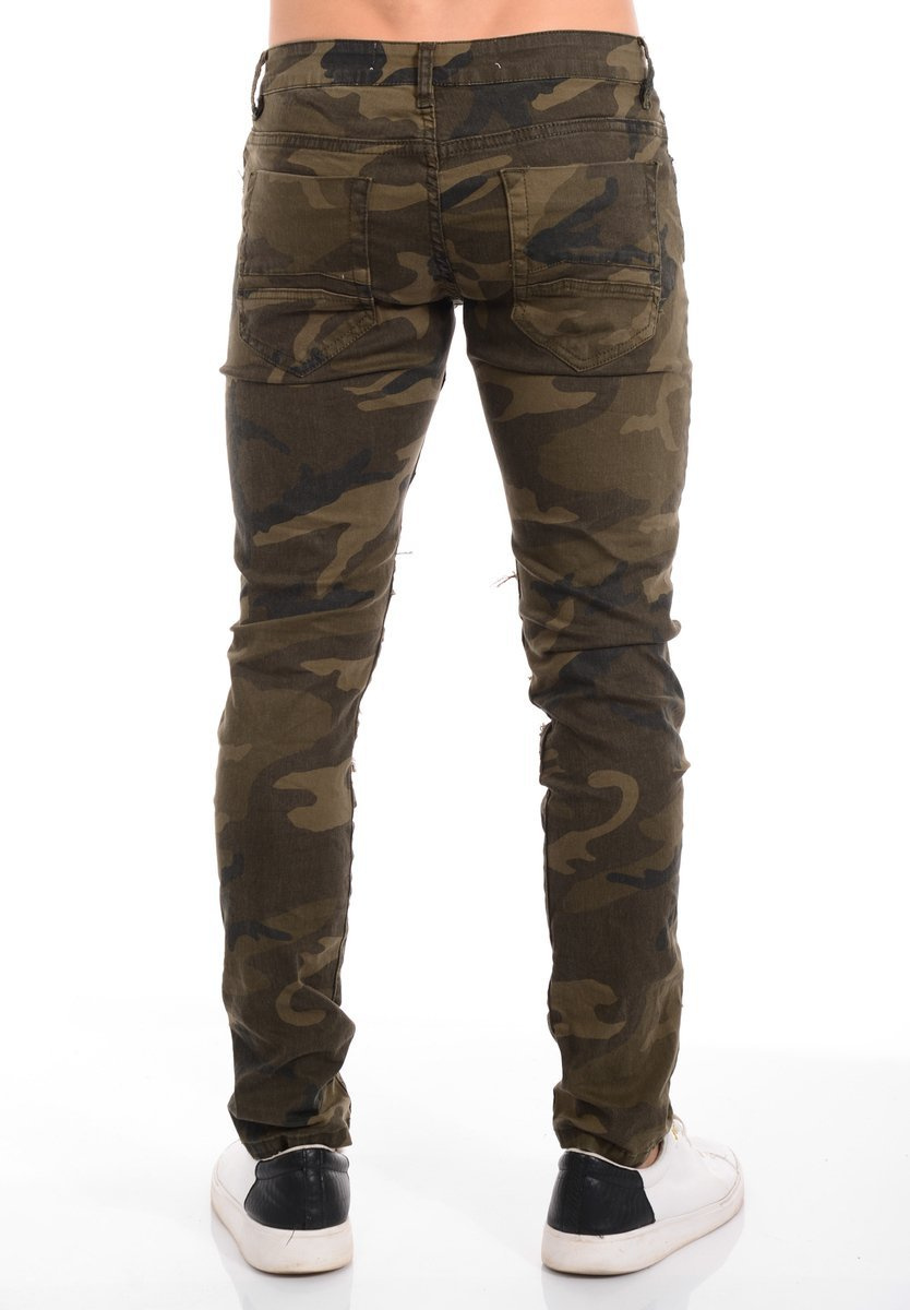 Męskie spodnie moro. Wykonane z materiałów najwyższej jakości. Spodnie na górze mają trzy kieszenie z przodu oraz dwie kieszenie z tyłu. Spodnie posiadają efektowne przeszycia i dziury na nogawkach. Idealnie sprawdza się do noszenia na co dzień. Spodnie zapinane na guziki, wyposażone w szlufki w pasie. Materiał: 98% Bawełna, 2% Elastan.