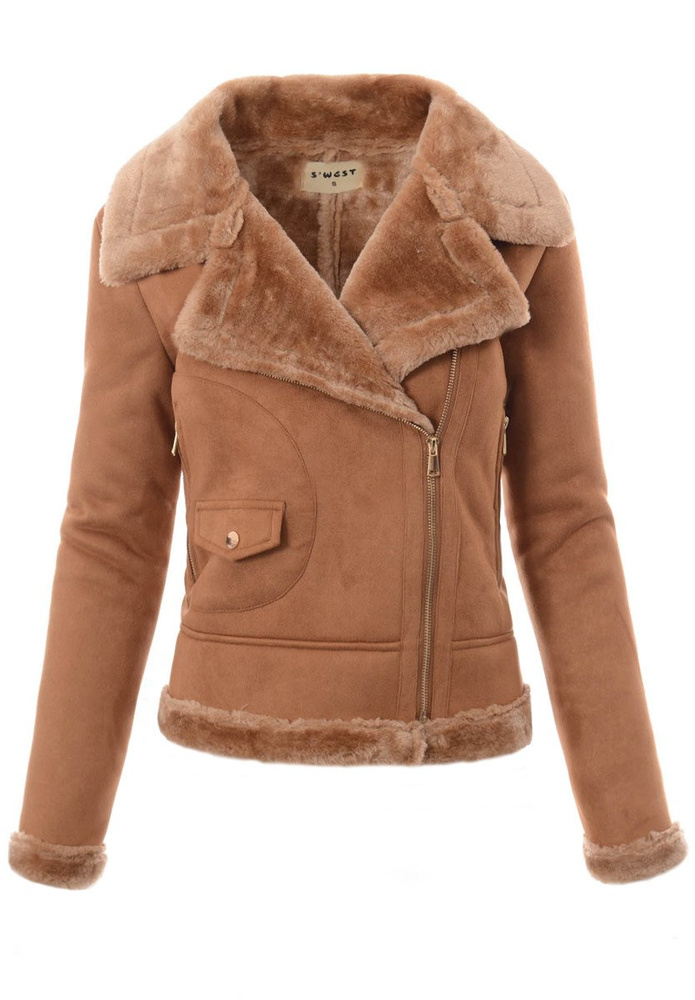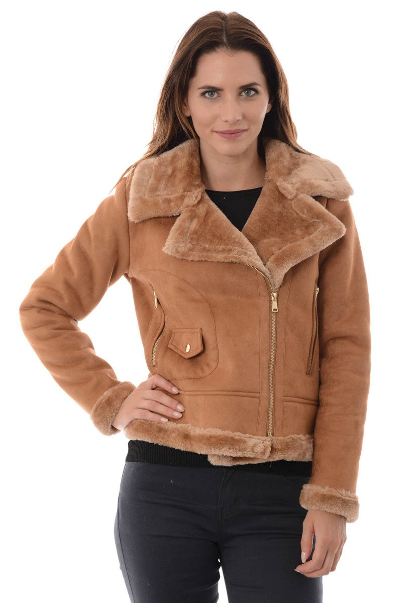 Rewelacyjny krótki, damski kożuszek w kolorze brązowym z podwójnym kołnierzem. Kurtka w środku wykończona jest przyjemnym futerkiem, które zapewnia doskonałą termoizolację oraz wysoki komfort użytkowania. Kurtka zasuwana jest na suwak. Dodatkowo posiada dwie kieszenie zasuwane na suwaki oraz jedną atrapę małej kieszonki zapinanej na napę. Modne wykończenia z futerka dodają kurtce uroku. Taliowany model idealnie podkreśli kobiecą sylwetkę. Suwaki kurtki są w kolorze złotym. Kurtka pozwala na stworzenie wielu niepowtarzalnych stylizacji. Kurtka wykonana jest z materiałów najwyższej jakości.