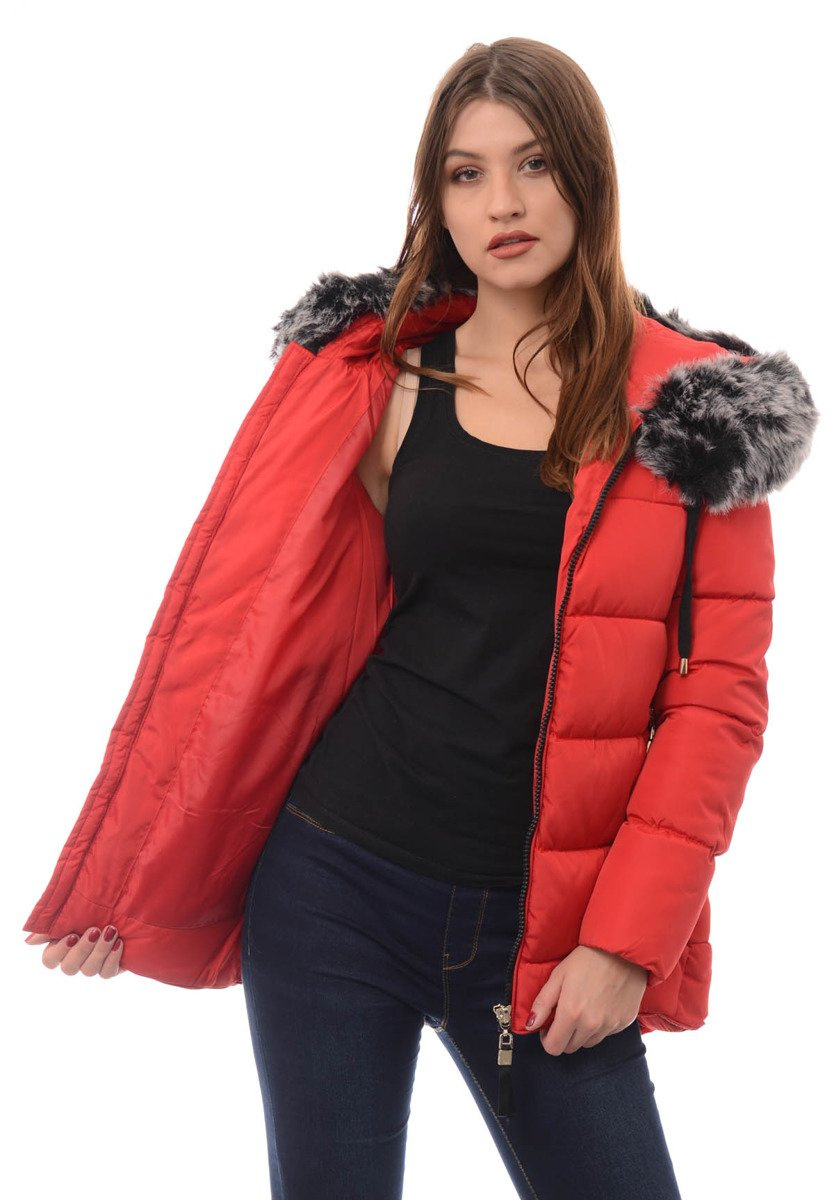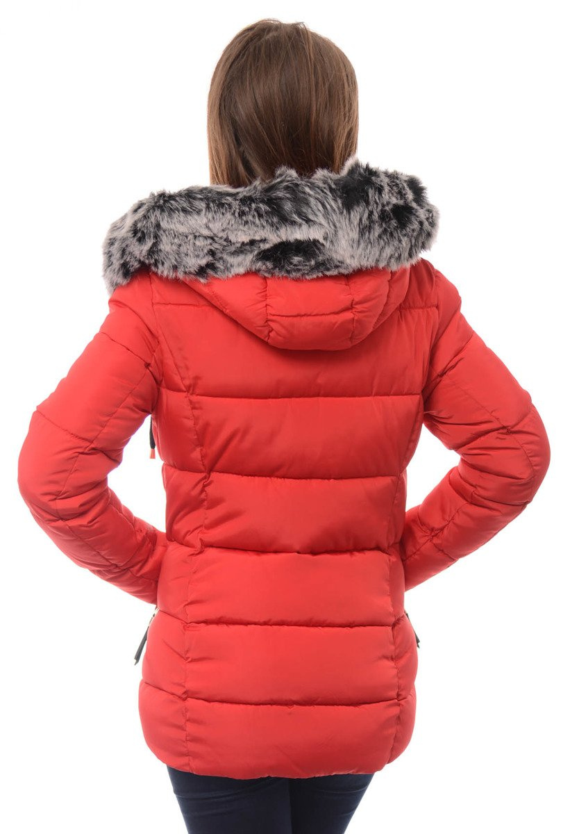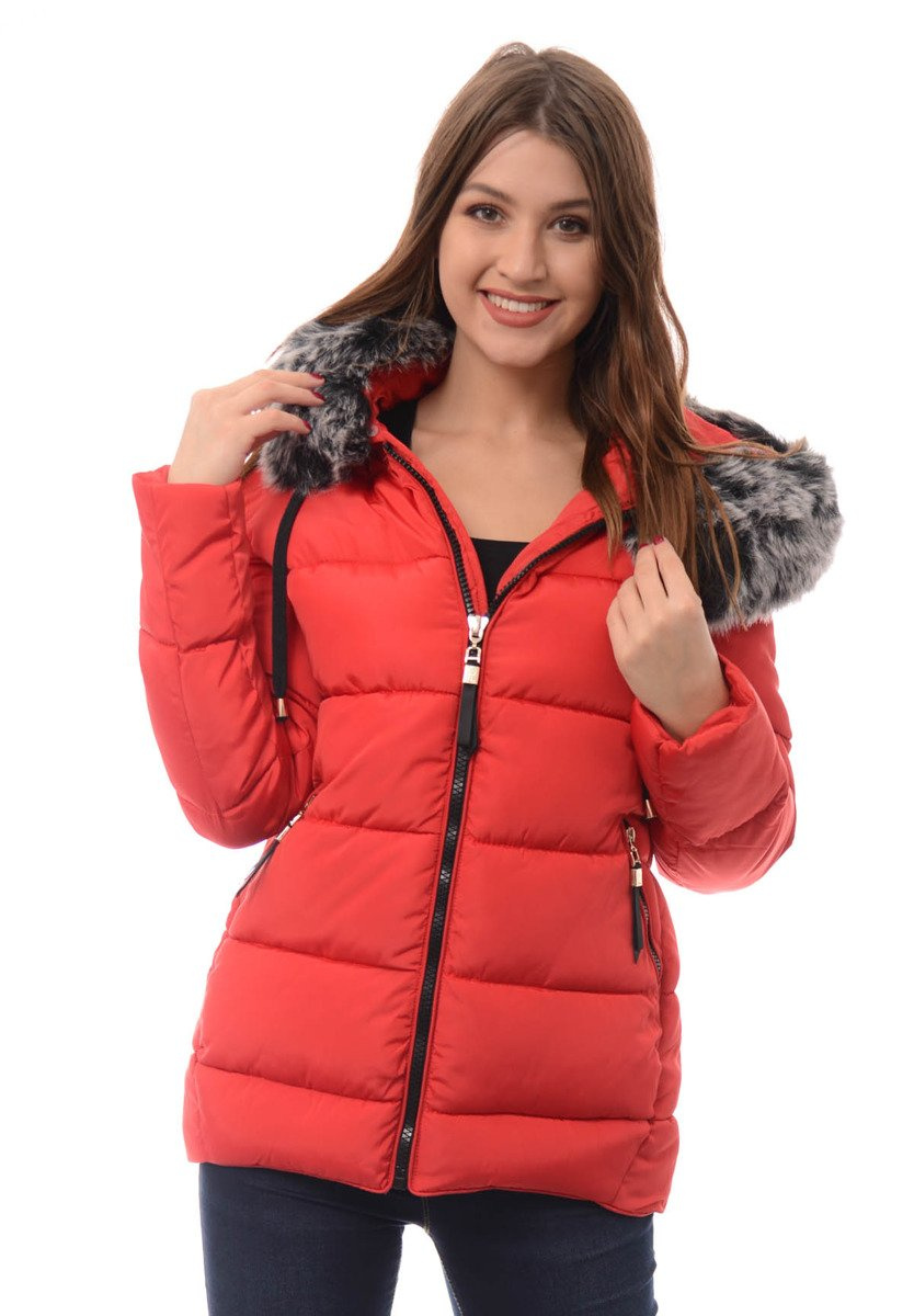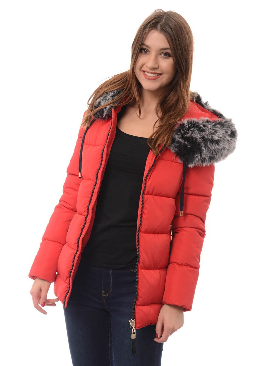 Rewelacyjna kurtka damska w kolorze czerwonym. Ciepłe wypełnienie kurtki zapewnia ciepło w mroźne dni. Kurtka w środku wykończona jest podszewką. Kurtka zapinana jest na suwak w kolorze czarnym. Delikatnie rozszerzany fason kurtki idealnie dopasowuję się do każdej kobiecej sylwetki. Kurtka posiada z przodu dwie kieszenie. Nieodpinany kaptur ze ściągaczem zapewnia ciepło w wietrzne zimowe dni. Futerko przy kapturze jest odpinane. Kurtka posiada ozdobne elementy w kolorze złotym. Tył kurtki jest dłuży o ok. 6cm. Kurtka wykonana jest z materiałów najwyższej jakości. Kurtka ocieplona jest bardzo wysokiej jakości wypełnieniem syntetycznym, które zapewnia doskonałą termoizolację oraz wysoki komfort użytkowania.