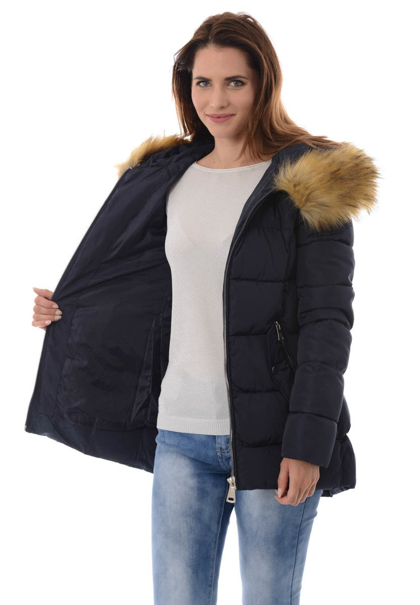 Rewelacyjna kurtka damska w kolorze granatowym. Wypełnienie kurtki zapewnia ciepło w mroźne dni. Kurtka w środku wykończona jest podszewką. Rękawy kurtki są ocieplane, wykończone podszewką. Kurtka zasuwana jest na suwak. Kurtka posiada z przodu dwie kieszenie zasuwane na suwaki oraz dwie atrapy zapinane na napy. Nieodpinany kaptur zapewnia ciepło w wietrzne zimowe dni. Futerko przy kapturze jest odpinane (na guziki). Suwaki w kurtce są w kolorze srebrnym. Tył kurtki dłuższy o ok. 6cm. Kurtka wykonana jest z materiałów najwyższej jakości. Kurtka ocieplona jest bardzo wysokiej jakości wypełnieniem syntetycznym, które zapewnia doskonałą termoizolację oraz wysoki komfort użytkowania. Model taliowany idealnie podkreślający damską sylwetkę.