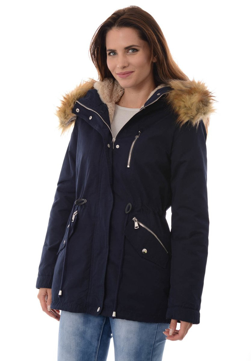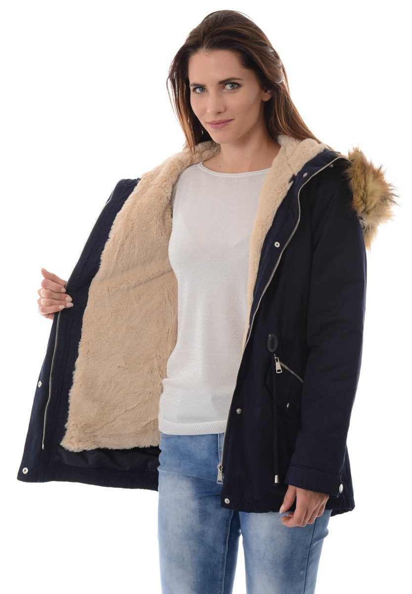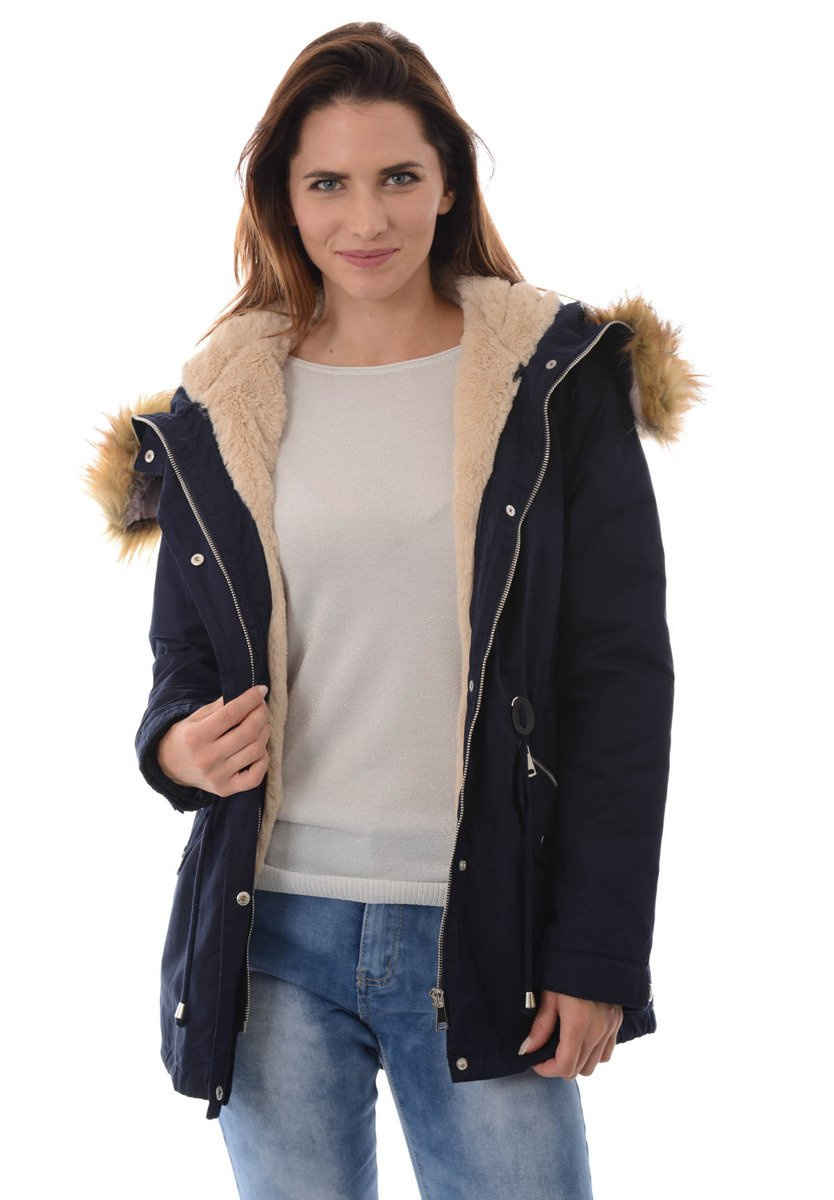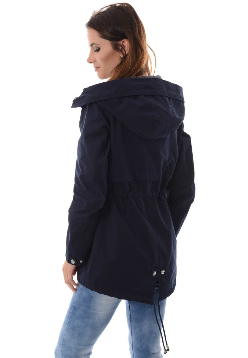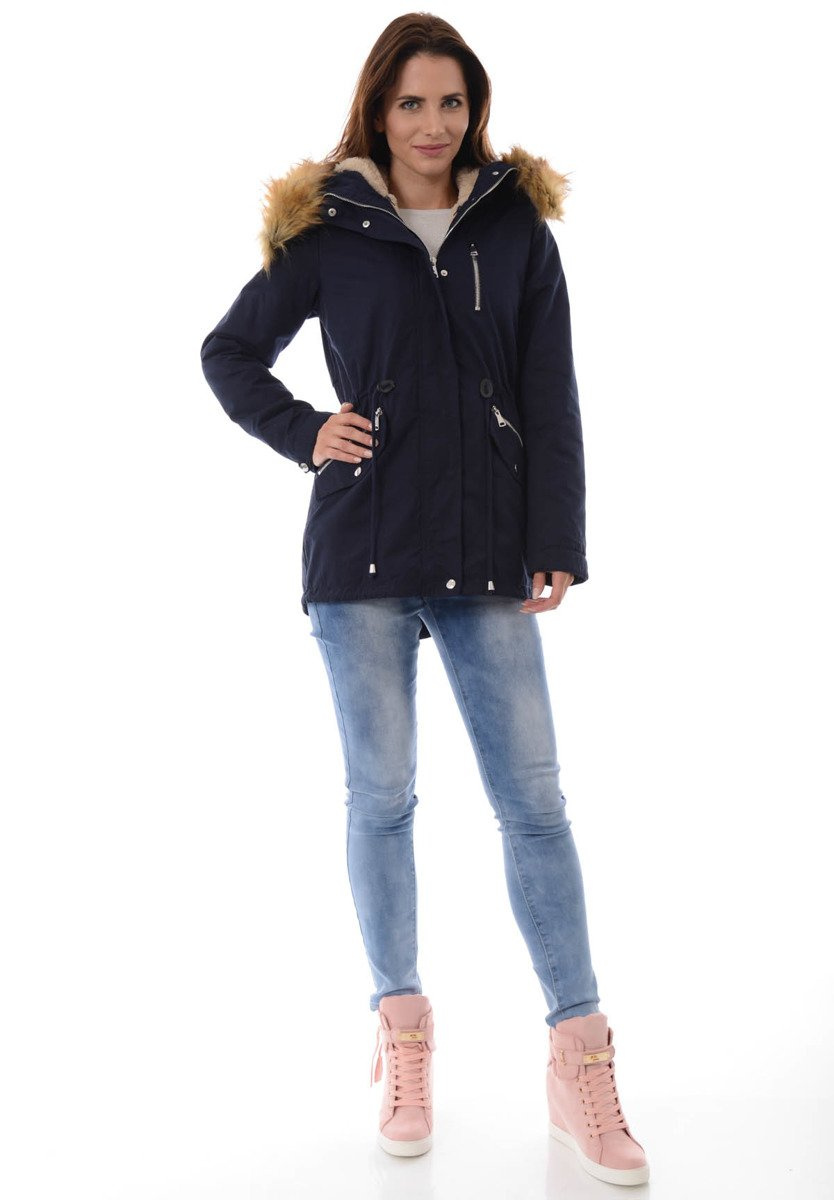 Rewelacyjna, najmodniejsza w tym sezonie zimowa kurtka parka w kolorze granatowym. Kurtka ma odpinana podpinkę dzięki czemu idealnie sprawdzi się również jako kurtka wiosenna lub jesienna. Rękawy kurtki są ocieplane wykończone materiałem. Podpinka w kurtce jest odpinana całościowo łącznie z rękawami oraz kapturem. Futerko przy kapturze kurtki jest odpinane niezależnie od podpinki. Ściągacz w pasie oraz na dole pozwala na dowolne dopasowanie kurtki do sylwetki. Kurtka posiada dwie duże kieszenie z przodu zapinane na zatrzaski, a nad nimi ozdobne suwaki. Na górze kurtka ma jedną atrapę kieszeni zasuwaną na suwak. Parka zapinana jest na napy oraz suwak. Kaptur kurtki jest nieodpinany. Mankiety kurtki można regulować za pomocą zatrzasków. Tył kurtki jest dłuższy o ok. 7 cm od jej przodu. Kurtka parka wykonana jest z materiałów najwyższej jakości. Materiał: 50% Poliester, 40% Bawełna, 10% Nylon.