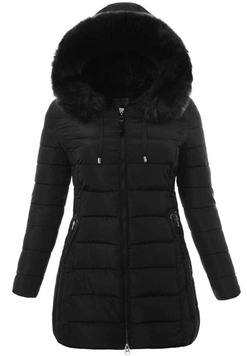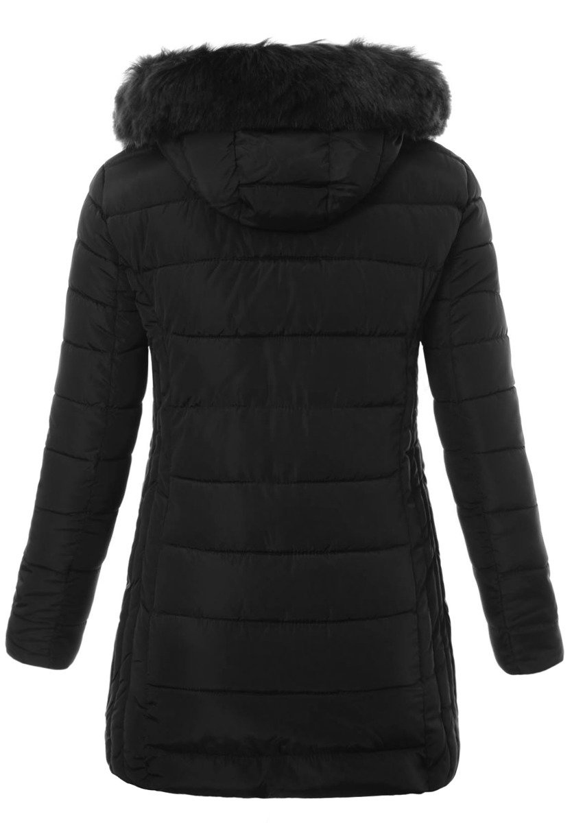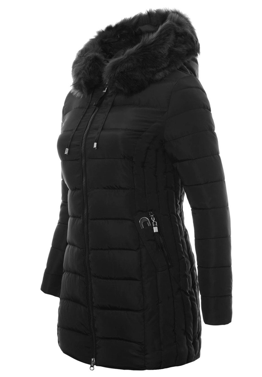 Rewelacyjna zimowa kurtka damska w kolorze czarnym. Ocieplenie kurtki zapewnia ciepło w mroźne dni. Kurtka w środku do połowy wykończona jest przyjemnym futerkiem. Rękawy kurtki są ocieplone, wykończone podszewką. Kurtka zasuwana jest na podwójny suwak. Kurtka posiada z przodu dwie kieszenie zasuwane na suwaki. Przy kieszeniach znajdują się dwie srebrne ozdoby. Nieodpinany kaptur ze ściągaczem oraz odpinanym futerkiem zapewnia ciepło w wietrzne zimowe dni. Kurtka posiada wysoką stójkę.  Ściągacze w mankietach stanowią dodatkowe zabezpieczenie przed zimnem. Taliowany model kurtki idealnie podkreśla kobieca sylwetkę. Kurtka wykonana jest z materiałów najwyższej jakości. Kurtka ocieplona jest bardzo wysokiej jakości wypełnieniem syntetycznym, które zapewnia doskonałą termoizolację oraz wysoki komfort użytkowania.