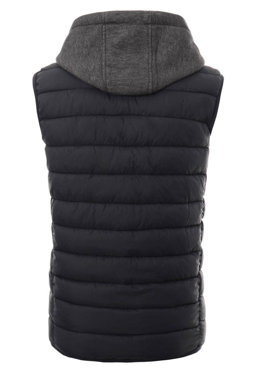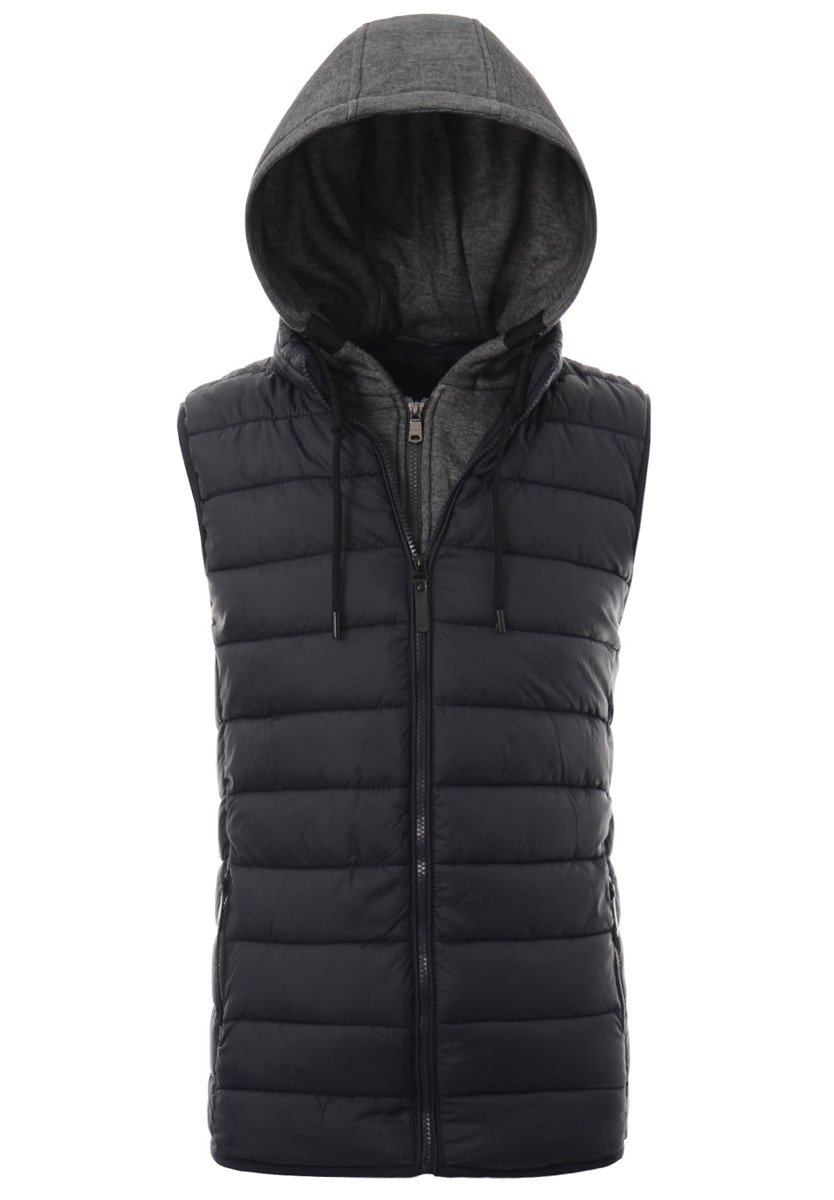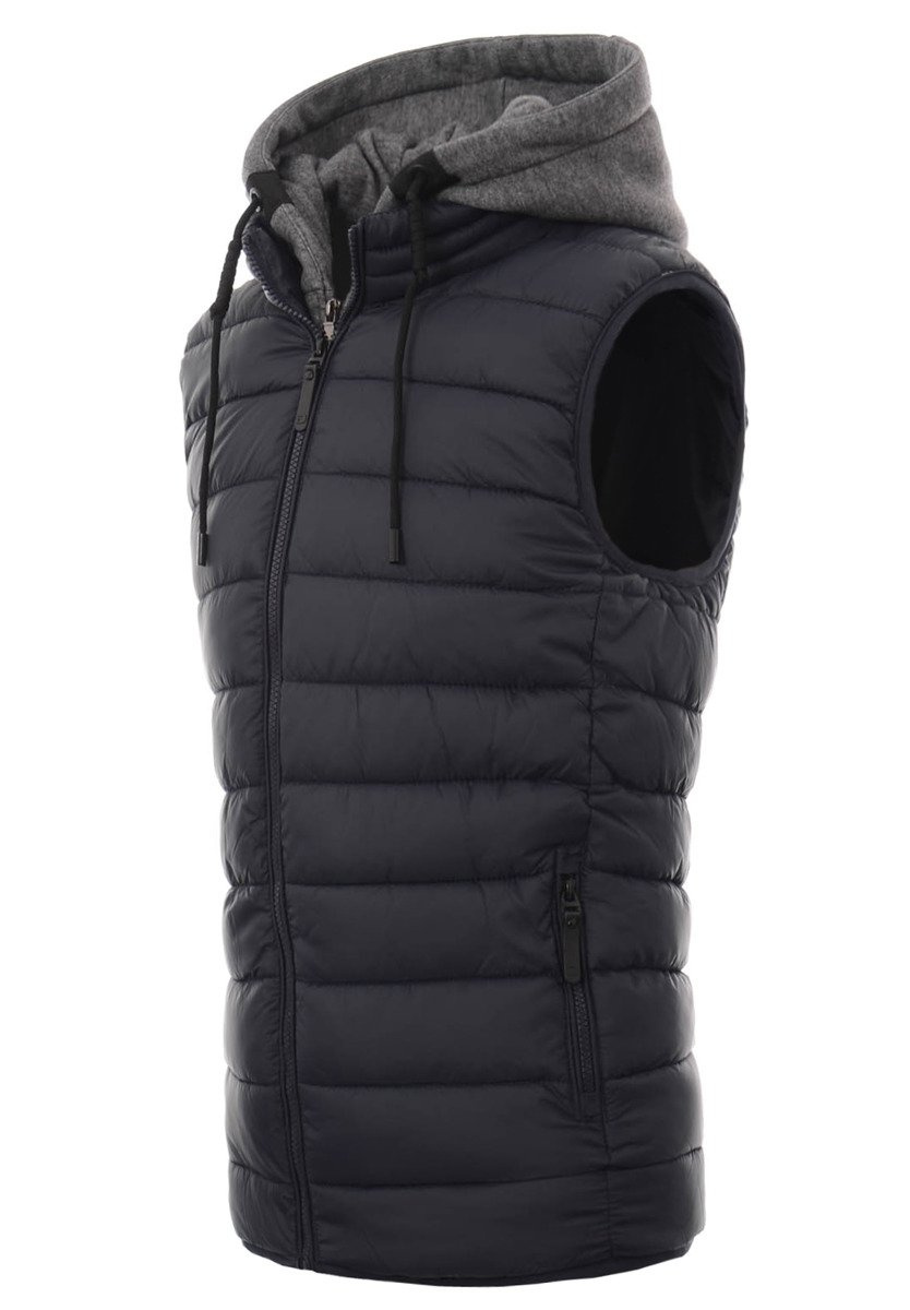 Męski bezrękawnik w kolorze granatowym. Bezrękawnik zasuwany jest na suwak. Na dole bezrękawnik posiada dwie kieszenie zasuwane na suwaki. Bezrękawnik posiada odpinany kaptur materiałowy ze ściągaczem. Dół i otwory na ręce wykończone są elastyczną lamówką. Bezrękawnik ocieplony jest bardzo wysokiej jakości wypełnieniem syntetycznym, które zapewnia doskonałą termoizolację oraz wysoki komfort użytkowania. Materiał: 100% Nylon.