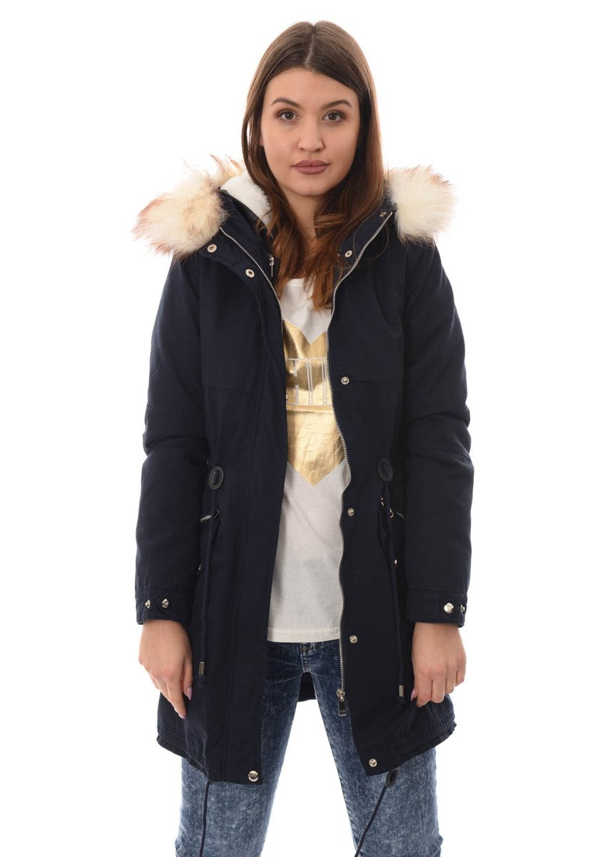 Rewelacyjna, najmodniejsza w tym sezonie zimowa kurtka parka w kolorze granatowym. Kurtka ma odpinana podpinkę dzięki czemu idealnie sprawdzi się również jako kurtka wiosenna lub jesienna. Podpinka wykończona jest przyjemnym futerkiem. Rękawy kurtki są ocieplane i wykończone materiałem. Podpinka w kurtce jest odpinana całościowo łącznie z rękawami oraz kapturem. Futerko przy kapturze kurtki jest odpinane niezależnie od podpinki. Ściągacz w pasie oraz na dole pozwala na dowolne dopasowanie kurtki do sylwetki. Kurtka posiada dwie duże kieszenie z przodu na dole zapinane na napy oraz dwie atrapy kieszeni zapinane na suwak. Parka zapinana jest na napy oraz suwak. Kaptur kurtki jest nieodpinany i posiada ściągacz. Mankiety kurtki można regulować za pomocą zatrzasków. Suwaki i napy w kurtce są w kolorze srebrnym. Kurtka wykonana jest z materiałów najwyższej jakości. Materiał: 100% Poliester.
