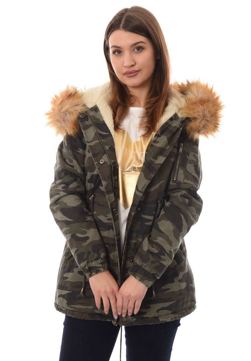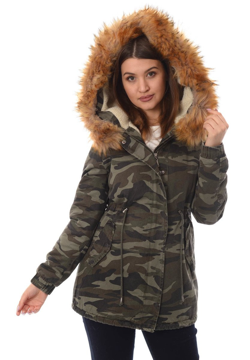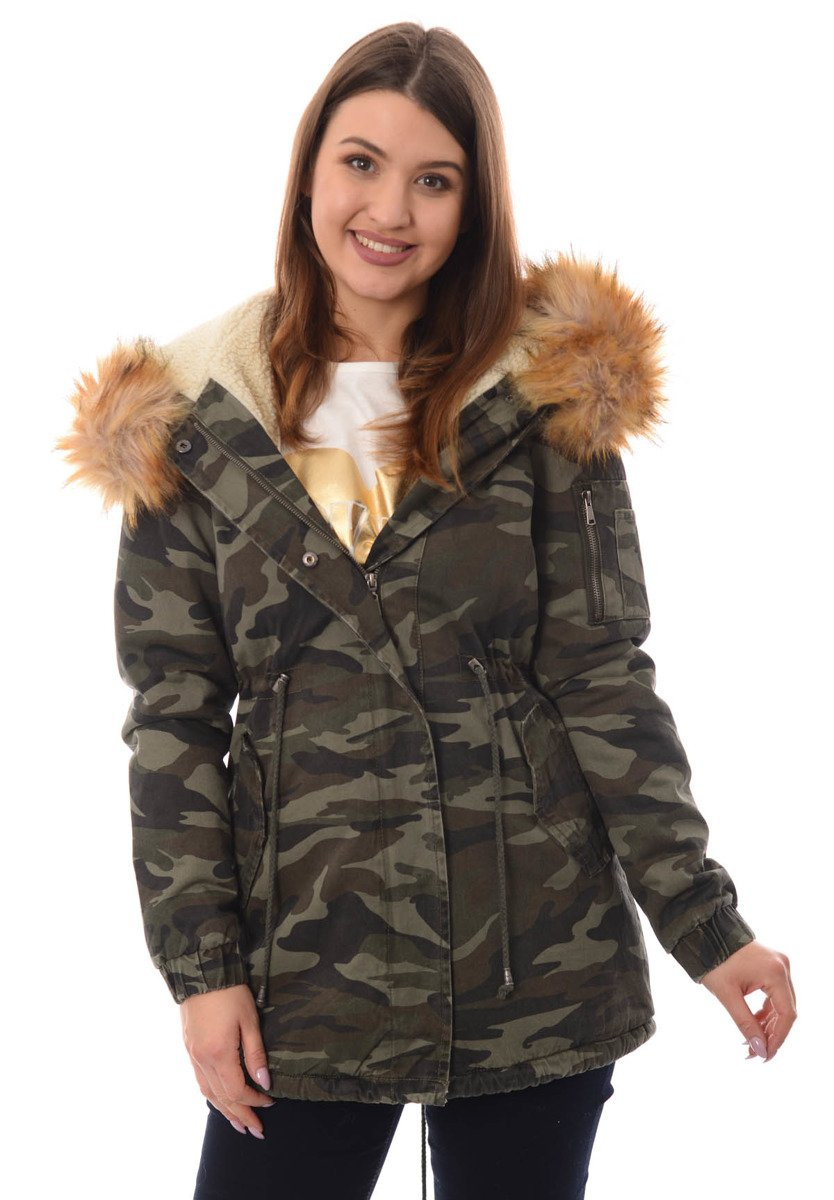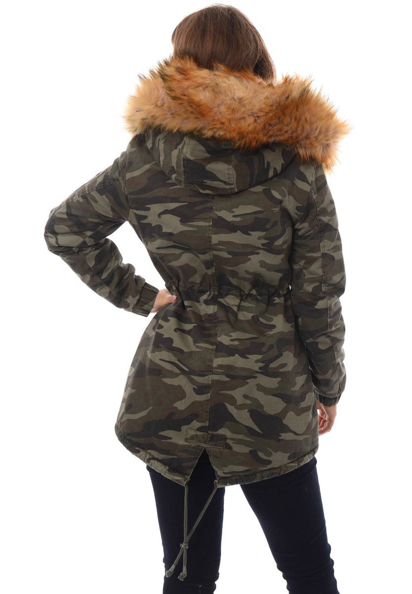Rewelacyjna, najmodniejsza w tym sezonie zimowa kurtka parka w kolorze moro. Rękawy kurtki są ocieplane i wykończone materiałem. Kurtka w środku ocieplona misiem. Futerko przy kapturze kurtki jest odpinane. Nieodpinany kaptur zapewnia ciepło w wietrze dni. Kurtka posiada dwie duże kieszenie z przodu na dole zapinane na zatrzaski oraz jedną kieszeń na suwak na lewym ramieniu. Parka zapinana jest na napy oraz suwak. Ściągacz w pasie i na dole pozwala na lepsze dopasowanie kurtki do sylwetki. Tył kurtki dłuży o ok. 10 cm. Kurtka posiada w mankietach ściągacze. Kurtka ocieplona jest bardzo wysokiej jakości wypełnieniem syntetycznym, które zapewnia doskonałą termoizolację oraz wysoki komfort użytkowania.  Kurtka wykonana jest z materiałów najwyższej jakości. Materiał: 100% Bawełna.