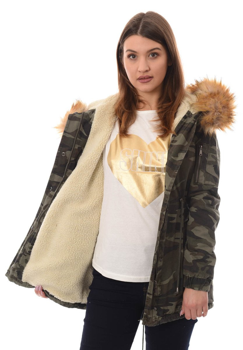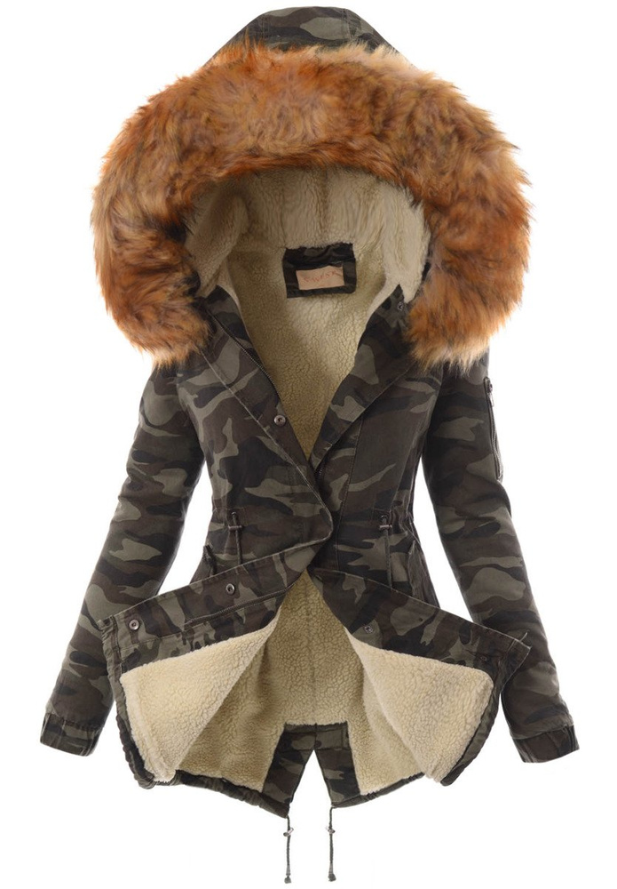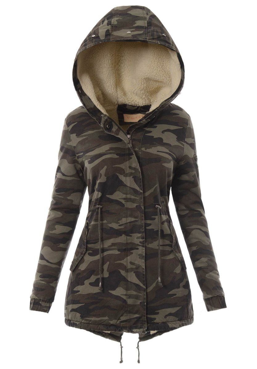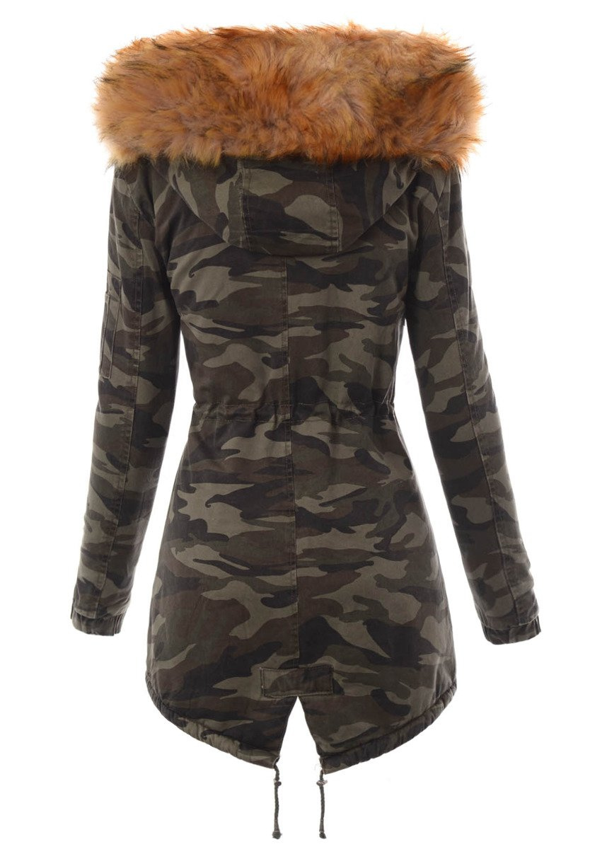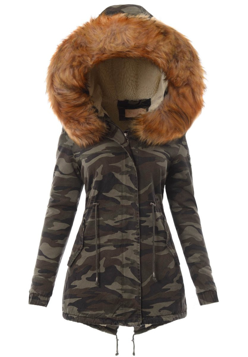 Rewelacyjna, najmodniejsza w tym sezonie zimowa kurtka parka w kolorze moro. Rękawy kurtki są ocieplane i wykończone materiałem. Kurtka w środku ocieplona misiem. Futerko przy kapturze kurtki jest odpinane. Nieodpinany kaptur zapewnia ciepło w wietrze dni. Kurtka posiada dwie duże kieszenie z przodu na dole zapinane na zatrzaski oraz jedną kieszeń na suwak na lewym ramieniu. Parka zapinana jest na napy oraz suwak. Ściągacz w pasie i na dole pozwala na lepsze dopasowanie kurtki do sylwetki. Tył kurtki dłuży o ok. 10 cm. Kurtka posiada w mankietach ściągacze. Kurtka ocieplona jest bardzo wysokiej jakości wypełnieniem syntetycznym, które zapewnia doskonałą termoizolację oraz wysoki komfort użytkowania.  Kurtka wykonana jest z materiałów najwyższej jakości. Materiał: 100% Bawełna.