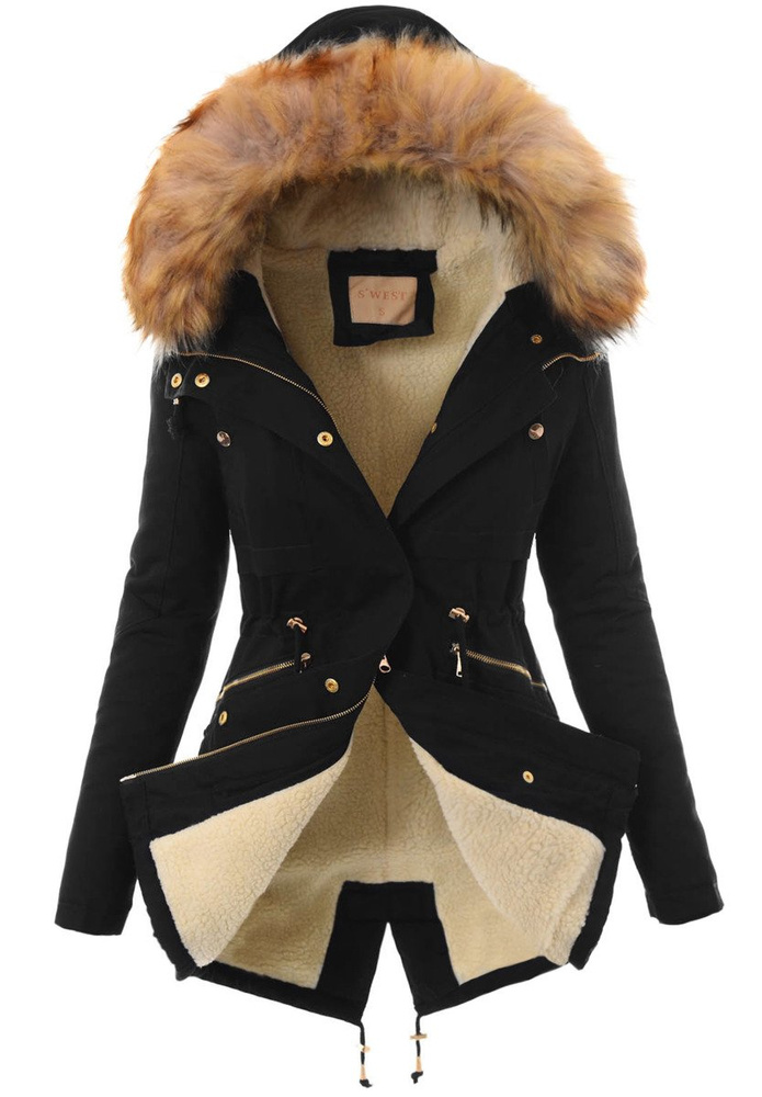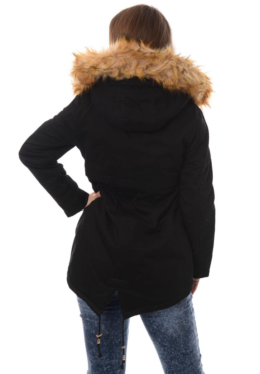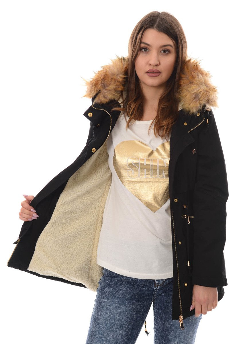 Rewelacyjna, najmodniejsza w tym sezonie zimowa kurtka parka w kolorze czarnym. Parka zapinana jest na suwak oraz napy. Kurtka ocieplana jest przyjemnym futerkiem na całej długości oraz w kapturze, rękawy kurtki są ocieplone, wykończone podszewką. Futerko przy kapturze kurtki jest odpinane. Nieodpinany kaptur zapewni ciepło w mroźne i wietrzne dni. Ściągacz w pasie oraz na dole na troczki pozwala na dowolne dopasowanie kurtki do sylwetki. Kurtka posiada dwie kieszenie na dole zapinane na napy, a nad nimi ozdobne suwaki oraz dwie kieszenie na piersiach zapinane na napy. Kurtka w mankietach posiada bawełniane ściągacze. Napy oraz suwak w kurtce są w kolorze złotym. Tył kurtki jest dłuższy o ok. 8 cm od jej przodu. Kurtka w mankietach posiada gumkę ściągającą, oraz regulację mankietów guzikami. Kurtka wykonana jest z materiałów najwyższej jakości. Materiał: 100% Bawełna.