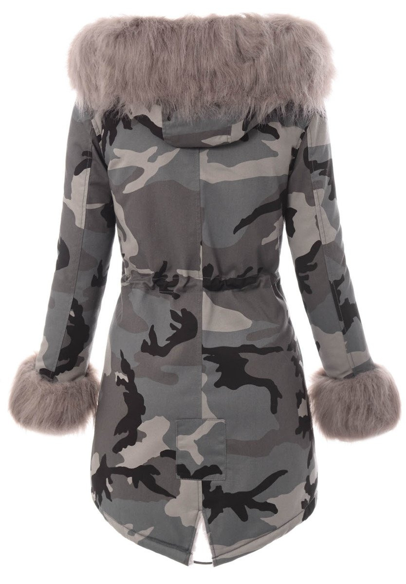 Rewelacyjna, najmodniejsza w tym sezonie zimowa kurtka parka moro w kolorze ziemno szarym z pięknym szarym futerkiem. Kurtka ocieplona jest przyjemnym futerkiem. Ściągacz w pasie oraz na dole pozwala na dowolne dopasowanie kurtki do sylwetki. Kurtka posiada dwie duże kieszenie z przodu na dole zapinane na napy. Parka zapinana jest na napy oraz suwak. Kaptur kurtki jest nieodpinany. Kurtka posiada odpinane futerko przy kapturze. Odpinane futerka przy mankietach. Suwaki i napy w kurtce są w kolorze złotym. Tył dłuższy o około 8cm. Kurtka wykonana jest z materiałów najwyższej jakości. Materiał: 80% Poliester, 20% Bawełna.