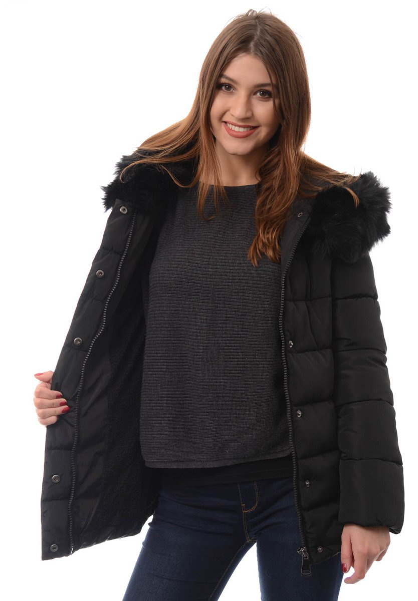 Rewelacyjna kurtka damska w kolorze czarnym. Ciepłe wypełnienie kurtki zapewnia ciepło w mroźne dni. Kurtka w środku wykończona jest przyjemnym "misiem". Rękawy kurtki są ocieplone, wykończone podszewką. Kurtka zapinana jest na suwak oraz napy. Kurtka posiada z przodu dwie kieszenie zasuwane na suwak. Przy kieszeniach kurtka ma ozdobne kulki z futerka, które można odpiąć. Nieodpinany kaptur z odpinanym futerkiem zapewnia ciepło w wietrzne zimowe dni. Kurtka posiada ozdobne suwaki nad kieszeniami. Kurtka posiada ściągacz na gumce w środku mankietu oraz ściągacze na dole od środka kurtki. Przód kurtki jest dłuży od tyłu o ok. 3cm. Kurtka wykonana jest z materiałów najwyższej jakości. Kurtka ocieplona jest bardzo wysokiej jakości wypełnieniem syntetycznym, które zapewnia doskonałą termoizolację oraz wysoki komfort użytkowania.