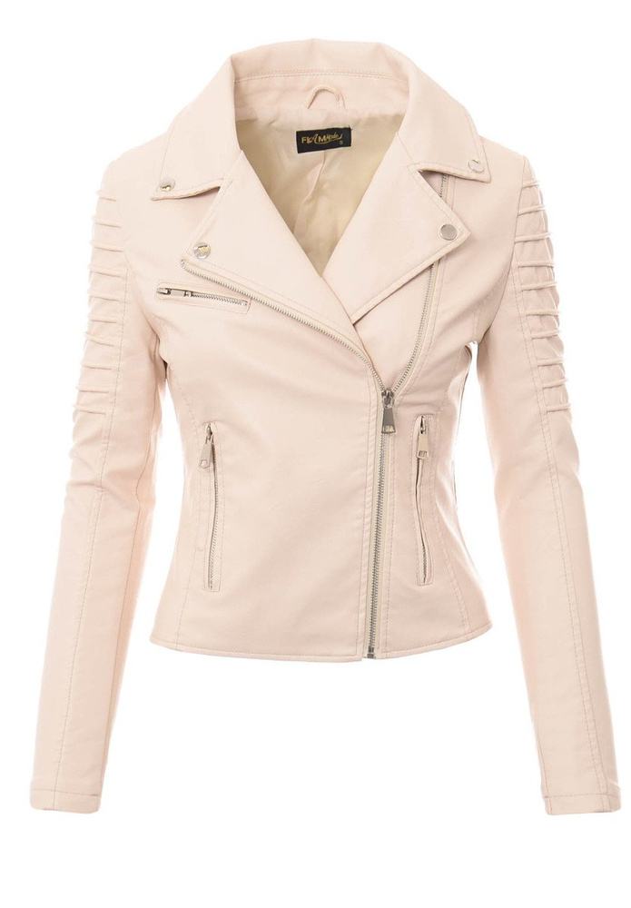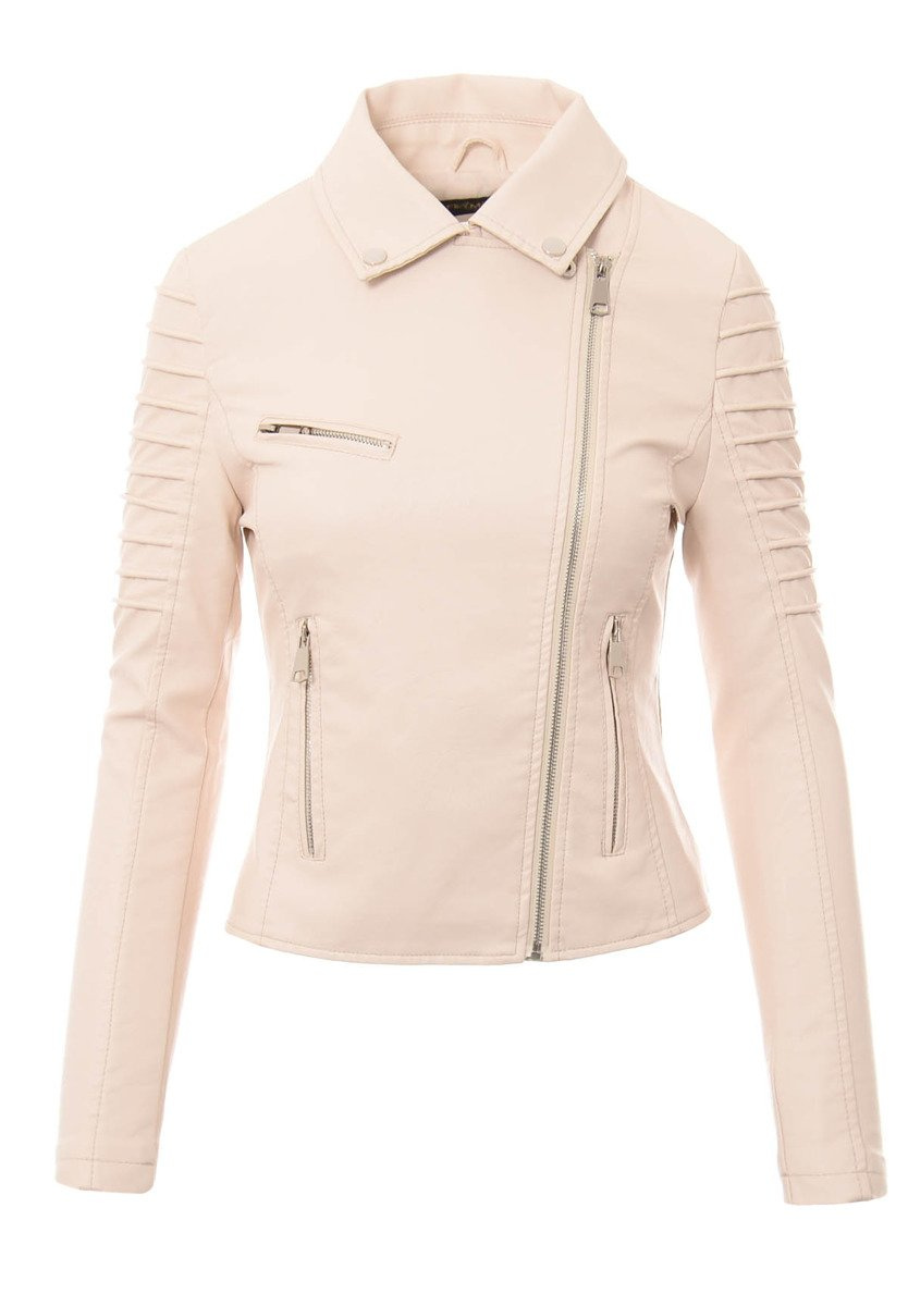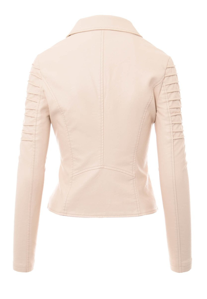 Piękna damska kurtka ramoneska w kolorze beżowym. Ramoneska zasuwana jest na ukośny suwak. Kurtka posiada podwójny kołnierz ozdobiony napami. Ramoneska posiada dwie kieszenie kieszenie na dole zasuwane na suwaki oraz jedną atrapę na piersi. Taliowany krój kurtki idealnie dopasowuję się i podkreśla kobiecą sylwetkę. Suwaki w kurtce są w kolorze srebrnym. Ramoneska rewelacyjnie sprawdzi się w wielu wiosennych stylizacjach. Kurtka wykonana jest z wysokiej jakości eko-skóry.