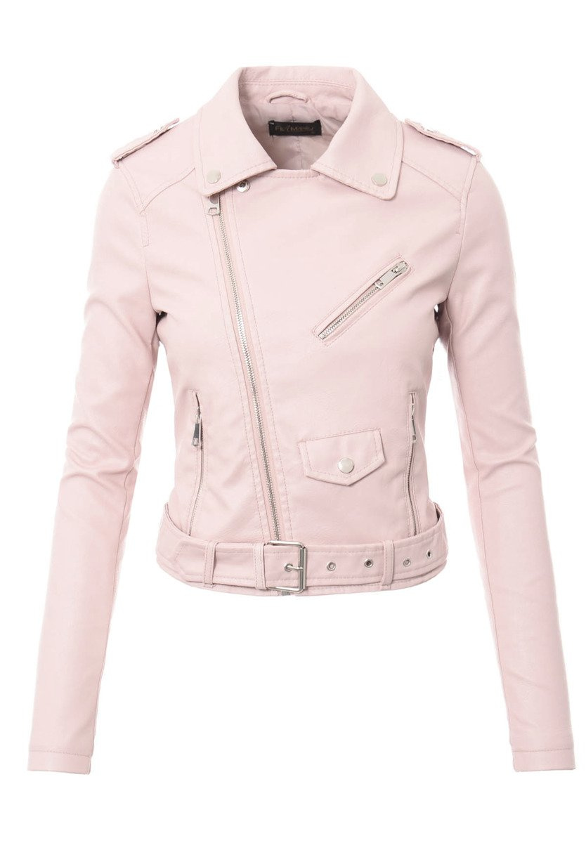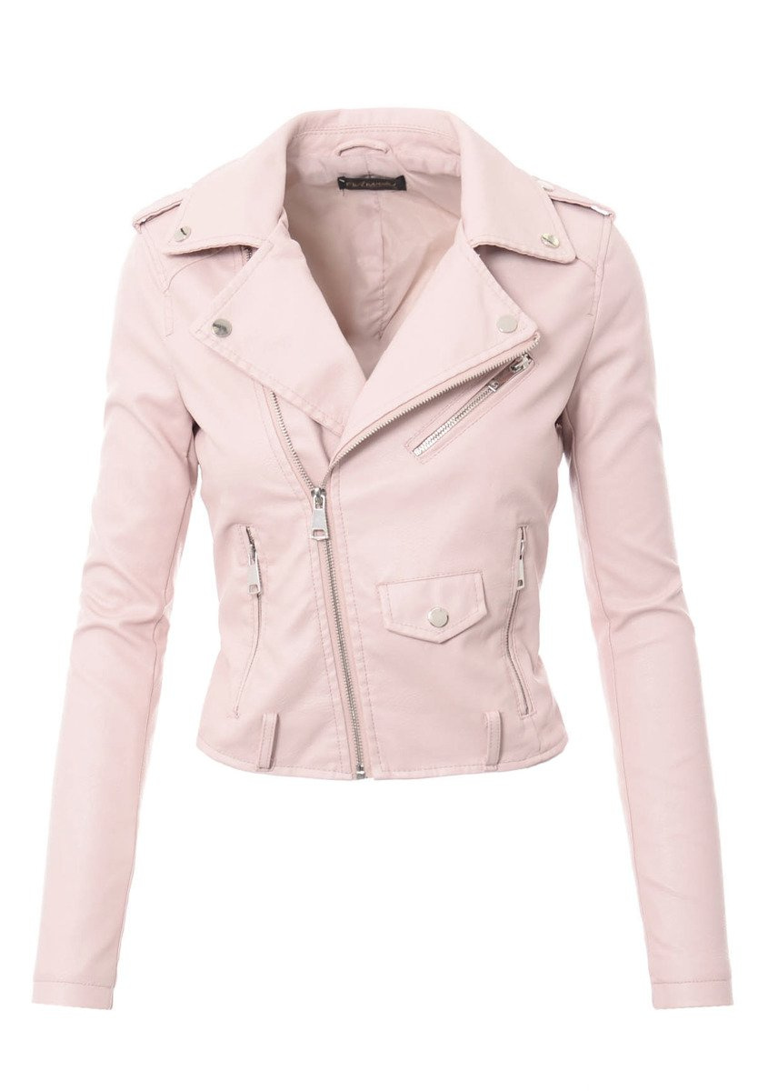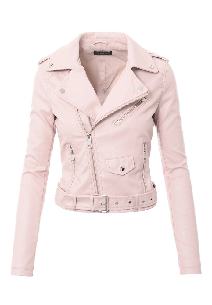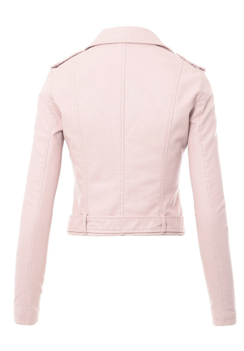 Piękna damska kurtka ramoneska w kolorze różowym. Ramoneska zasuwana jest na suwak, a na dole zapinana na pasek(możliwość wyjęcia). Kurtka posiada podwójny kołnierz ozdobiony napami. Ramoneska posiada dwie kieszenie na dole zasuwane na suwaki i jedna zapinaną na napę, oraz jedną atrapę na piersi. Taliowany krój kurtki idealnie podkreśla kobiecą sylwetkę. Suwaki w kurtce są w kolorze srebrnym. Ramoneska rewelacyjnie sprawdzi się w wielu wiosennych stylizacjach. Kurtka wykonana jest z wysokiej jakości eko-skóry.
