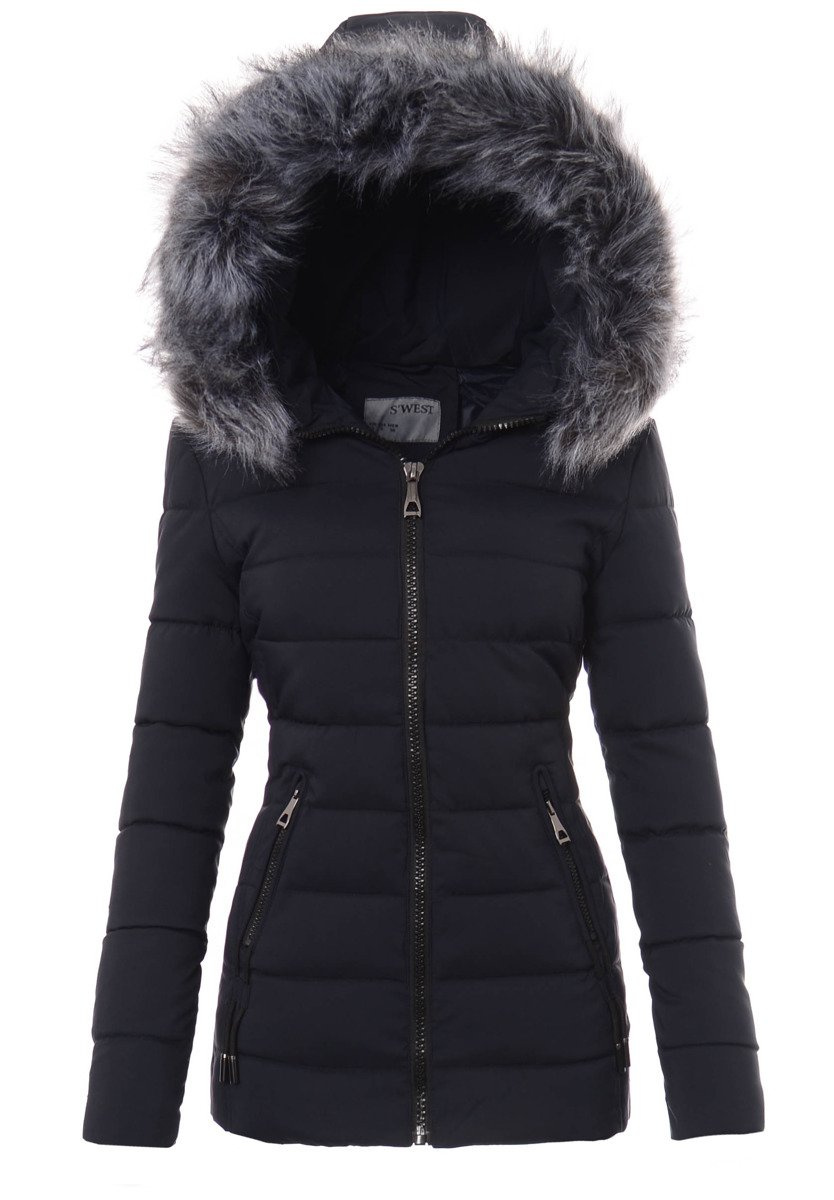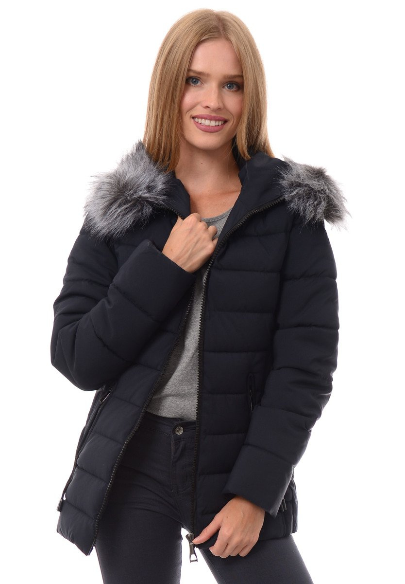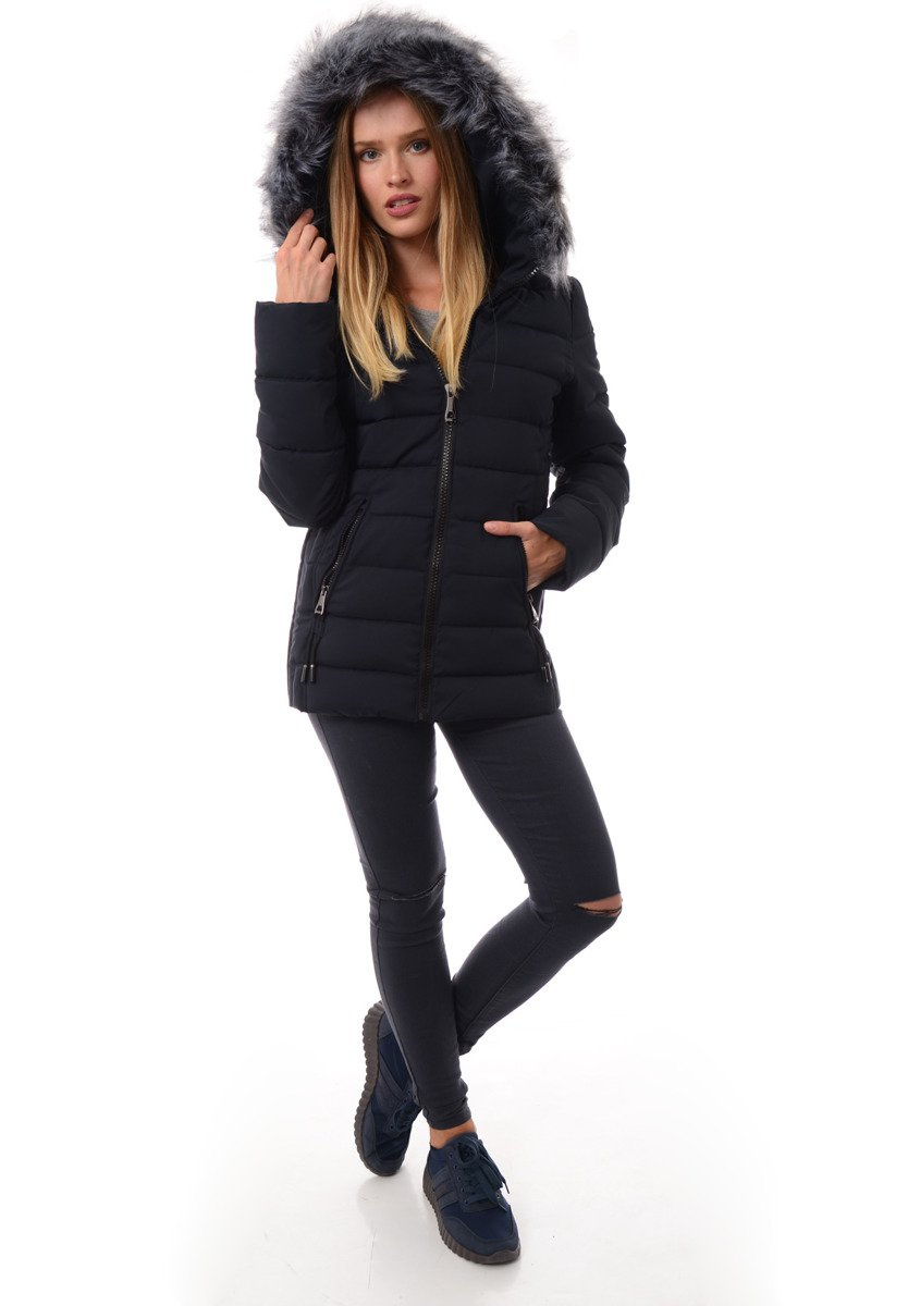 Najmodniejsza w tym sezonie kurtka damska w kolorze ciemnego granatu. Wypełnienie kurtki zapewnia ciepło w mroźne dni. Kurtka zapinana jest na suwak. Kurtka posiada z przodu dwie kieszenie zasuwane na suwak. Nieodpinany kaptur ze ściągaczem z odpinanym futerkiem zapewnia ciepło w wietrzne zimowe dni. Kurtka ma bawełniane ściągacze w mankietach. Ozdobne sznurki przy kieszeniach kurtki dodają jej uroku. Kurtka wykonana jest z materiałów najwyższej jakości.