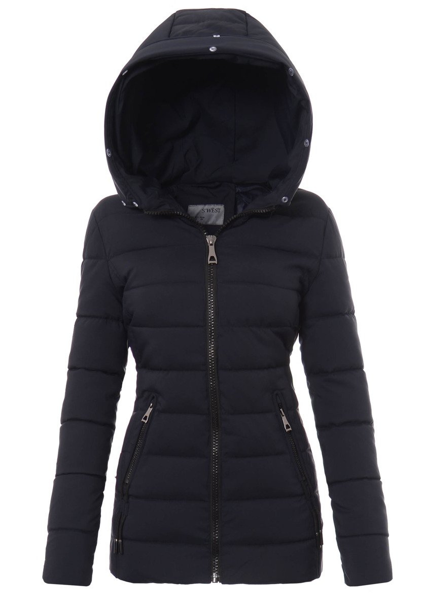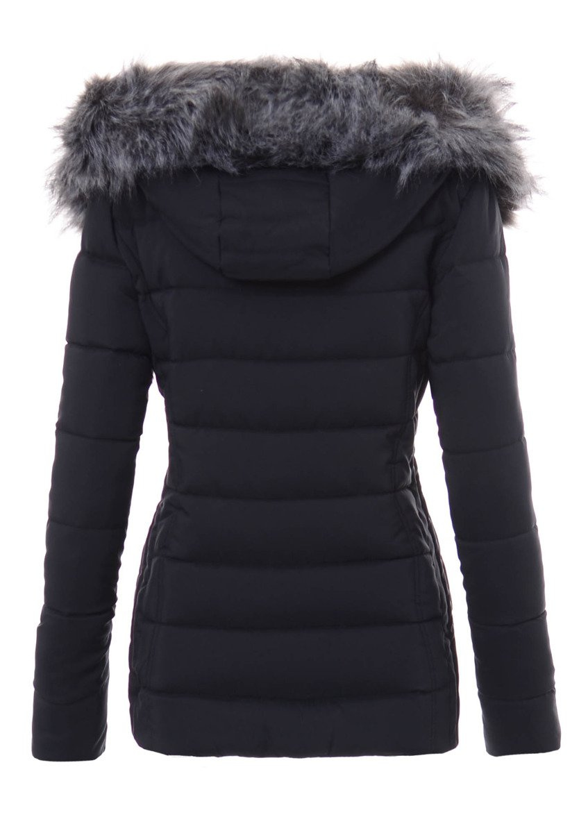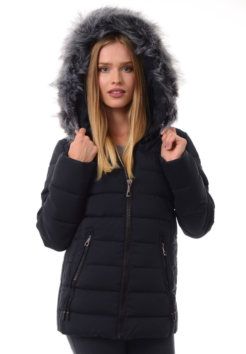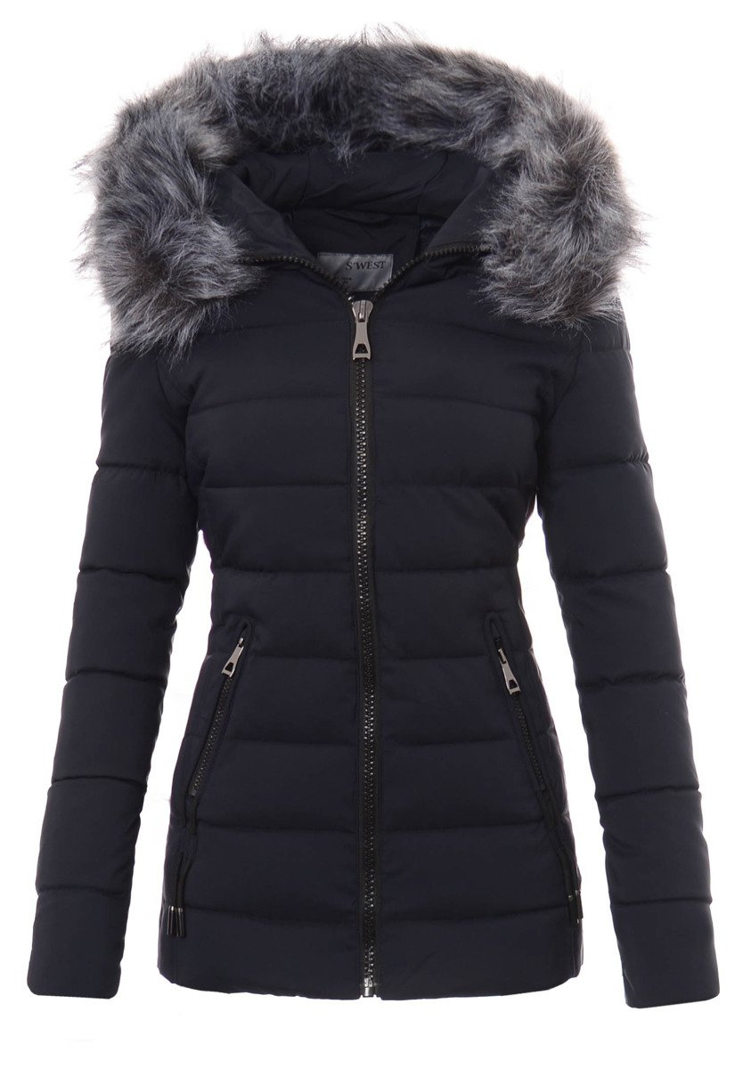 Najmodniejsza w tym sezonie kurtka damska w kolorze ciemnego granatu. Wypełnienie kurtki zapewnia ciepło w mroźne dni. Kurtka zapinana jest na suwak. Kurtka posiada z przodu dwie kieszenie zasuwane na suwak. Nieodpinany kaptur ze ściągaczem z odpinanym futerkiem zapewnia ciepło w wietrzne zimowe dni. Kurtka ma bawełniane ściągacze w mankietach. Ozdobne sznurki przy kieszeniach kurtki dodają jej uroku. Kurtka wykonana jest z materiałów najwyższej jakości.