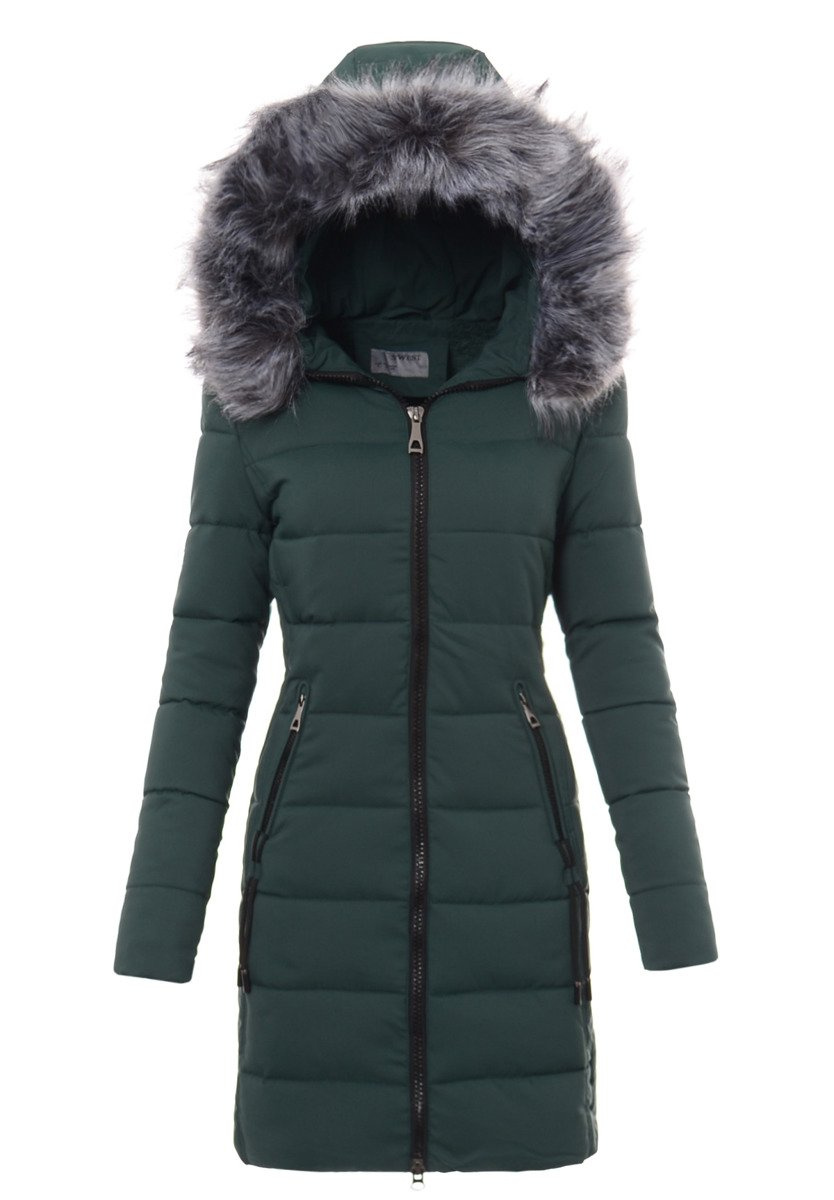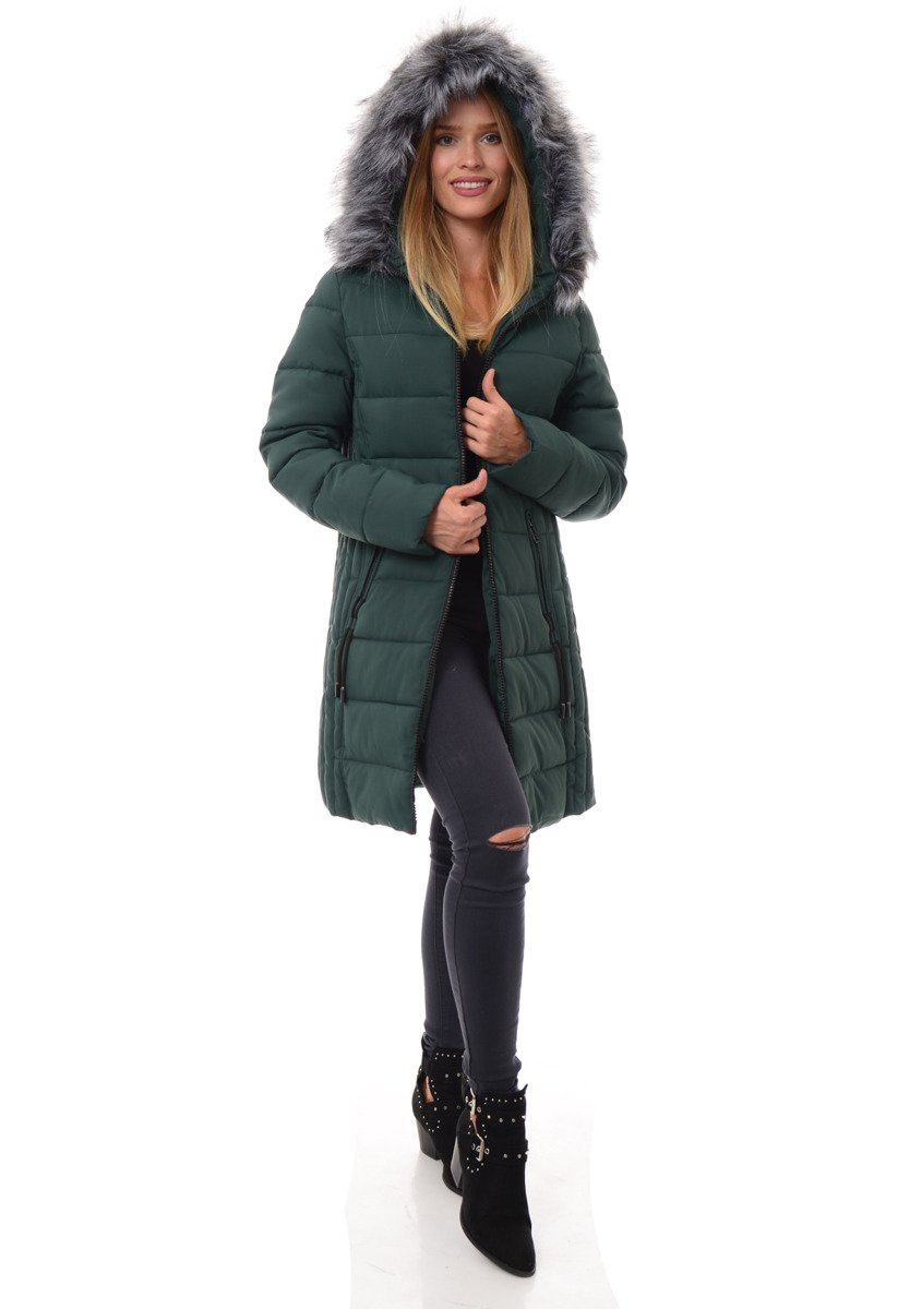 Najmodniejsza w tym sezonie kurtka damska w kolorze butelkowej zieleni. Wypełnienie kurtki zapewnia ciepło w mroźne dni. Dodatkowo kurtka na wysokości tułowia w środku ocieplona jest futerkiem. Kurtka zapinana jest na podwójny suwak. Kurtka posiada z przodu dwie kieszenie zasuwane na suwak. Nieodpinany kaptur z odpinanym futerkiem zapewnia ciepło w wietrzne zimowe dni. Kurtka ma bawełniane ściągacze w mankietach. Ozdobne sznurki przy kieszeniach kurtki dodają jej uroku. Kurtka wykonana jest z materiałów najwyższej jakości.