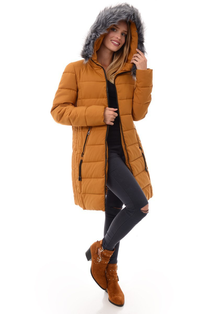 Najmodniejsza w tym sezonie kurtka damska w kolorze camel. Wypełnienie kurtki zapewnia ciepło w mroźne dni. Dodatkowo kurtka na wysokości tułowia w środku ocieplona jest futerkiem. Kurtka zapinana jest na podwójny suwak. Kurtka posiada z przodu dwie kieszenie zasuwane na suwak. Nieodpinany kaptur
