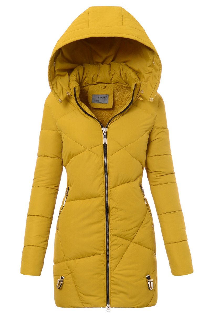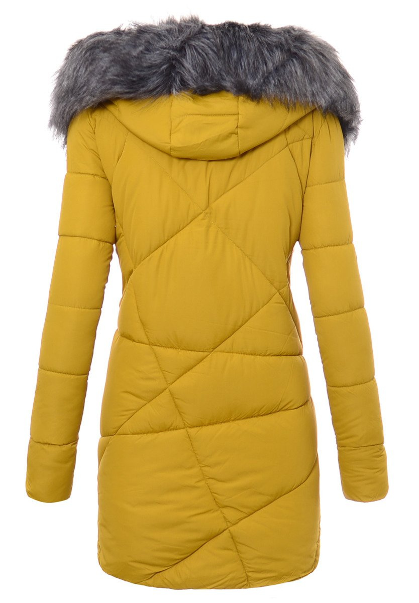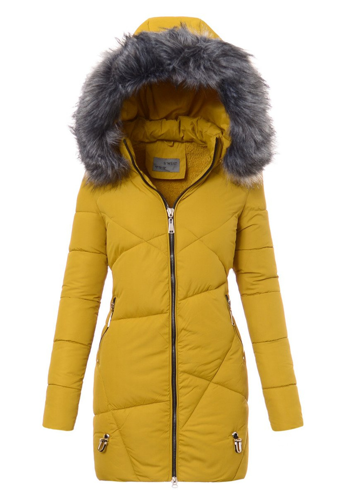 Najmodniejsza w tym sezonie kurtka damska w kolorze żółtym. Wypełnienie kurtki zapewnia ciepło w mroźne dni. Dodatkowo kurtka na wysokości tułowia w środku ocieplona jest futerkiem. Kurtka zasuwana jest na podwójny suwak. Kurtka posiada z przodu dwie kieszenie zasuwane na suwak. Odpinany kaptur ze ściągaczem z odpinanym futerkiem zapewnia ciepło w wietrzne zimowe dni. Kurtka ma bawełniane ściągacze w mankietach. Tył kurtki jest dłuży o ok. 6cm. Kurtka wykonana jest z materiałów najwyższej jakości.