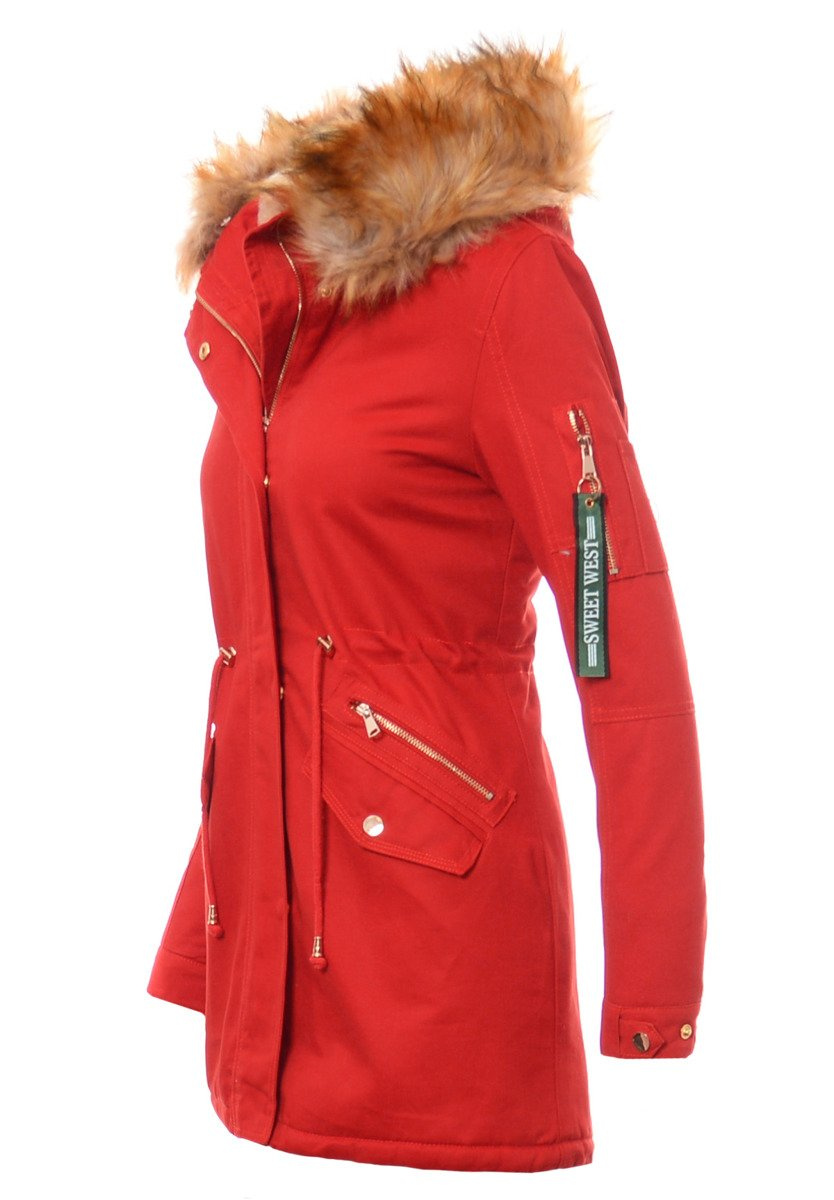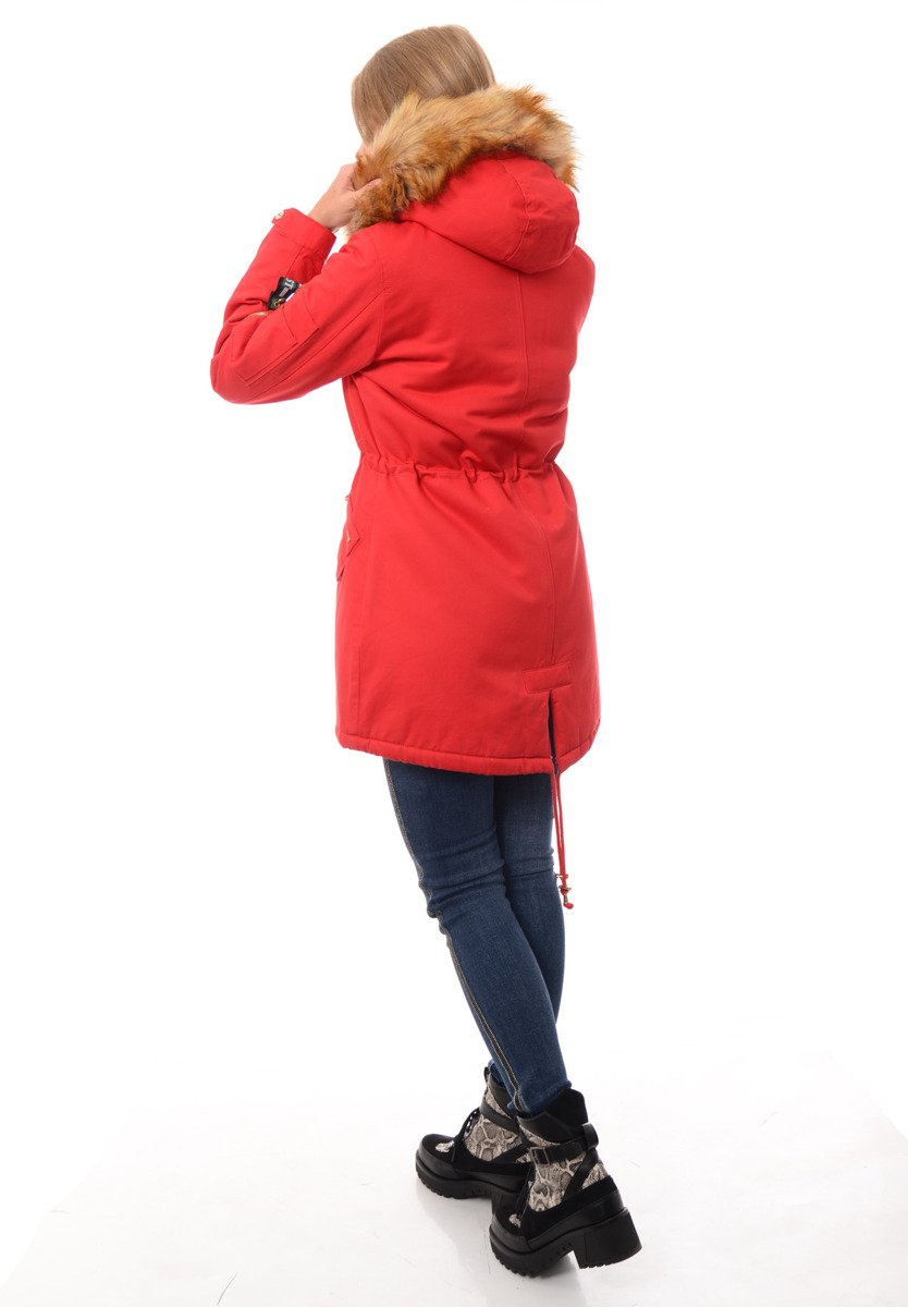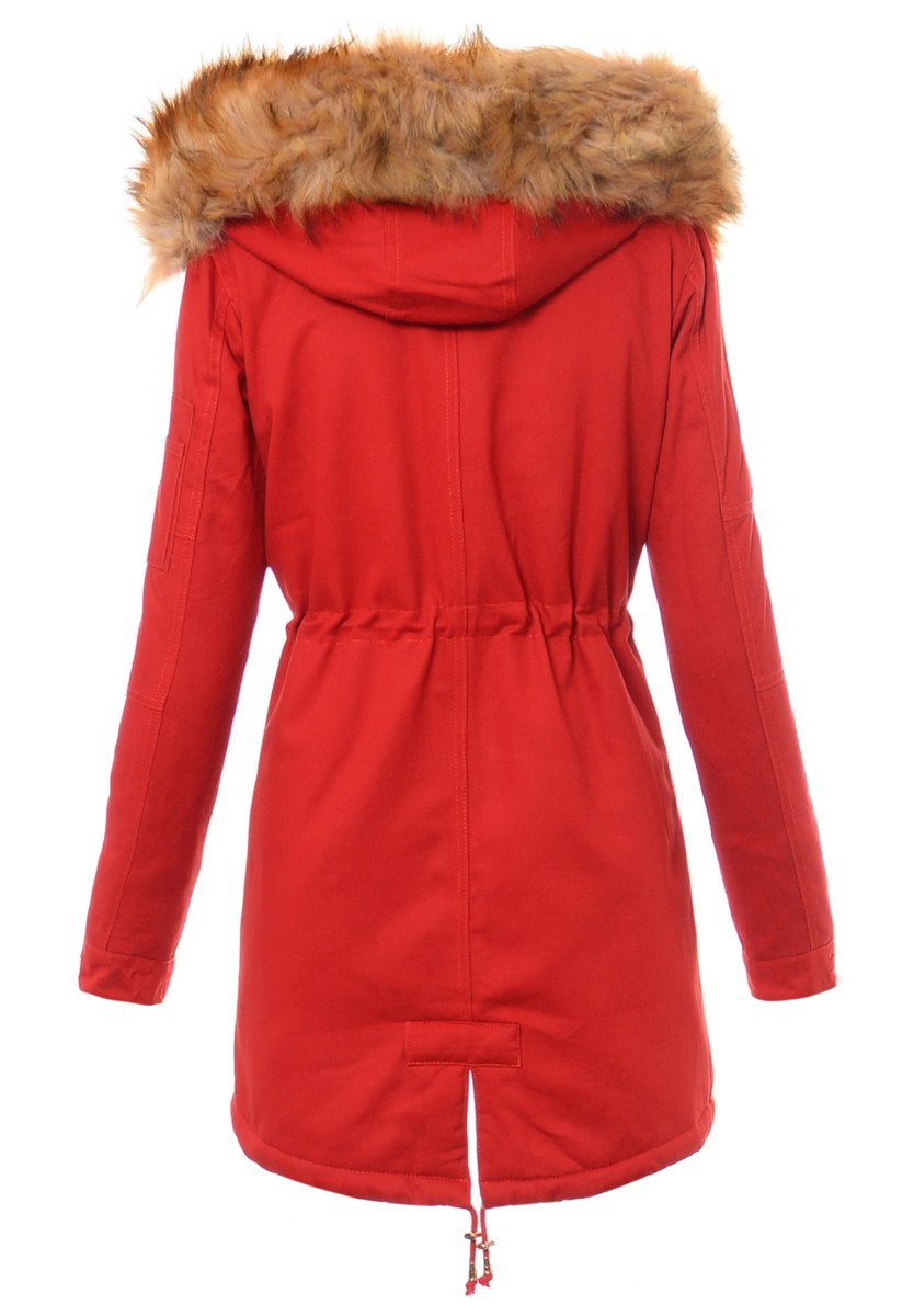Rewelacyjna, najmodniejsza w tym sezonie zimowa kurtka parka w kolorze malinowym. Parka zapinana jest na suwak oraz napy. Kurtka ocieplana jest przyjemnym futerkiem na całej długości oraz w kapturze, rękawy kurtki są ocieplone, wykończone podszewką. Futerko przy kapturze kurtki jest odpinane. Nieodpinany kaptur zapewni ciepło w mroźne i wietrzne dni. Ściągacz w pasie oraz na dole na troczki pozwala na dowolne dopasowanie kurtki do sylwetki. Kurtka posiada dwie kieszenie na dole zapinane na napy, a nad nimi ozdobne suwaki. Kieszeń na lewym ramieniu zasuwana jest na suwak. (zawieszka przy suwaku jest odpinana) Kurtka w mankietach posiada bawełniane ściągacze oraz regulację napami. Napy oraz suwak w kurtce są w kolorze złotym. Tył kurtki jest dłuższy o ok. 8 cm od jej przodu. Kurtka w mankietach posiada gumkę ściągającą, oraz regulację mankietów guzikami. Kurtka wykonana jest z materiałów najwyższej jakości. Materiał: 100% Bawełna.