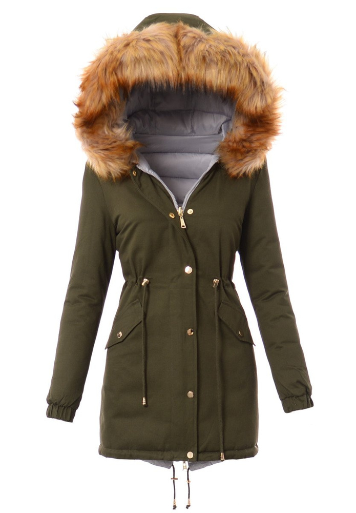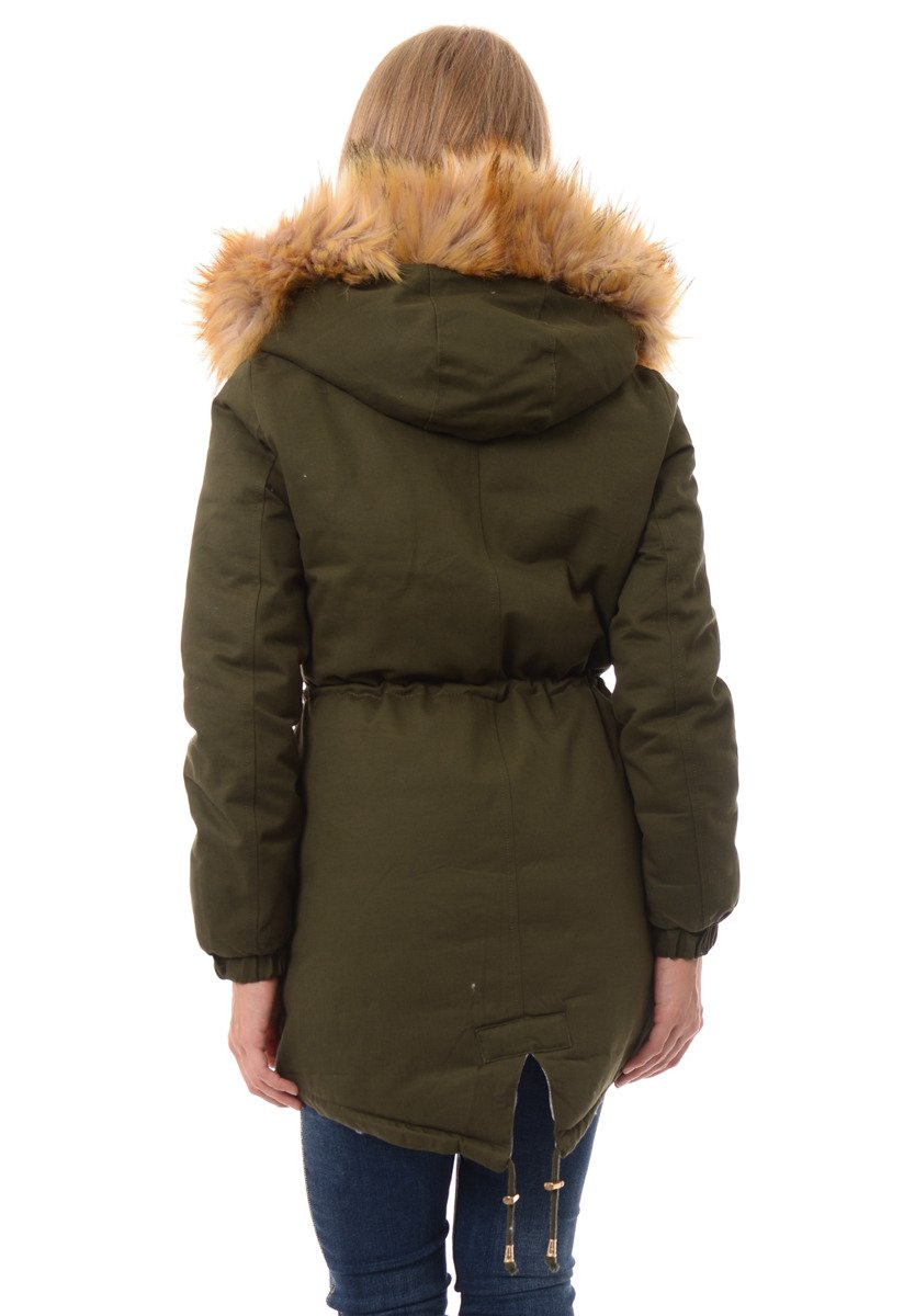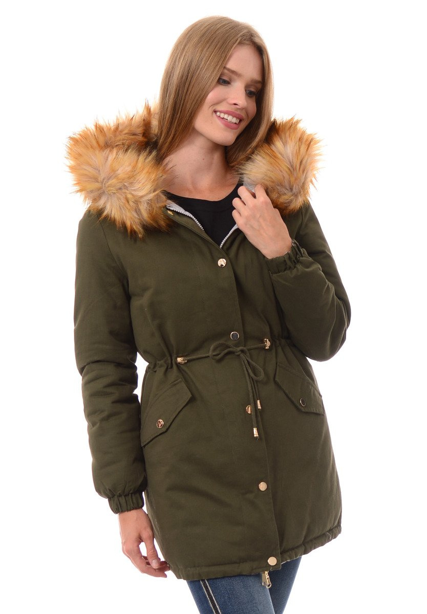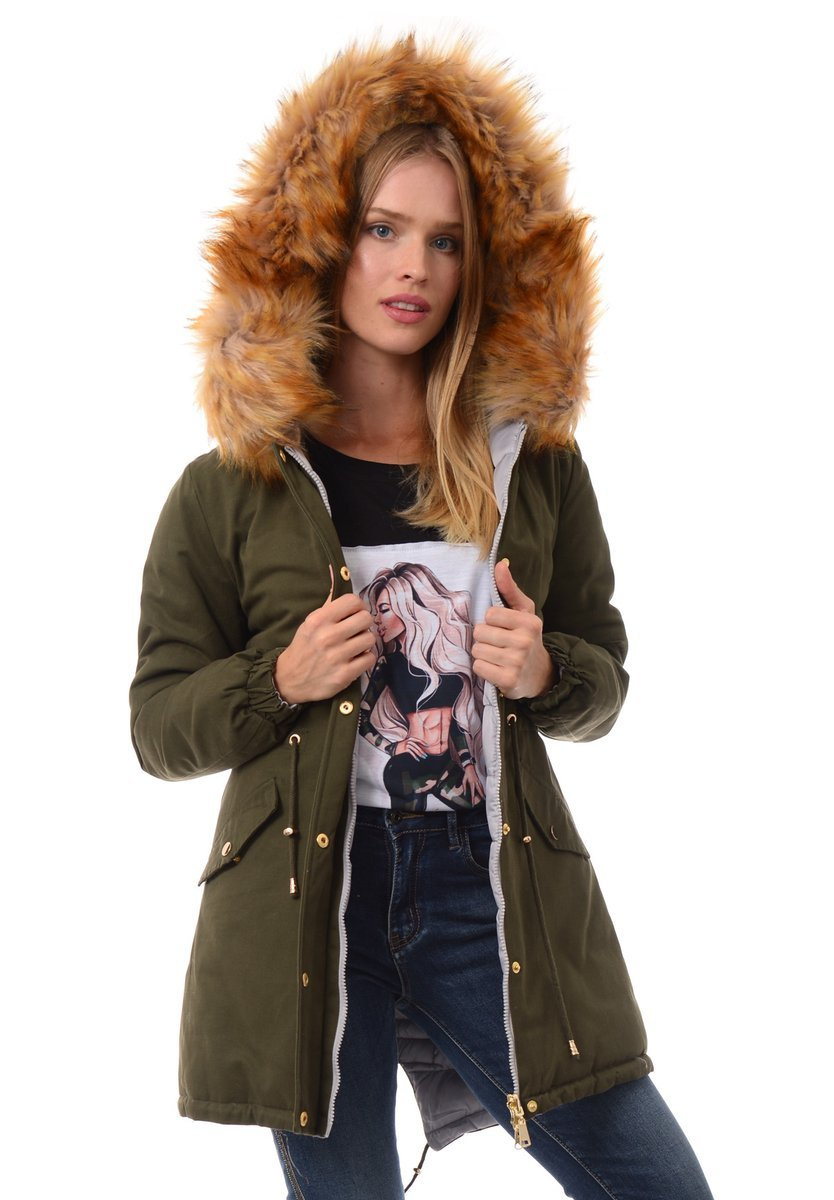 Rewelacyjna dwustronna kurtka damska w kolorze khaki/szara. Wypełnienie kurtki zapewnia ciepło w mroźne dni. Kurtka zapinana na suwak i napy. Kurtka posiada z przodu dwie kieszenie zapinane na napy. Nieodpinany kaptur zapewnia ciepło w wietrzne zimowe dni. Futerko przy kapturze kurtki jest odpinane. Suwaki i ozdoby kurtki w kolorze złotym. Ściągacz w pasie i na dole pozwala na lepsze dopasowanie kurtki do sylwetki. Kurtka wykonana jest z materiałów najwyższej jakości. Kurtka ocieplona jest bardzo wysokiej jakości wypełnieniem syntetycznym, które zapewnia doskonałą termoizolację oraz wysoki komfort użytkowania.