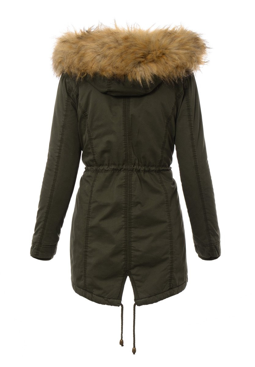 Rewelacyjna kurtka damska typu parka w kolorze zielonym z białym futerkiem. Kurtka zapinana na suwak i napy. Od wewnątrz dodatkowo ocieplona futerkiem. Kurtka posiada z przodu dwie kieszenie zapinane na guziki. Odpinany kaptur ze ściągaczem zapewnia ciepło w wietrzne zimowe dni. Futerko przy kapturze kurtki jest odpinane.  Ściągacz na dole i w pasie pozwala na dowolne dopasowanie kurtki do sylwetki. Kurtka wykonana jest z materiałów najwyższej jakości. Kurtka ocieplona jest bardzo wysokiej jakości wypełnieniem syntetycznym. Tył kurtki jest dłuższy od przodu o około 5 cm. Bawełniany ściągacz w mankietach.