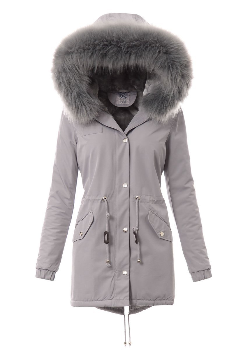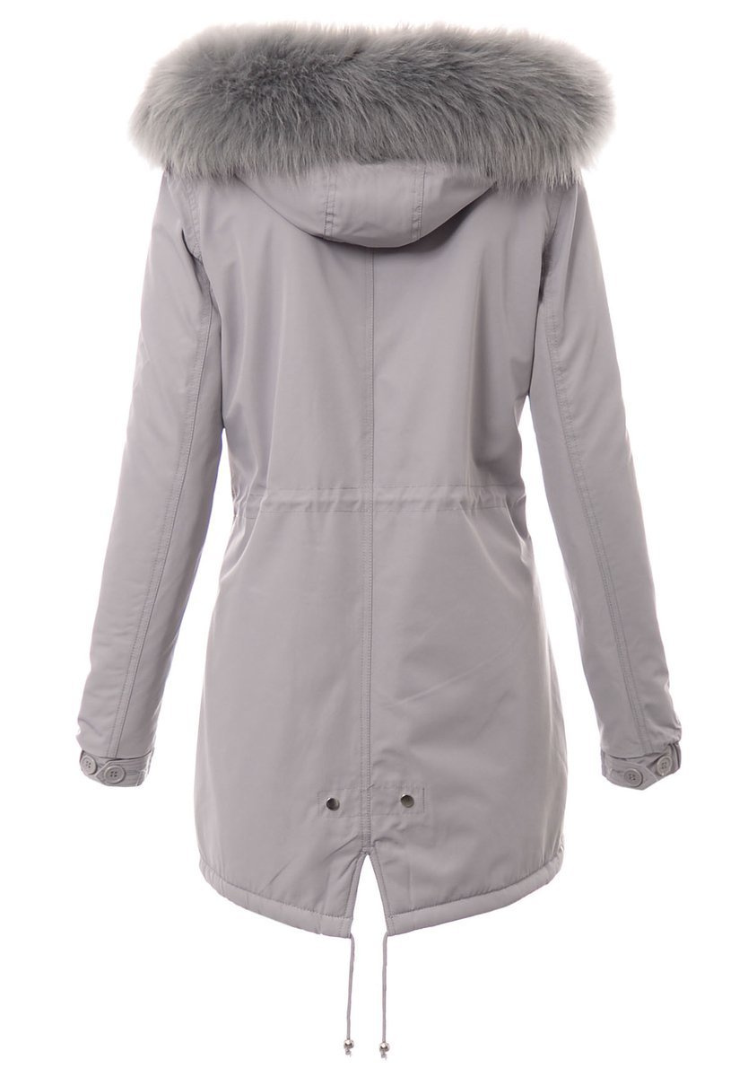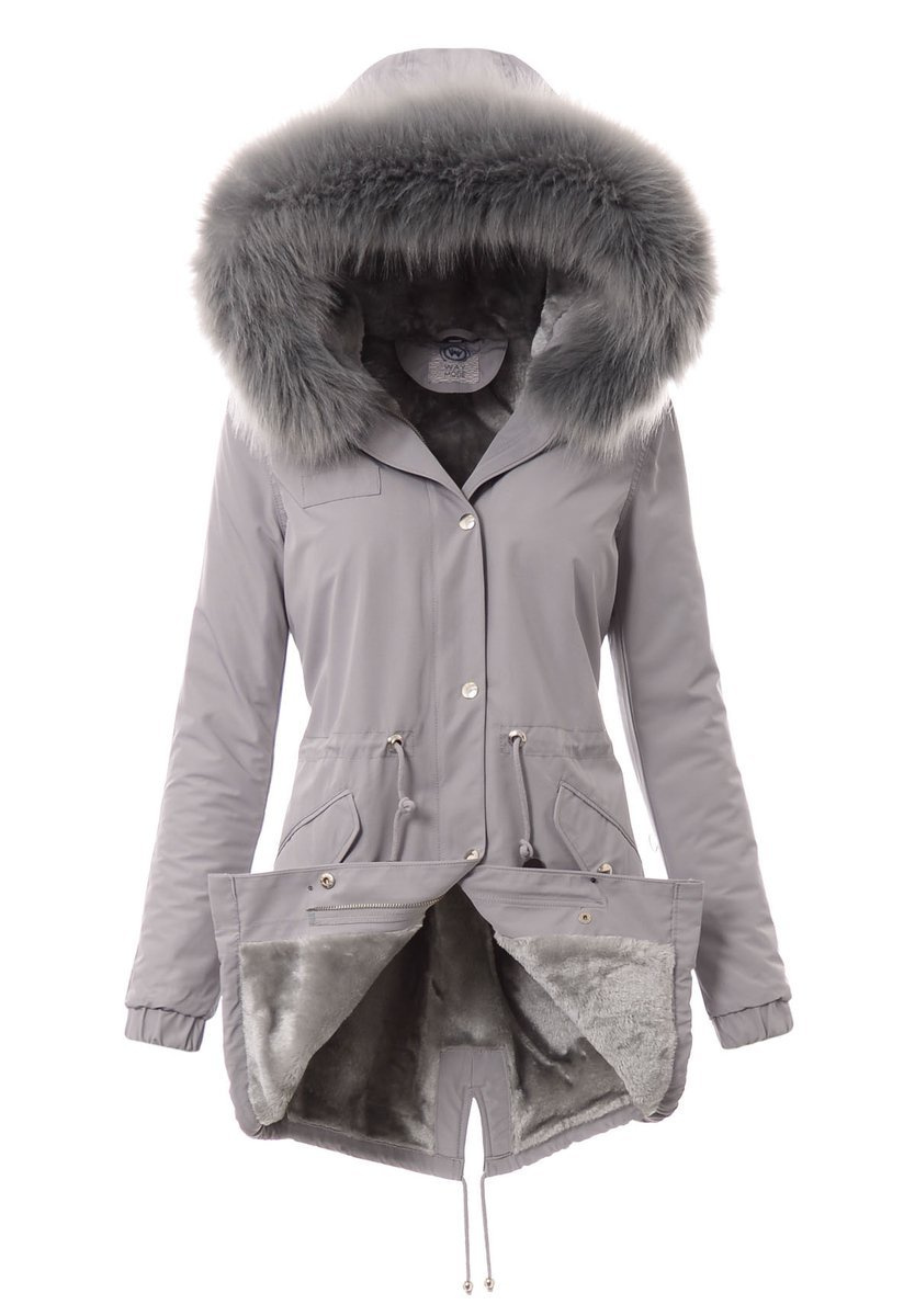 Rewelacyjna parka w kolorze szarym. Parka zapinana jest na suwak oraz napy. Kurtka ocieplana jest przyjemnym futerkiem na całej długości oraz w kapturze, rękawy kurtki są ocieplone, wykończone podszewką. Futerko przy kapturze kurtki jest odpinane. Nieodpinany kaptur zapewni ciepło w mroźne i wietrzne dni. Ściągacz w pasie oraz na dole na troczki pozwala na dowolne dopasowanie kurtki do sylwetki. Kurtka posiada dwie kieszenie z przodu na dole zapinane na napy. Napy oraz suwak w kurtce są w kolorze srebrnym. Tył kurtki jest dłuższy o ok. 5 cm od jej przodu. Kurtka wykonana jest z najwyższej jakości materiałów. Materiał: 100% Poliester.