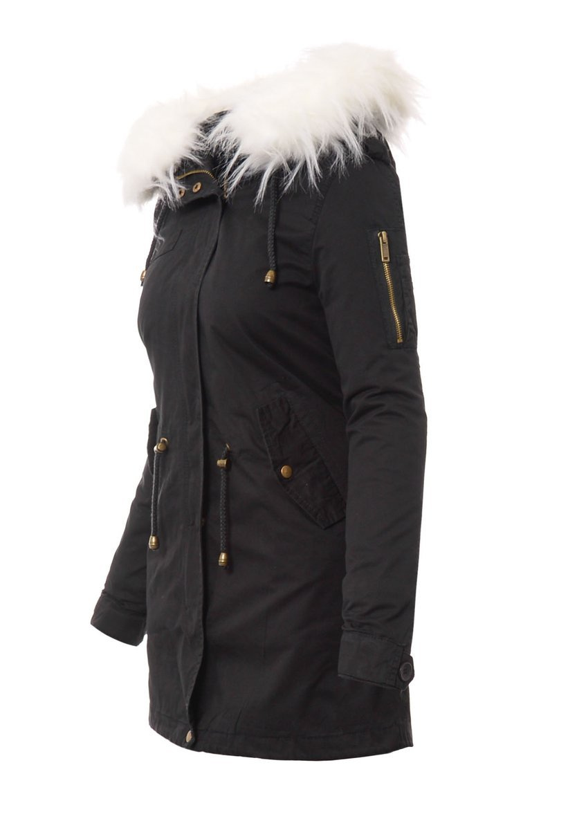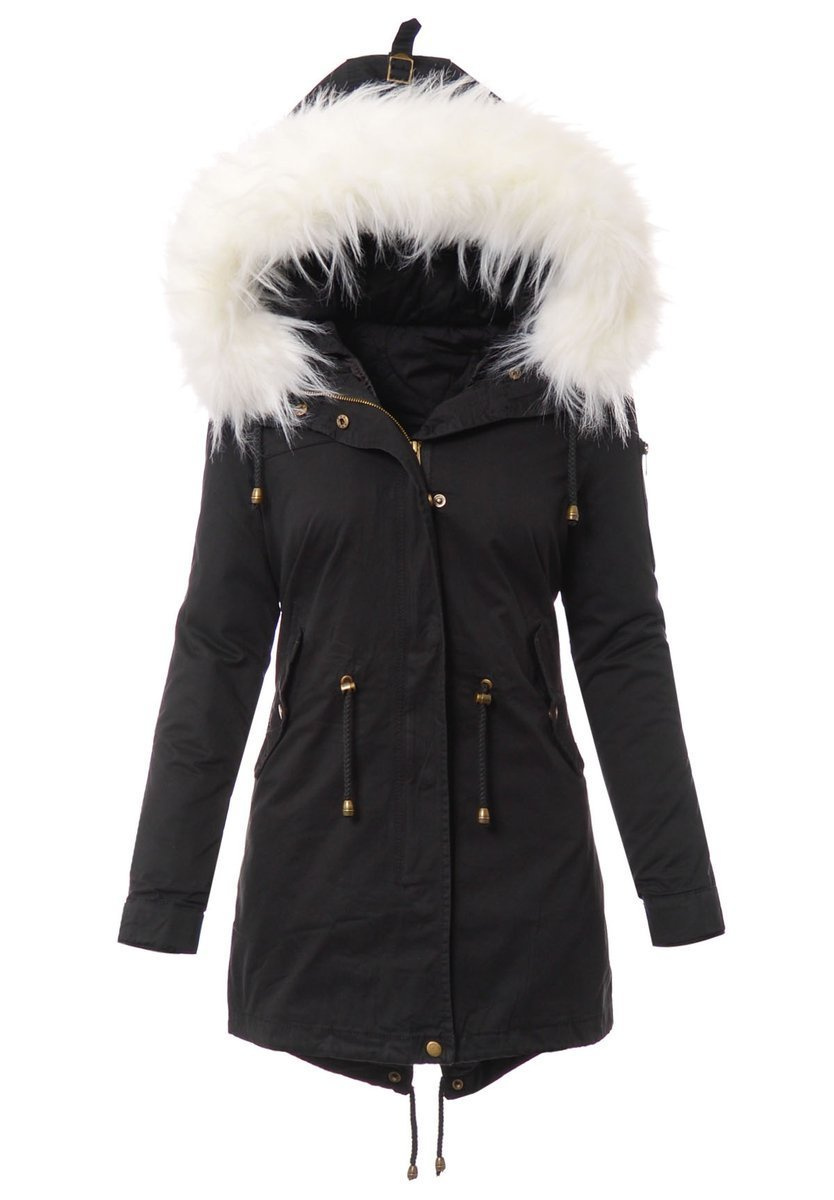 Rewelacyjna kurtka damska typu parka w kolorze czarnym z białym futerkiem. Kurtka posiada odpinaną podpinkę dzięki czemu idealnie sprawdzi się również jako kurtka jesienno - wiosenna. Kurtka zapinana na suwak i napy. Kurtka posiada z przodu dwie kieszenie zapinane na napy. Nieodpinany kaptur ze ściągaczem zapewnia ciepło w wietrzne zimowe dni. Futerko przy kapturze kurtki jest odpinane.  Ściągacz na dole i w pasie pozwala na dowolne dopasowanie kurtki do sylwetki. Kurtka wykonana jest z materiałów najwyższej jakości. Kurtka ocieplona jest bardzo wysokiej jakości wypełnieniem syntetycznym. Tył kurtki jest dłuższy od przodu o około 7 cm. Bawełniany ściągacz w mankietach.