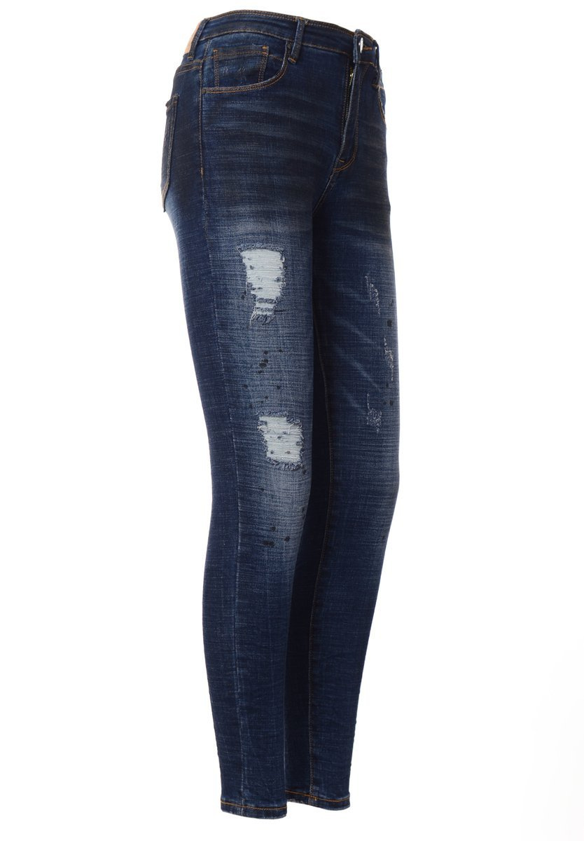 Damskie spodnie rurki w kolorze granatowym z przetarciami i gnieceniami. Spodnie są elastyczne dzięki czemu idealnie dopasowują się do sylwetki. Spodnie mają dwie kieszenie z przodu i z tyłu oraz malutką kieszeń z przodu. Spodnie zapinane są na guzik i suwak. Spodnie wykonane są z materiałów najwyższej jakości. Skład: 80% Bawełna; 15% Poliester; 5% Elastan.