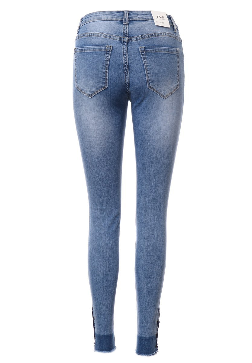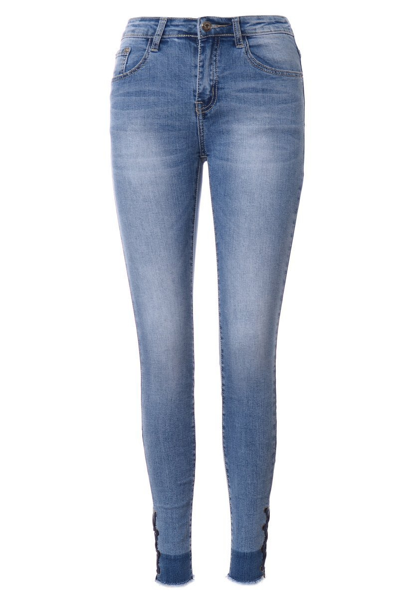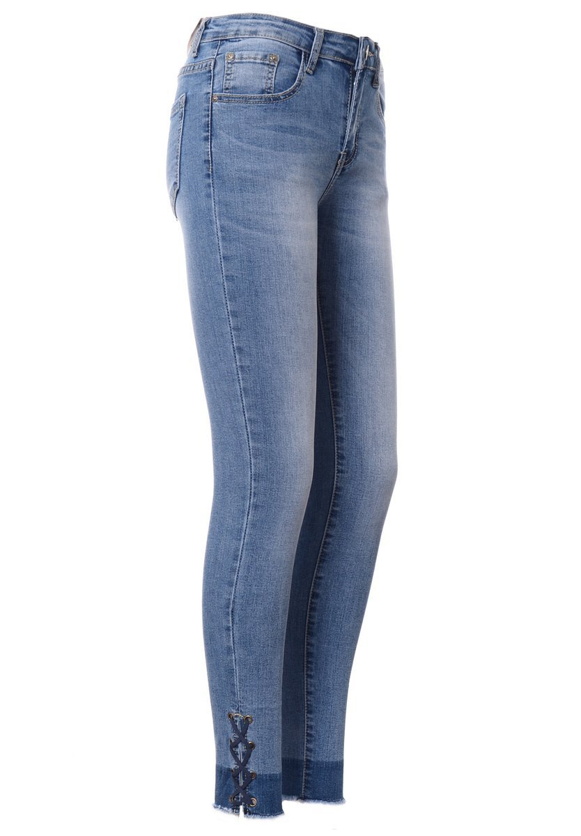 Damskie spodnie rurki w kolorze niebieskim ze sznurowaniami na dole po bokach. Spodnie są elastyczne dzięki czemu idealnie dopasowują się do sylwetki. Spodnie mają dwie kieszenie z przodu i z tyłu oraz malutką kieszeń z przodu. Spodnie zapinane są na guzik i suwak. Spodnie wykonane są z materiałów najwyższej jakości. Skład: 70% Bawełna; 27% Poliester; 1% Viscoza; 2% Elastan.