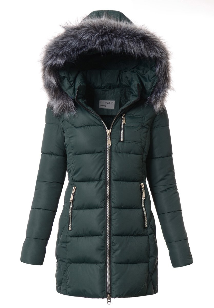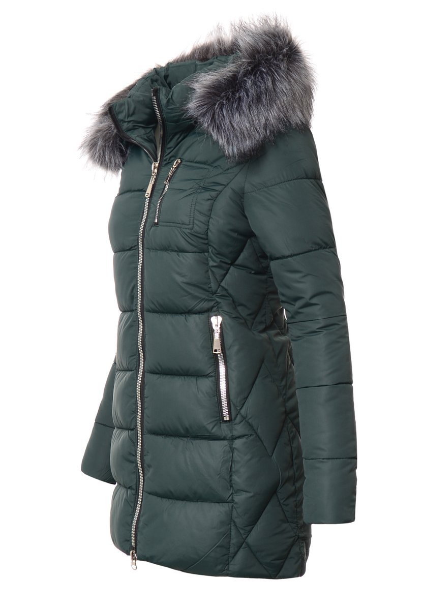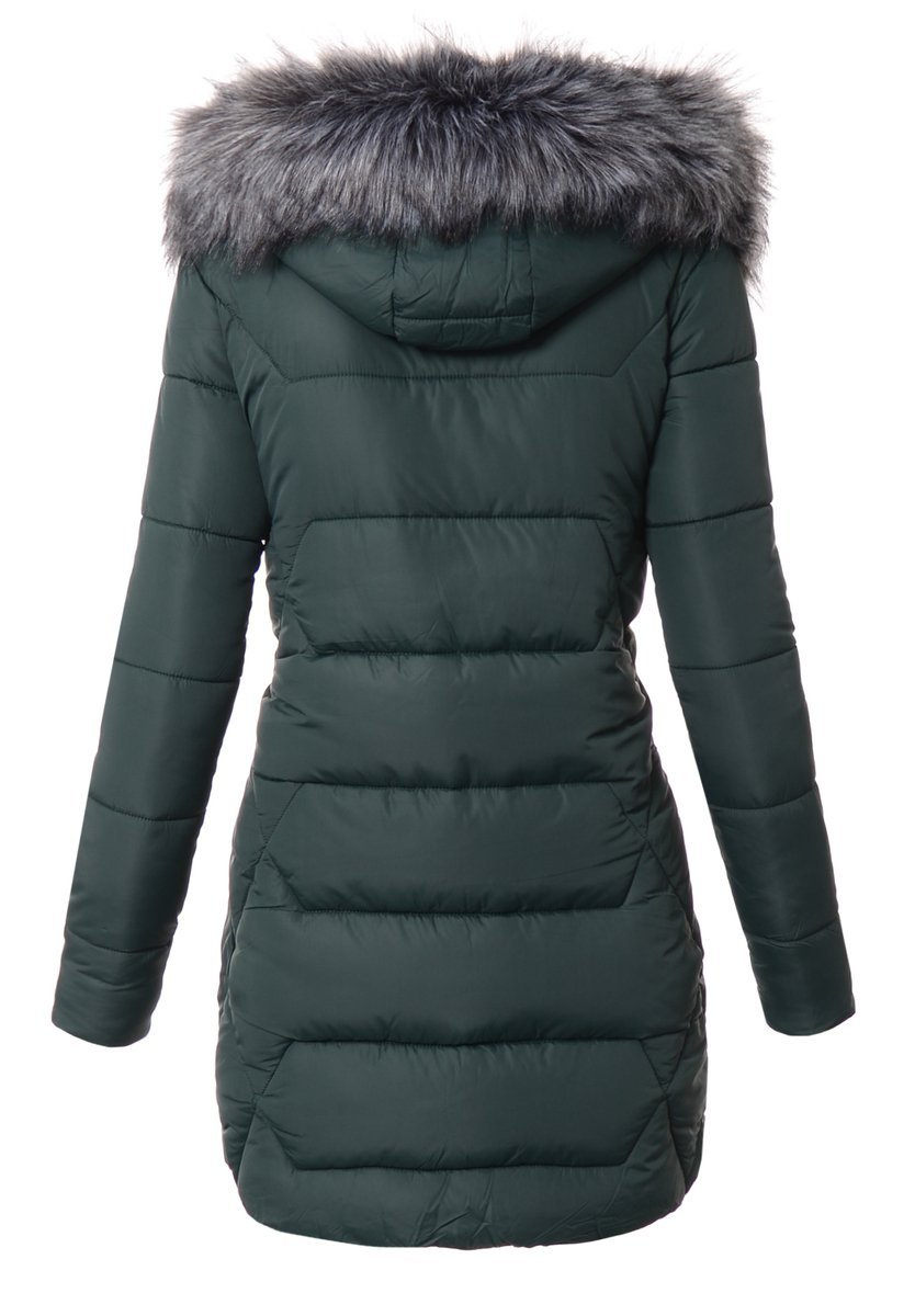 Najmodniejsza w tym sezonie kurtka damska w kolorze zielonym. Wypełnienie kurtki zapewnia ciepło w mroźne dni. Kurtka zasuwana jest na suwak. Kurtka posiada z przodu dwie kieszenie zasuwane na suwak oraz jedną atrapę na górze. Odpinany kaptur z odpinanym futerkiem zapewnia ciepło w wietrzne zimowe dni. Suwaki w kolorze srebrnym. Tył dłuży o ok. 7cm. Kurtka wykonana jest z materiałów najwyższej jakości.
