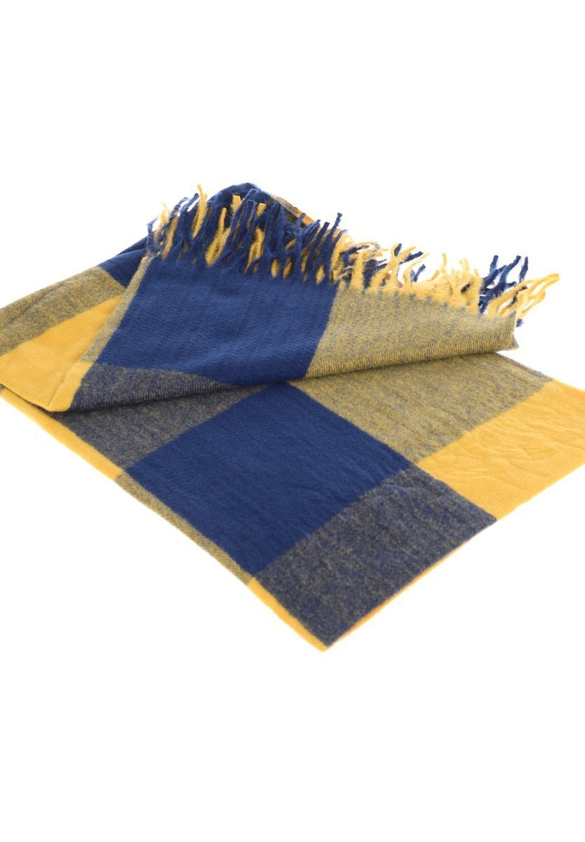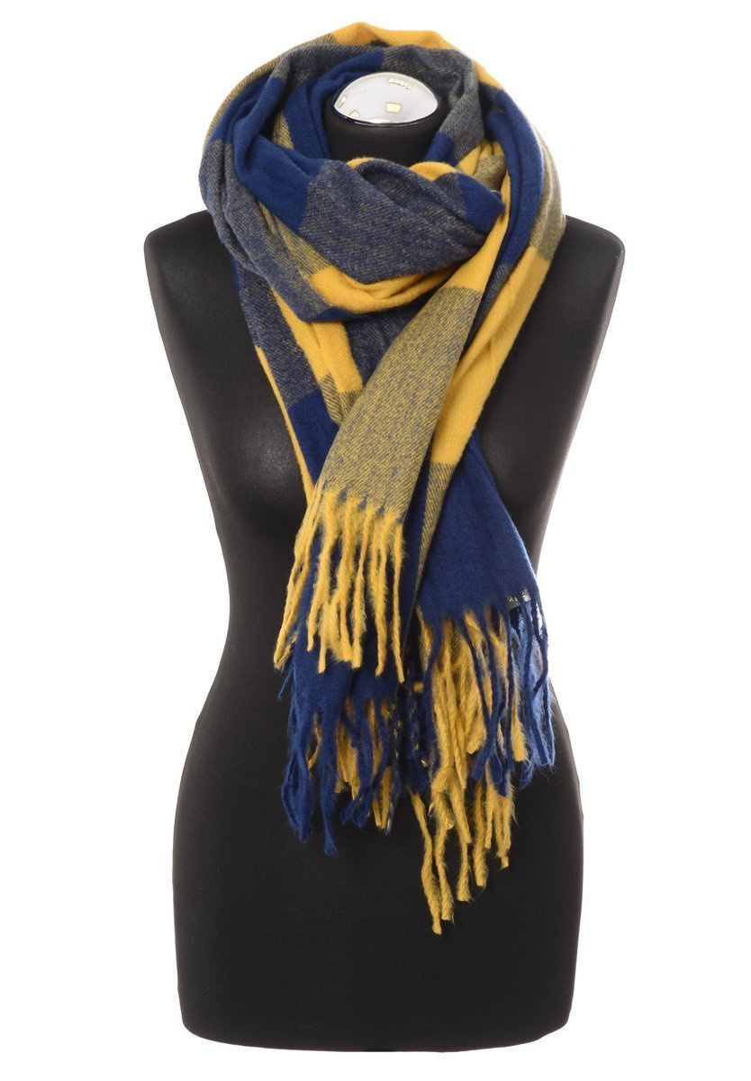 Damski duży szalik w kolorze żółto niebieskim. Szal sprawdzi się idealnie do wielu stylizacji na jesienne oraz zimowe dni. Materiał: 100% Poliester. Wymiary ok. 76 cm x 188 cm.