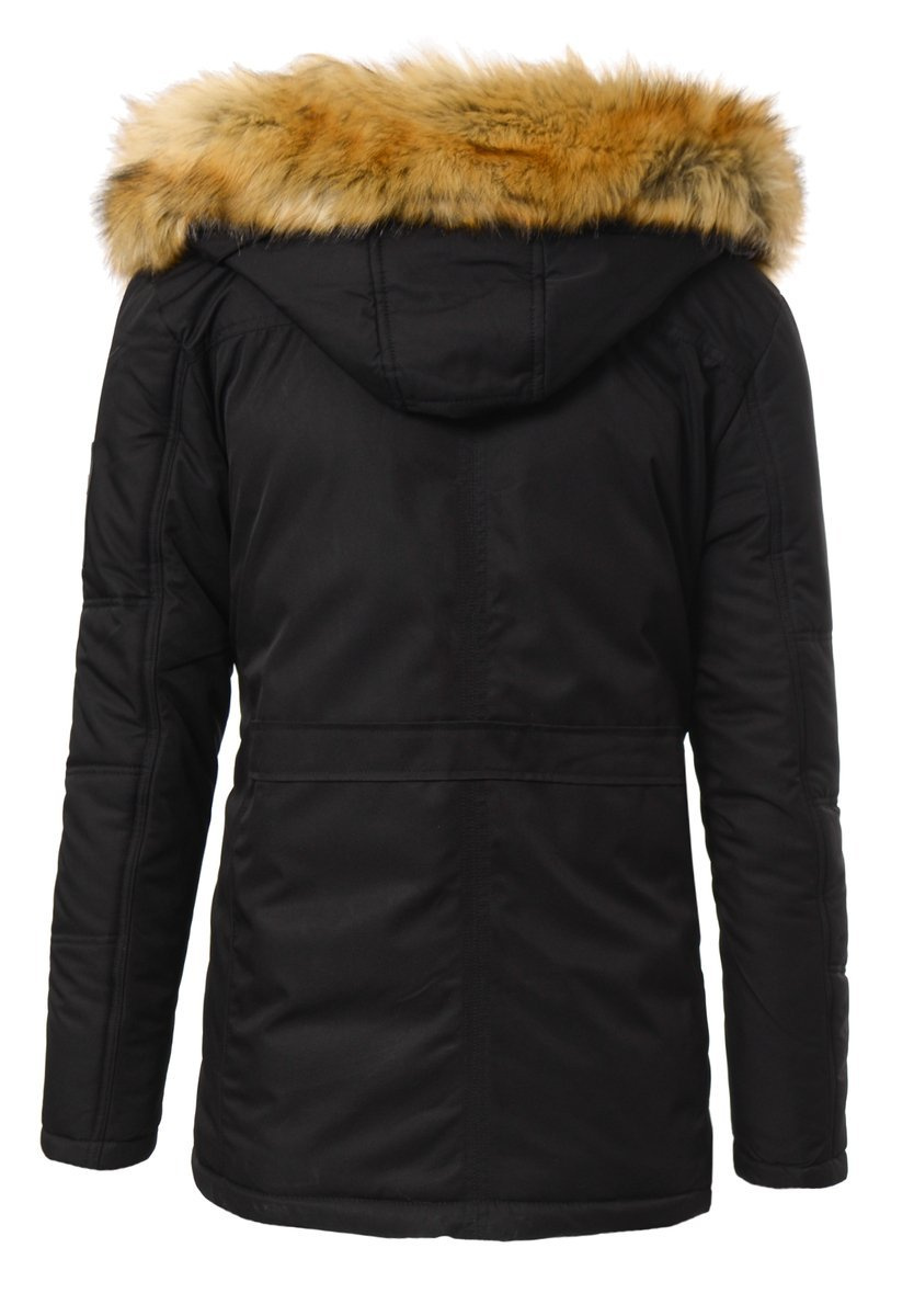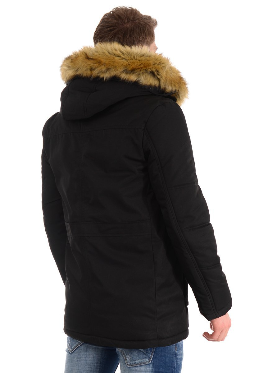 Męska zimowa kurtka w kolorze czarnym. Zapinana na podwójny suwak oraz napy. Kurtka posiada dwie duże kieszenie na dole zapinana na napy oraz dwie kieszenie na piersi zasuwane na suwaki. Odpinany kaptur z odpinanym futerkiem zapewnia ciepło w zimowe, wietrze dni. Kurtka wykonana jest z materiałów najwyższej jakości. Kurtka ocieplona jest bardzo wysokiej jakości wypełnieniem syntetycznym, które zapewnia doskonałą termoizolację oraz wysoki komfort użytkowania.