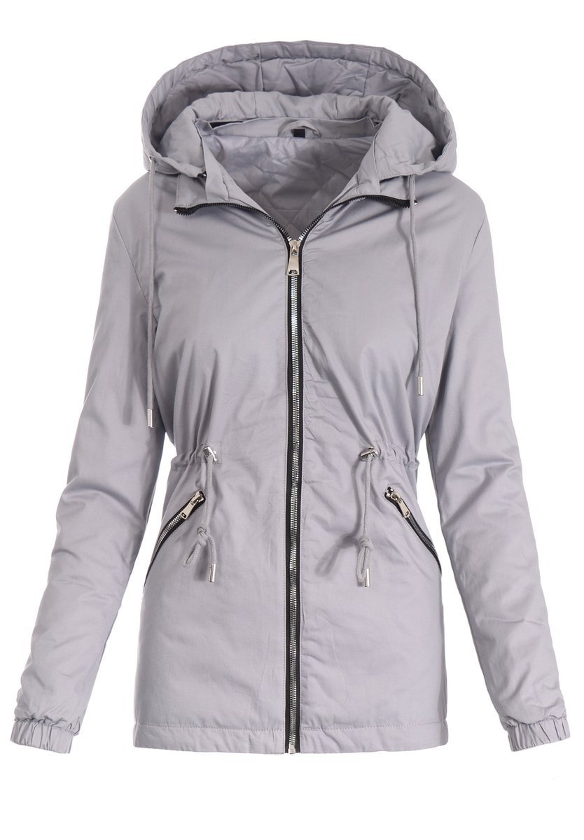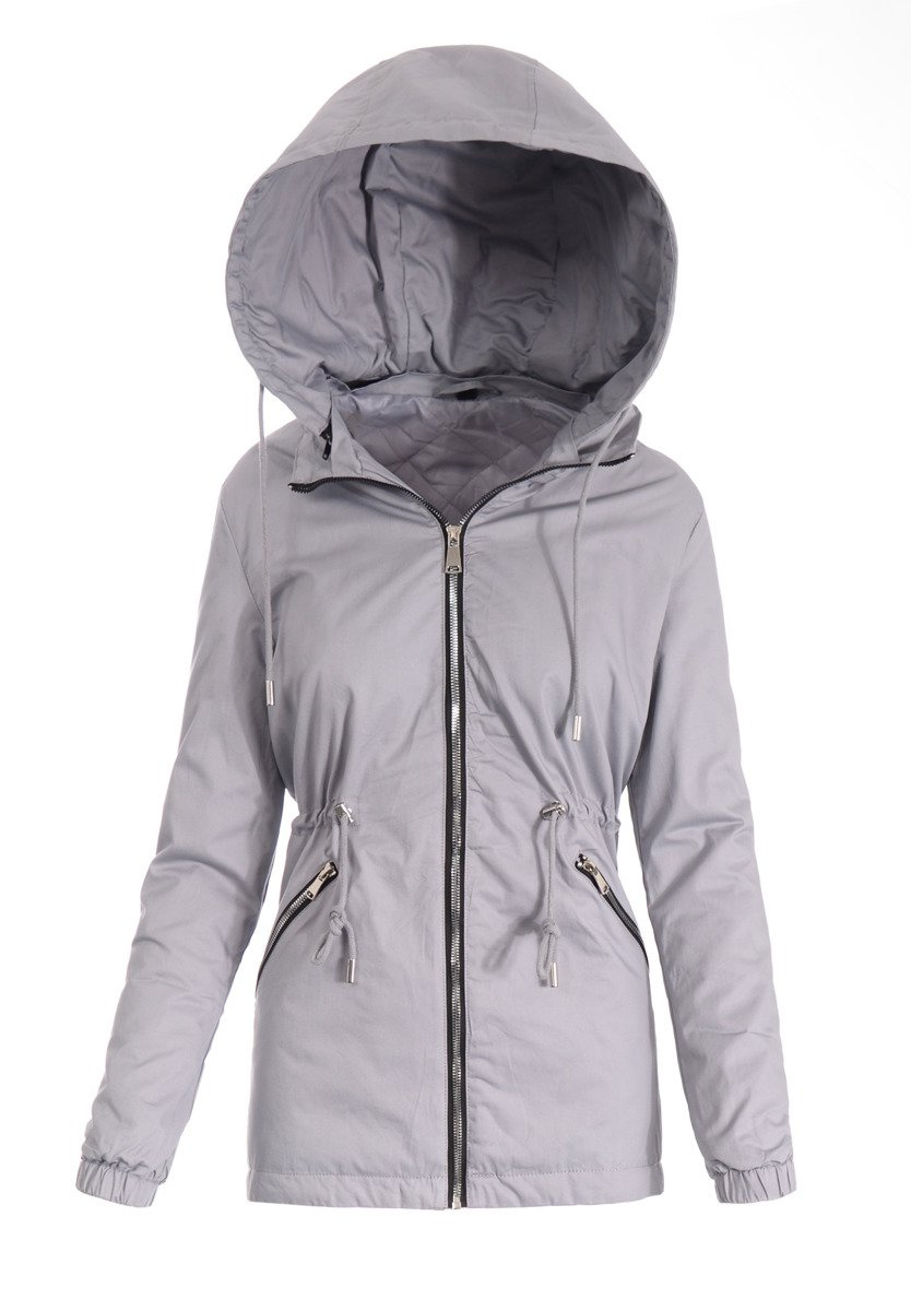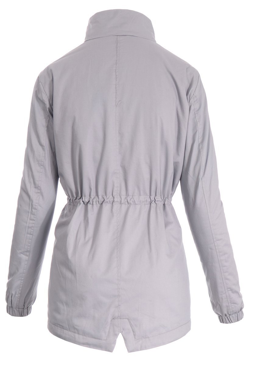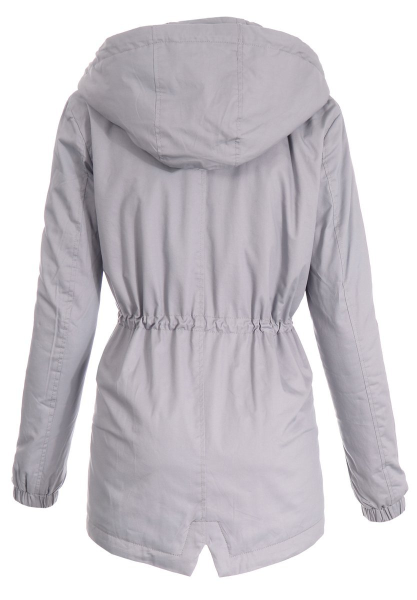 Wiosenna kurtka parka w kolorze szarym. Parka zasuwana jest na suwak. Ściągacz w pasie pozwala na dowolne dopasowanie kurtki do sylwetki. Kurtka posiada dwie kieszenie z przodu na dole zasuwane na suwaki. Kaptur kurtki jest odpinany i posiada ściągacz. Mankiety kurtki posiadają ściągające gumki. Tył kurtki jest dłuższy o ok. 5 cm od jej przodu. Suwaki w kolorze srebrnym. Kurtka wykonana jest z materiałów najwyższej jakości. Materiał: 100% Nylon.