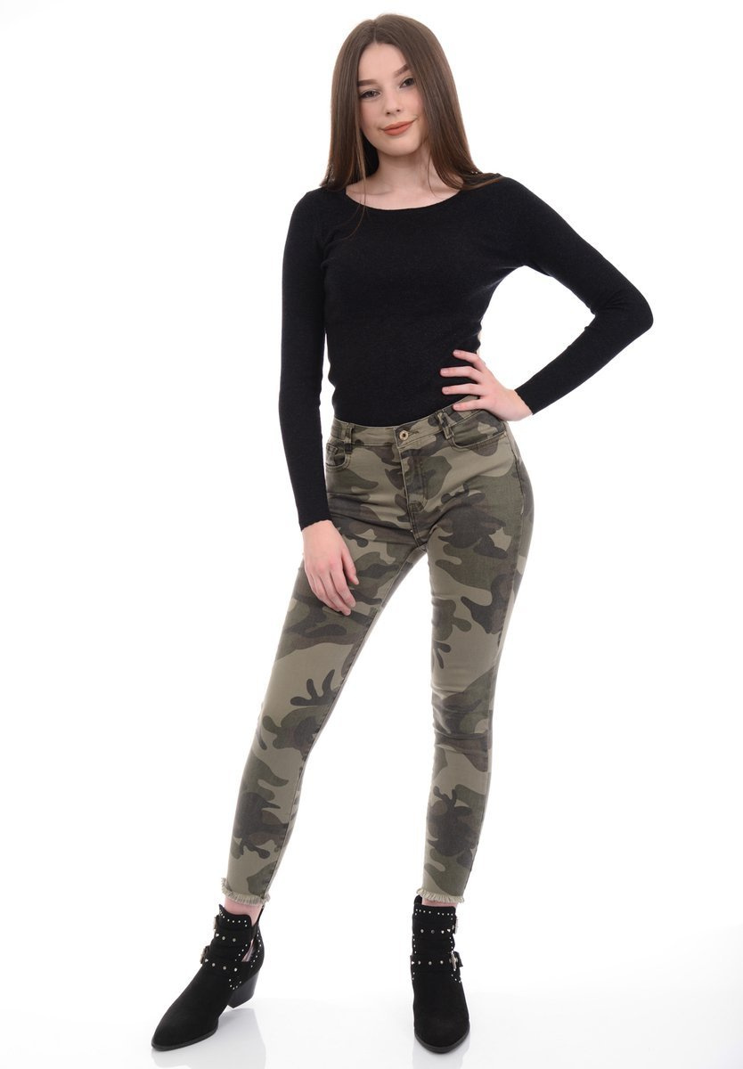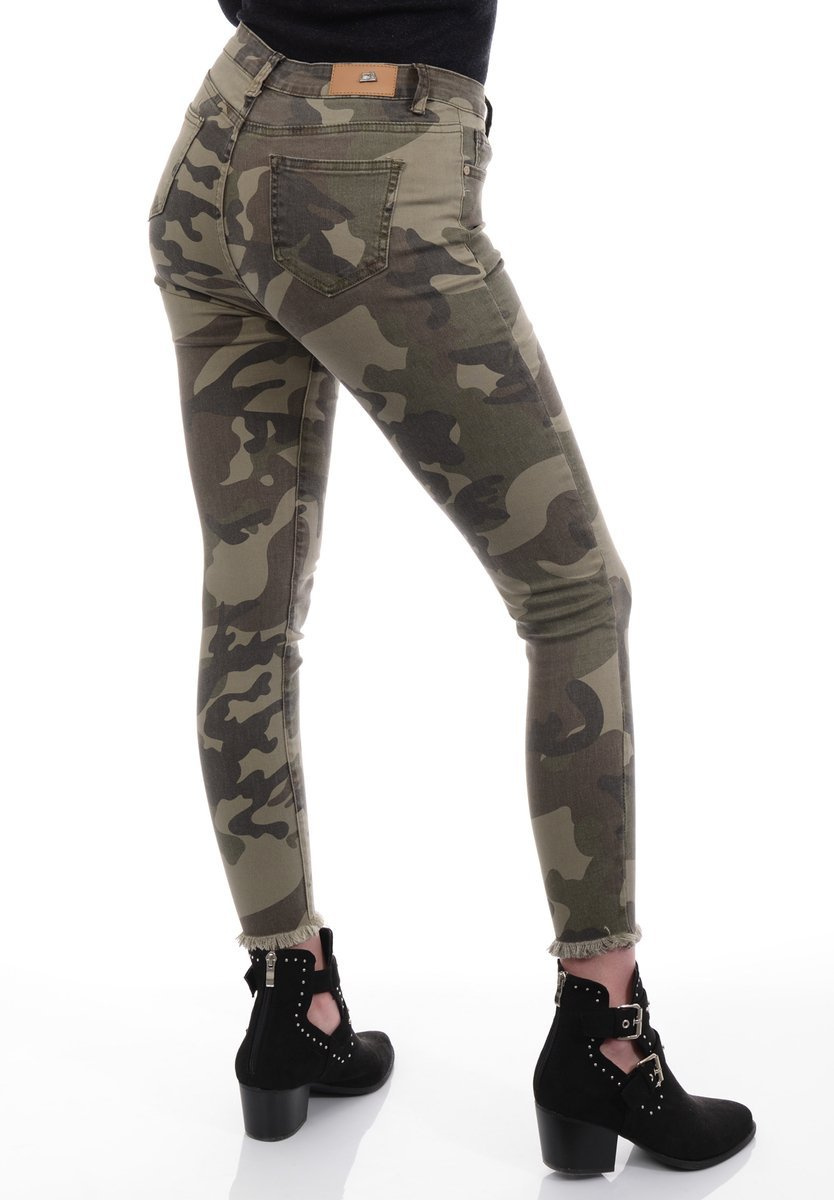 Damskie spodnie w kolorze moro. Spodnie mają dwie kieszenie z przodu i z tyłu oraz malutką kieszeń z przodu. Spodnie zapinane są na guzik oraz suwak, posiadają szlufki w pasie. Spodnie wykonane są z materiałów najwyższej jakości. Skład: 60% Bawełna; 35% Poliester, 3% Elastan.