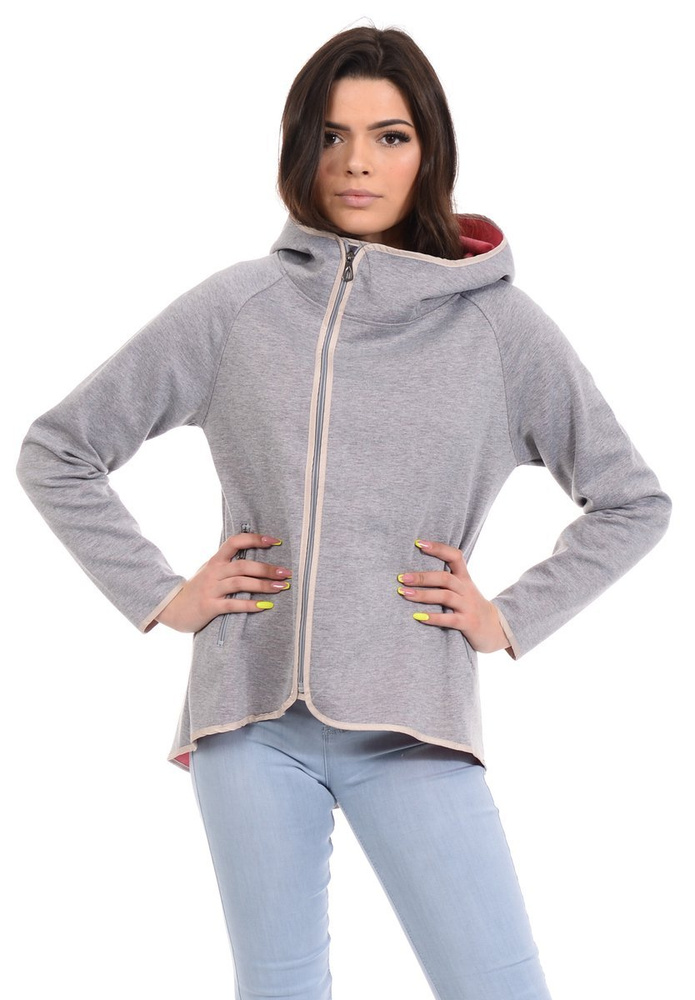 Damska bluza w kolorze szarym zasuwana na suwak. Dwie kieszenie na dole po bokach zapinane na suwak. Tył bluzy dłuższy o ok 19 cm od przodu. Bluza wykonana jest z materiałów najwyższej jakości 65% Poliester, 35% Bawełna.
