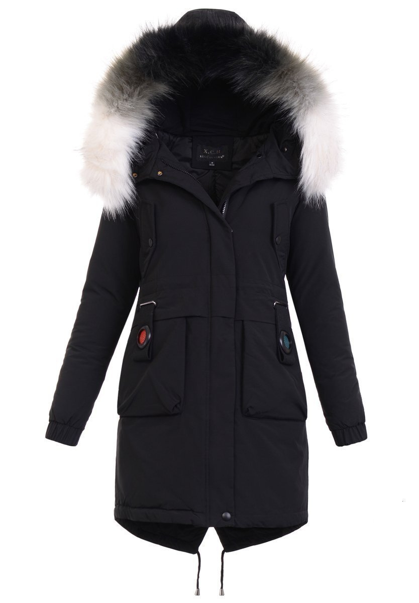 Najmodniejsza w tym sezonie kurtka damska w kolorze czarnym. Wypełnienie kurtki zapewnia ciepło w mroźne dni. Kurtka zasuwana jest na suwak oraz napy. Kurtka posiada z przodu dwie niezapinane kieszenie oraz dwie atrapy kieszeni na piersi zapinane na napy. nieodpinany kaptur z odpinanym futerkiem zapewnia ciepło w wietrzne zimowe dni. Tył kurtki dłuższy o ok. 9 cm. Kurtka wykonana jest z materiałów najwyższej jakości.