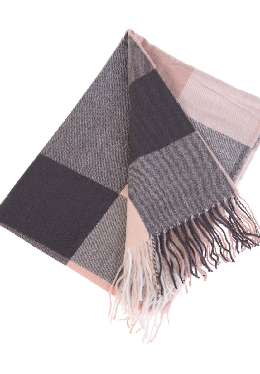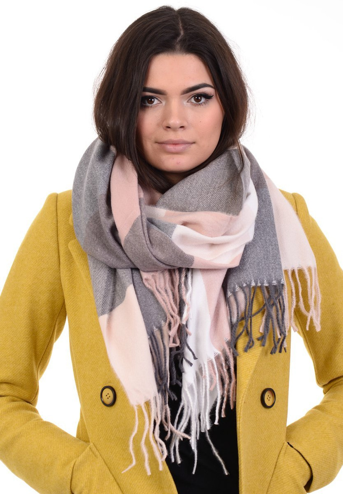 Damski duży szalik w kartę. Szalik w kolorze różowo- szarym. Szal sprawdzi się idealnie do wielu stylizacji na jesienne oraz zimowe dni. Materiał: 100% Poliester. Wymiary ok. 186 cm x 67cm.