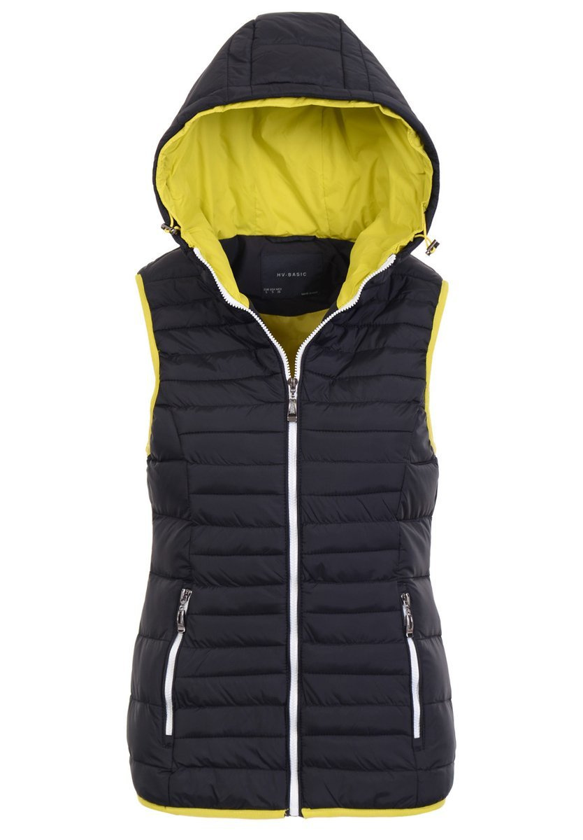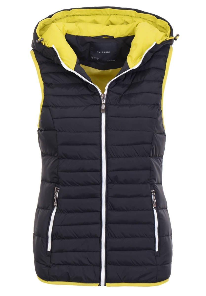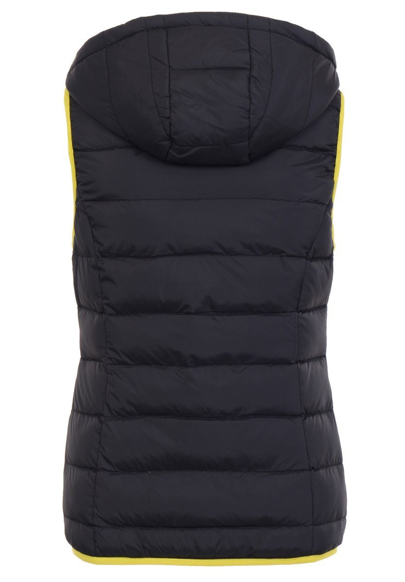 Bezrękawnik damski Basia, koloru czarnego. Dzięki minimalistycznemu projektowi zapewniającemu ciepło, przy bardzo małej wadze, kamizelka sprawdza się jako warstwa pośrednia lub samodzielna w chłodnych i suchych warunkach. Bezrękawnik wyposażony jest w kaptur ze ściągaczem. Wypełnienie kamizelki jest sprężyste i ciepłe, a delikatna powłoka zapewnia lekkość i wytrzymałość. Stylowy bezrękawnik dla kobiet wykończony jest czarnymi akcentami, a u dołu talii wyposażony jest w dwie kieszenie na suwak. Dzięki elastyczności, fason z łatwością dopasowuje się do warstw pod kurtką, natomiast przeszyta konstrukcja dodatkowo zmniejsza wagę, poprawiając wygodę.