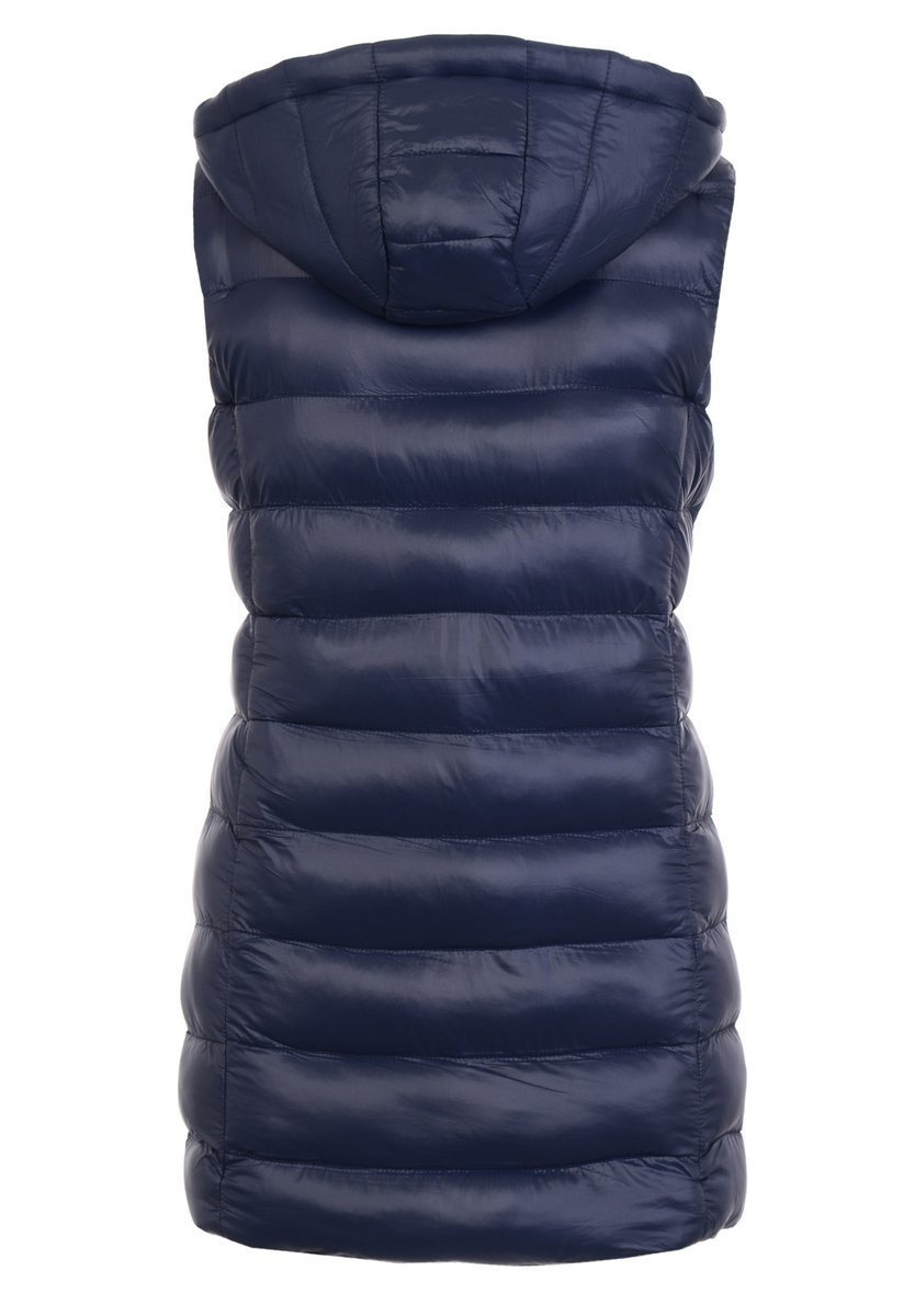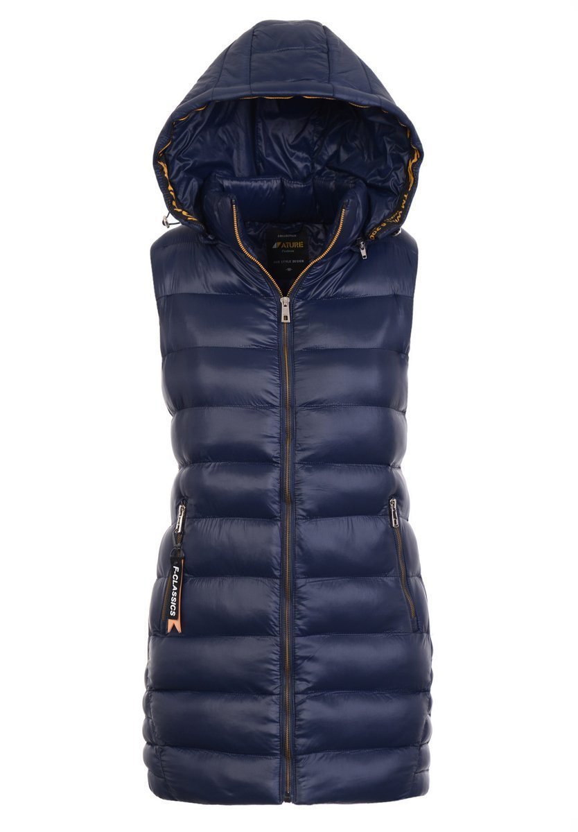 Damski dwustronny bezrękawnik w kolorze granatowym. Bezrękawnik jest delikatnie ocieplony i wykończony w środku podszewką. Wykonany jest z materiałów najwyższej jakości. Bezrękawnik zasuwany jest na suwak. Na dole bezrękawnik ma dwie kieszenie zasuwane na suwaki. Kamizelka posiada odpinany kaptur ze ściągaczem. Kaptur obszyty taśmą z nadrukiem. Bezrękawnik jest delikatnie taliowany dzięki czemu idealnie dopasowuję się do sylwetki. Idealnie sprawdzi się w wielu stylizacjach.
