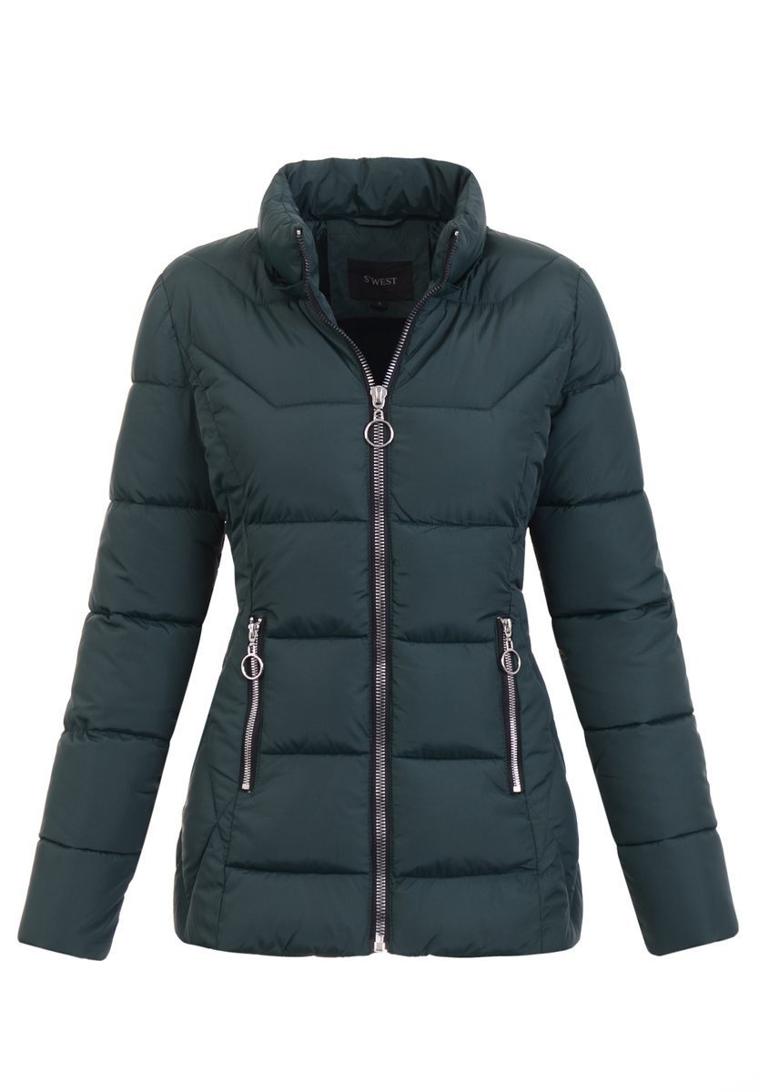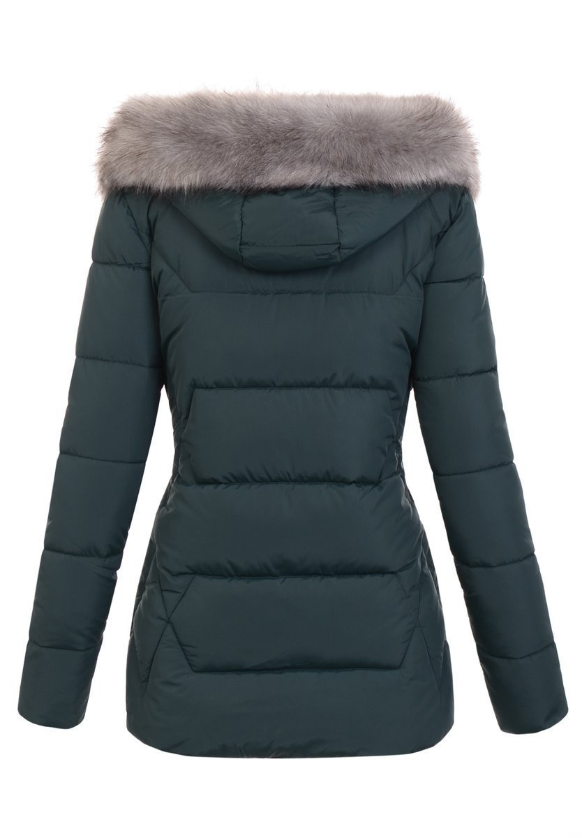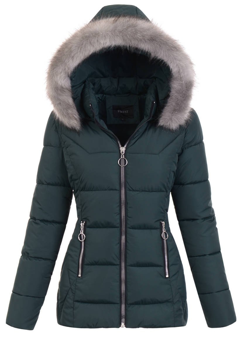 Damska Kurtka Żaneta Zielona to wysokiej jakości kurtka zimowa, która sprawdzi się nawet podczas największych mrozów. Kurtka wypełniona jest zapewniającym termoizolację wypełnieniem syntetycznym, dzięki czemu jest bardzo ciepła, a jednocześnie lekka i wygodna. Dodatkową ochroną przed śniegiem i wiatrem jest kaptur obszyty futerkiem. Jest zapinana na suwak i posiada dwie głębokie, zapinane na zamki kieszenie. Kurtka ma stylowy, zielony kolor. Wyróżnia ją klasyczny krój, ale jest zwężana w talii, dzięki czemu podkreśla sylwetkę.