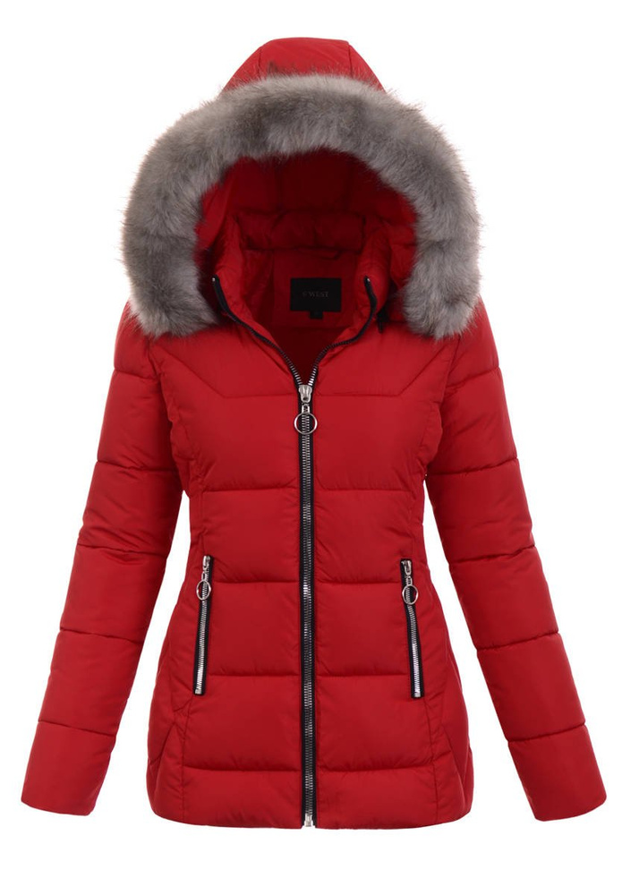 Damska Kurtka Żaneta Czerwona to wysokiej jakości kurtka zimowa, która sprawdzi się nawet podczas największych mrozów. Kurtka wypełniona jest zapewniającym termoizolację wypełnieniem syntetycznym, dzięki czemu jest bardzo ciepła, a jednocześnie lekka i wygodna. Dodatkową ochroną przed śniegiem i wiatrem jest kaptur obszyty futerkiem. Jest zapinana na suwak i posiada dwie głębokie, zapinane na zamki kieszenie. Kurtka ma stylowy, czerwony kolor. Wyróżnia ją klasyczny krój, ale jest zwężana w talii, dzięki czemu podkreśla sylwetkę.
