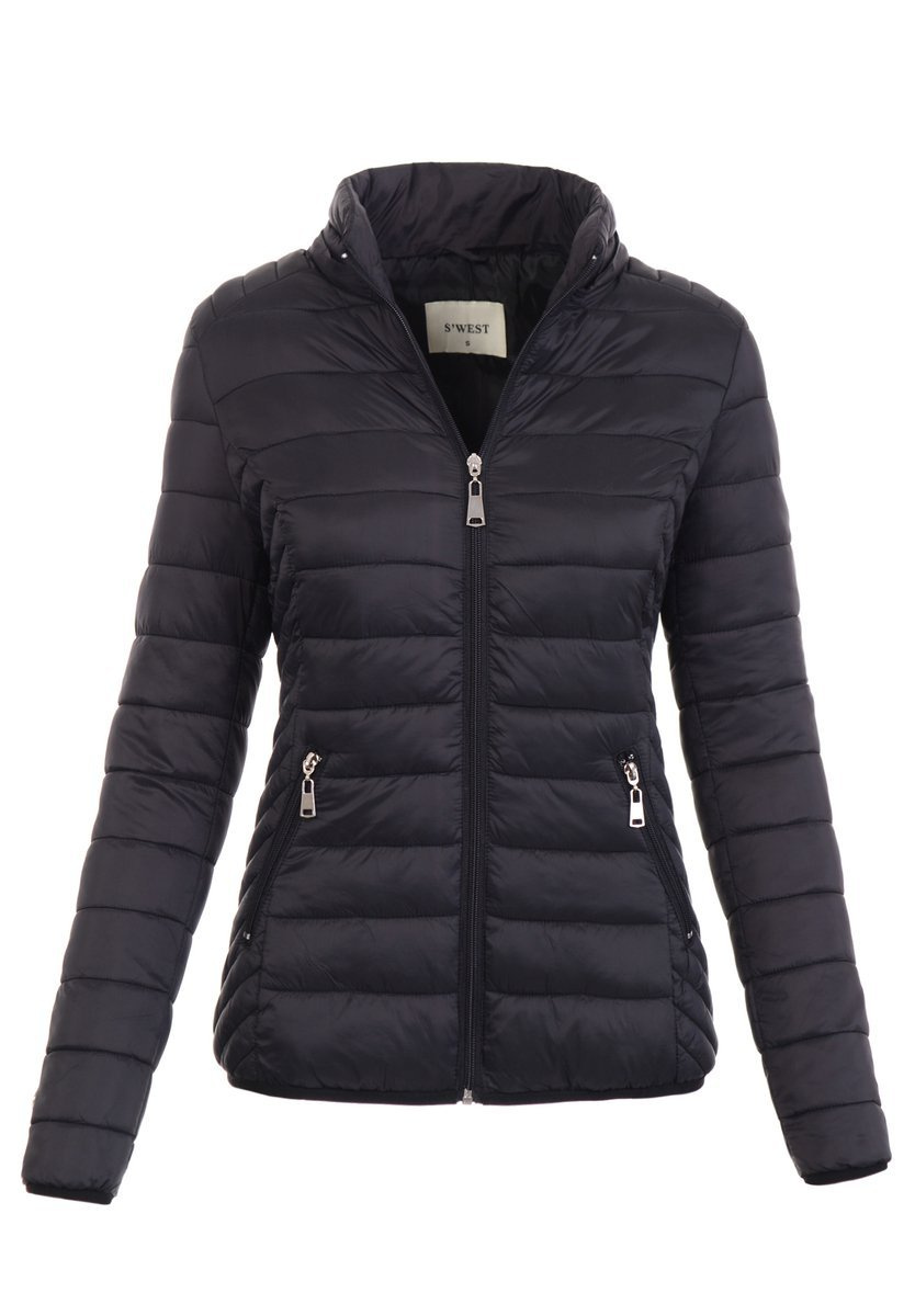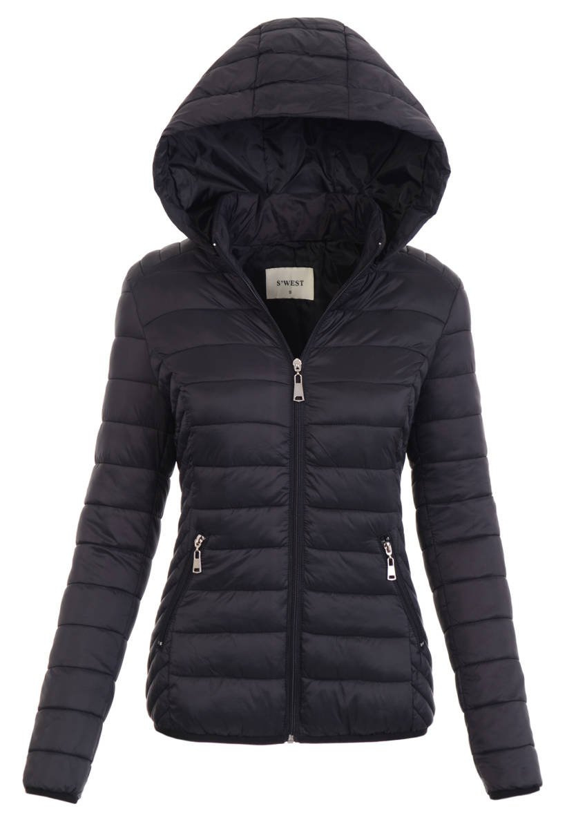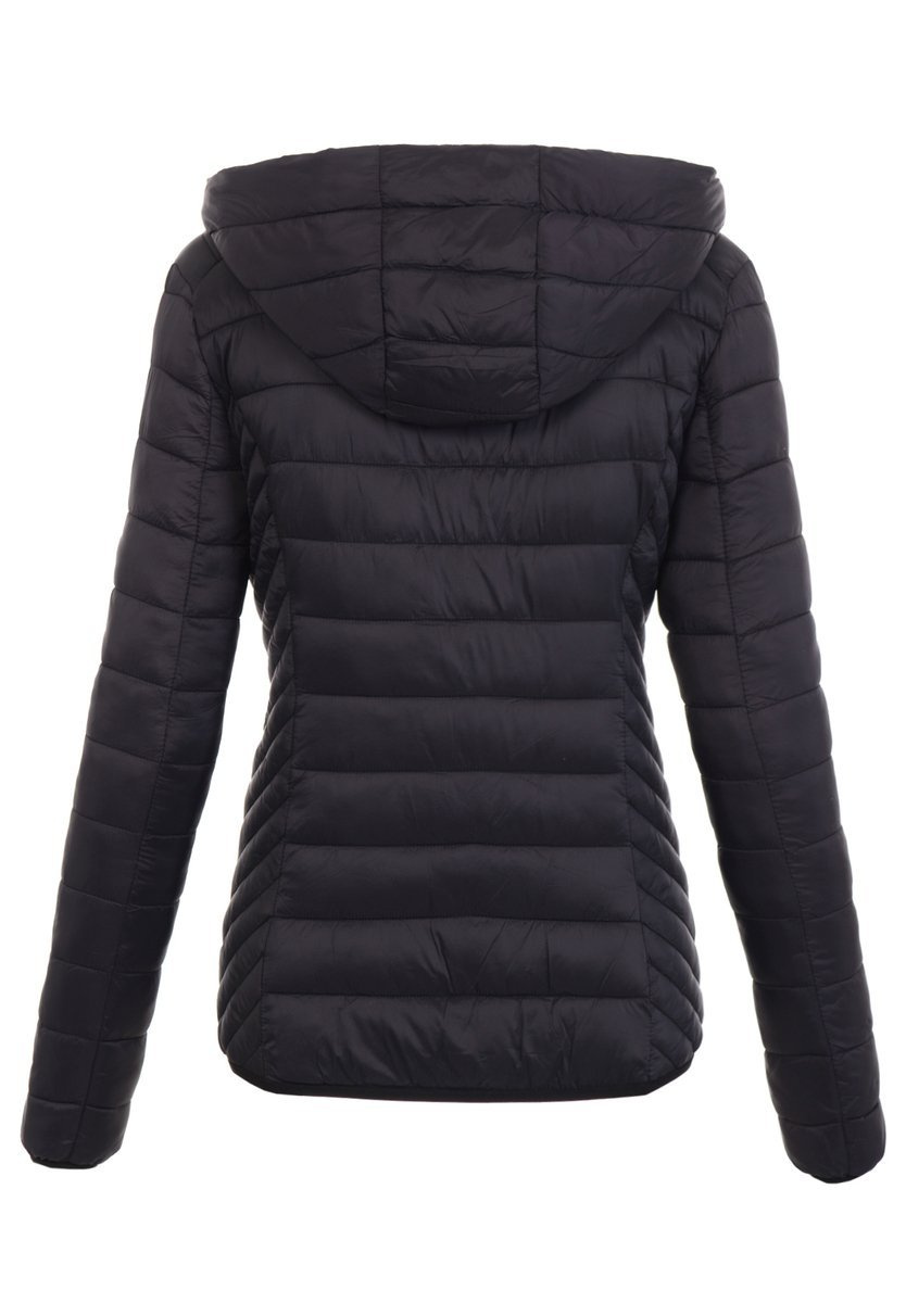 Damska kurtka wykonana z nylonu świetnie sprawdzi się jako nieprzemakalne okrycie wierzchnie zarówno na wiosnę, jak i na jesień. Zapinana jest na prosty zamek błyskawiczny, podobnie jak kieszenie znajdujące się po bokach. Czarna kurtka wiosenno-jesienna damska ma ściągacz na dole, dzięki czemu doskonale podkreśla kobiece kształty. Kurtka jest pikowana, ma ściągacze na końcu rękawów i odpinany kaptur. Ukośnie wszyte kieszenie dodatkowo wyszczuplają sylwetkę. Połączenie czarnego materiału ze srebrnymi zamkami podkreśla elegancki styl. Materiał wierzchni: 100% Nylon.