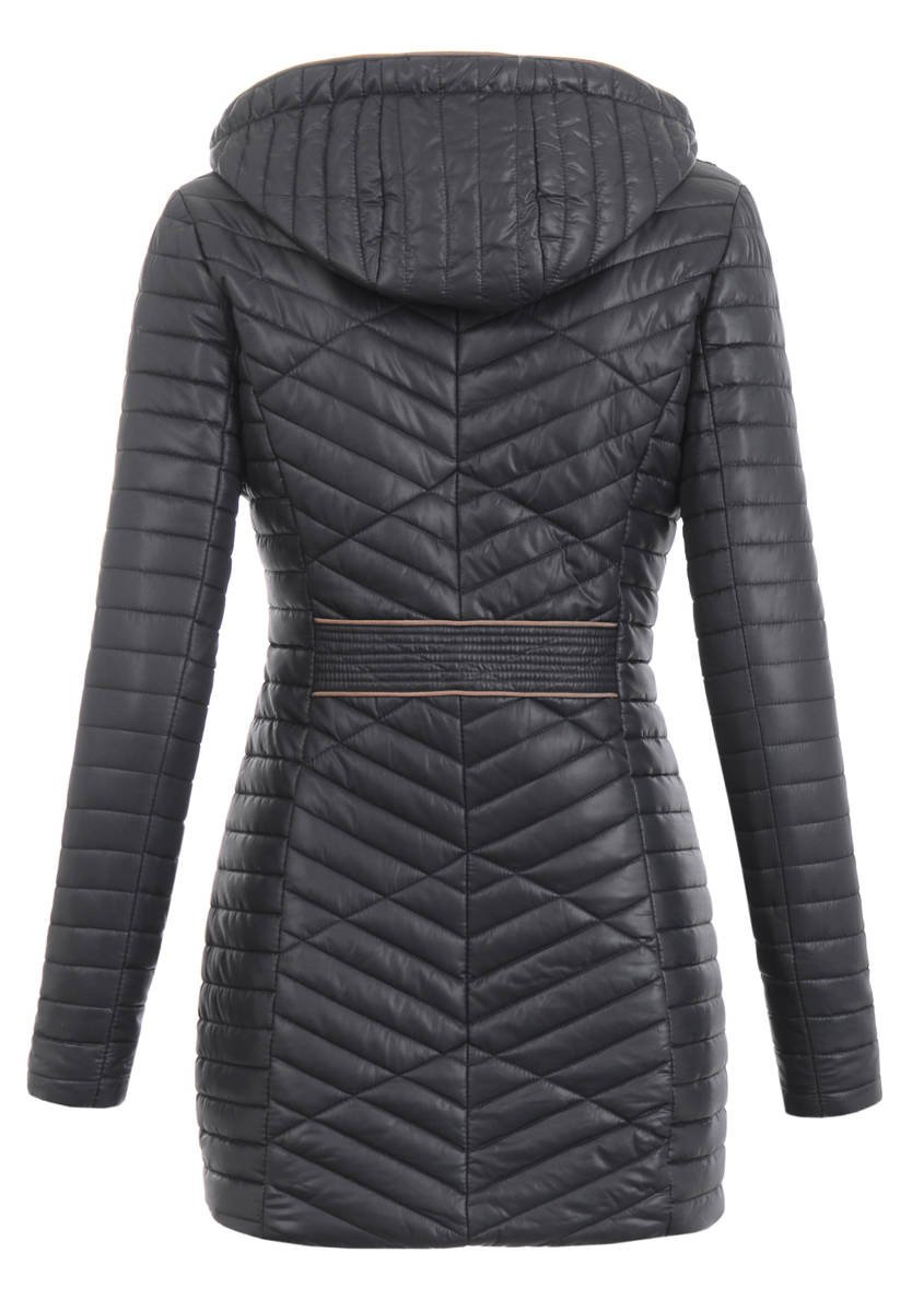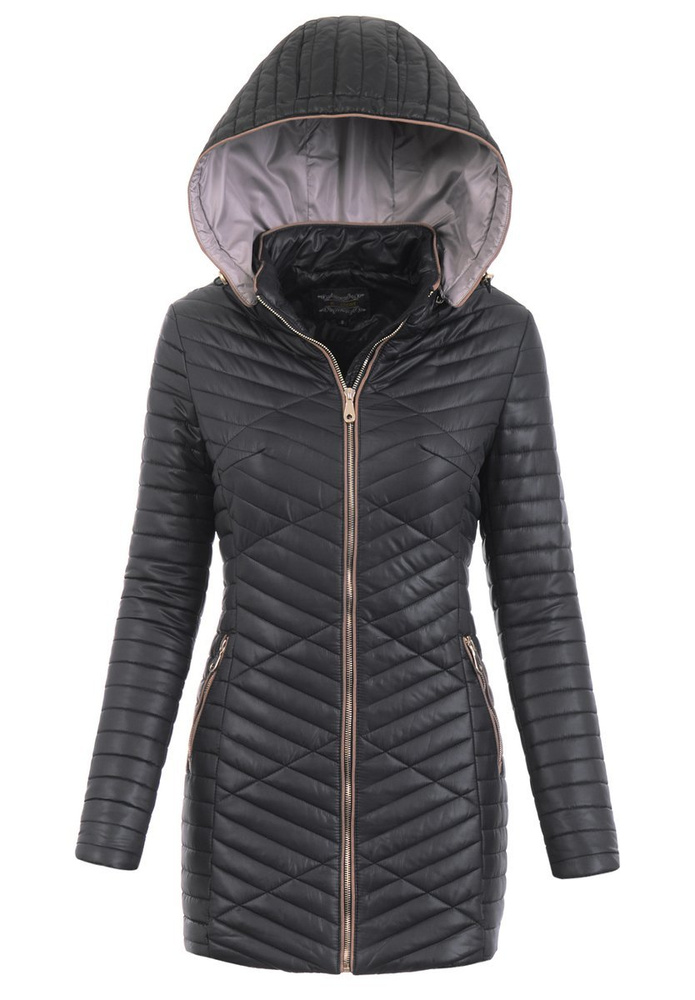 Damska przejściowa wiosenno-jesienna kurtka w kolorze czarnym. Kurtka zasuwana jest na złoty suwak oraz posiada dwie kieszenie zasuwane na suwaki. Oryginalności oraz swoistego uroku dodają kurtce niespotykane przeszycia. Kurtka jest lekko ocieplona i wykończona w środku podszewką. Odpinany kaptur z szarym wypełnieniem oraz ze ściągaczem zapewnia ochronę w deszczowe i chłodne dni. Ortalionowa kurteczka idealnie sprawdzi do wielu wiosennych i jesiennych stylizacji oraz jako przejściowa kurtka na wiosnę i jesień. Doskonale sprawdzi się także na chłodne letnie wieczory. Kurtka wykonana z materiałów najwyższej jakości. Materiał wierzchni: 100% Poliester.